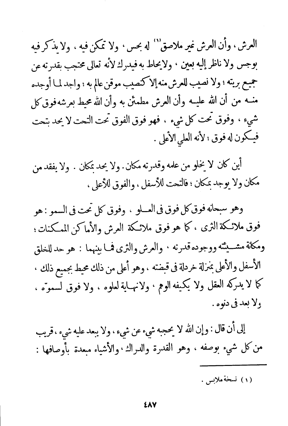 مِنْ الْعَرْشِ وَأَنَّ الْعَرْشَ غَيْرُ مُلَاصِقٍ لَهُ بِحِسِّ وَلَا تَمَكَّنَ فِيهِ وَلَا يُذْكَرُ فِيهِ بِوَجْسِ وَلَا نَاظِرَ إلَيْهِ بِعَيْنِ وَلَا يُحَاطُ بِهِ فَيُدْرَكُ لِأَنَّهُ تَعَالَى مُحْتَجِبٌ بِقُدْرَتِهِ عَنْ جَمِيعِ بَرِيَّتِهِ؛ وَلَا نَصِيبَ لِلْعَرْشِ مِنْهُ إلَّا كَنَصِيبِ مُوقِنٍ عَالِمٍ بِهِ؛ وَاجِدٍ لِمَا أَوْجَدَهُ مِنْهُ مِنْ أَنَّ اللَّهَ عَلَيْهِ وَأَنَّ الْعَرْشَ مُطْمَئِنٌّ بِهِ وَأَنَّ اللَّهَ مُحِيطٌ بِعَرْشِهِ فَوْقَ كُلِّ شَيْءٍ وَفَوْقَ تَحْتَ كُلِّ شَيْءٍ فَهُوَ فَوْقَ الْفَوْقِ تَحْتَ التَّحْتِ لَا يُحَدُّ بتحت فَيَكُونُ لَهُ فَوْقُ؛ لِأَنَّهُ الْعَلِيُّ الْأَعْلَى. أَيْنَ كَانَ لَا يَخْلُو مِنْ عِلْمِهِ وَقُدْرَتِهِ مَكَانٌ. وَلَا يُحَدُّ بِمَكَانِ. وَلَا يُفْقَدُ مِنْ مَكَانٍ وَلَا يُوجَدُ بِمَكَانِ؛ فَالتَّحْتُ لِلْأَسْفَلِ وَالْفَوْقُ لِلْأَعْلَى وَهُوَ سُبْحَانَهُ فَوْقَ كُلِّ فَوْقٍ فِي الْعُلُوِّ وَفَوْقَ كُلِّ تَحْتٍ فِي السُّمُوِّ: هُوَ فَوْقَ مَلَائِكَةِ الثَّرَى كَمَا هُوَ فَوْقَ مَلَائِكَةِ الْعَرْشِ وَالْأَمَاكِنِ الْمُمْكِنَاتِ؛ وَمَكَانُهُ مَشِيئَتُهُ وَوُجُودُهُ قُدْرَتُهُ وَالْعَرْشُ وَالثَّرَى فَمَا بَيْنَهُمَا: هُوَ حَدٌّ لِلْخَلْقِ الْأَسْفَلِ وَالْأَعْلَى بِمَنْزِلَةِ خَرْدَلَةٍ فِي قَبْضَتِهِ وَهُوَ أَعْلَى مِنْ ذَلِكَ مُحِيطٌ بِجَمِيعِ ذَلِكَ كَمَا لَا يُدْرِكُهُ الْعَقْلُ وَلَا يُكَيِّفُهُ الْوَهْمُ وَلَا نِهَايَةَ لِعُلُوِّهِ وَلَا فَوْقَ لِسُمُوِّهِ وَلَا بَعْدَ فِي دُنُوِّهِ. إلَى أَنْ قَالَ: وَإِنَّ اللَّهَ لَا يَحْجُبُهُ شَيْءٌ عَنْ شَيْءٍ وَلَا يَبْعُدُ عَلَيْهِ شَيْءٌ قَرِيبٌ مِنْ كُلِّ شَيْءٍ بِوَصْفِهِ وَهُوَ الْقُدْرَةُ وَالدِّرَاكُ وَالْأَشْيَاءُ مُبْعَدَةٌ بِأَوْصَافِهَا: