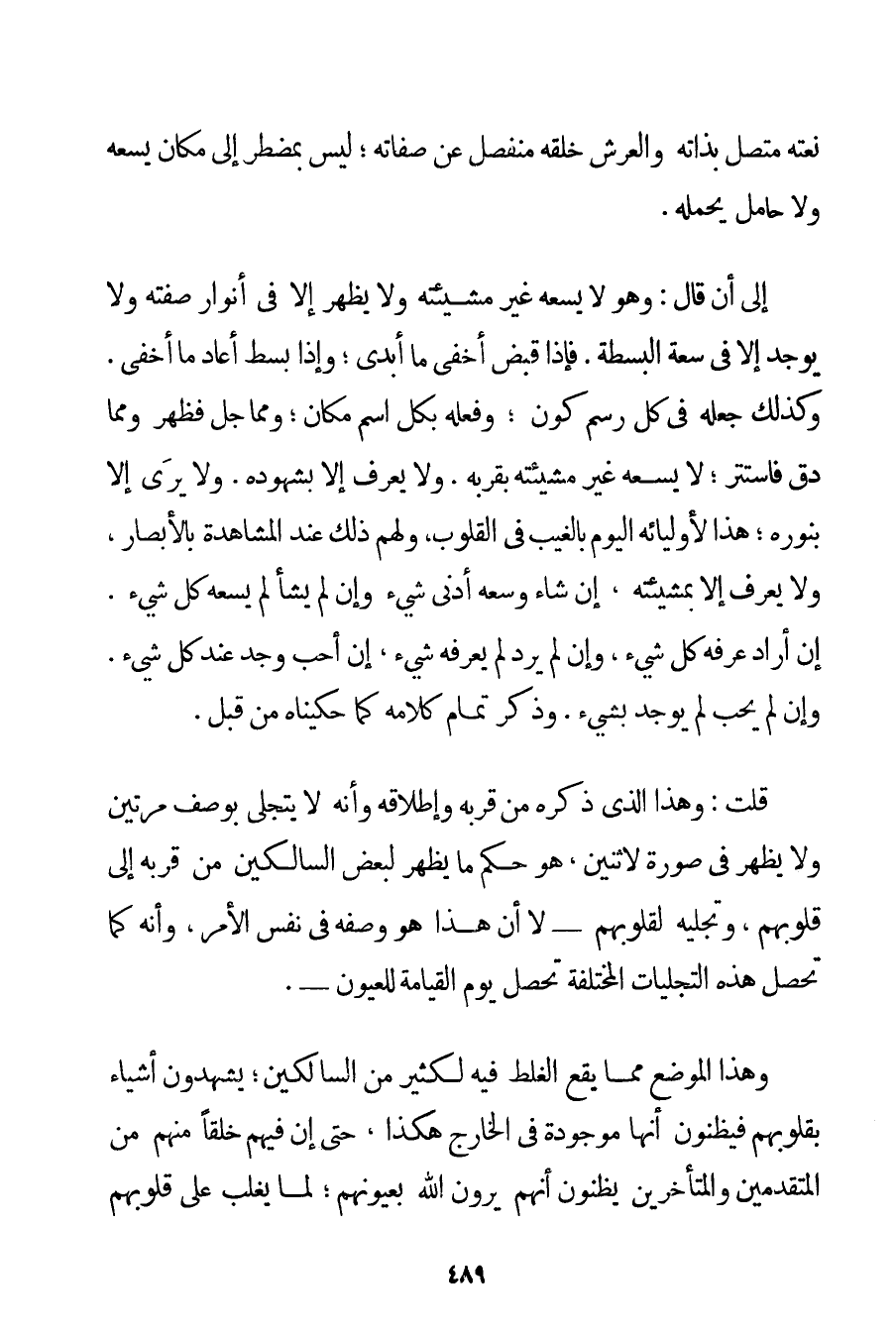 نَعْتُهُ مُتَّصِلٌ بِذَاتِهِ وَالْعَرْشُ خَلْقُهُ مُنْفَصِلٌ عَنْ صِفَاتِهِ؛ لَيْسَ بِمُضْطَرِّ إلَى مَكَانٍ يَسَعُهُ وَلَا حَامِلٍ يَحْمِلُهُ. إلَى أَنْ قَالَ: وَهُوَ لَا يَسَعُهُ غَيْرُ مَشِيئَتِهِ وَلَا يَظْهَرُ إلَّا فِي أَنْوَارِ صِفَتِهِ وَلَا يُوجَدُ إلَّا فِي سِعَةِ الْبَسْطَةِ. فَإِذَا قَبَضَ أَخْفَى مَا أَبْدَى؛ وَإِذَا بَسَطَ أَعَادَ مَا أَخْفَى. وَكَذَلِكَ جَعْلُهُ فِي كُلِّ رَسْمٍ كَوْنٌ؛ وَفِعْلُهُ بِكُلِّ اسْمٍ مَكَانٌ؛ وَمِمَّا جَلَّ فَظَهَرَ وَمِمَّا دَقَّ فَاسْتَتَرَ. لَا يَسَعُهُ غَيْرُ مَشِيئَتِهِ بِقُرْبِهِ. وَلَا يُعْرَفُ إلَّا بِشُهُودِهِ. وَلَا يُرَى إلَّا بِنُورِهِ؛ هَذَا لِأَوْلِيَائِهِ الْيَوْمَ بِالْغَيْبِ فِي الْقُلُوبِ وَلَهُمْ ذَلِكَ عِنْدَ الْمُشَاهَدَةِ بِالْأَبْصَارِ وَلَا يُعْرَفُ إلَّا بِمَشِيئَتِهِ إنْ شَاءَ وَسِعَهُ أَدْنَى شَيْءٍ وَإِنْ لَمْ يَشَأْ لَمْ يَسَعْهُ كُلُّ شَيْءٍ. إنْ أَرَادَ عَرَفَهُ كُلُّ شَيْءٍ وَإِنْ لَمْ يُرِدْ لَمْ يَعْرِفْهُ شَيْءٌ إنْ أَحَبَّ وُجِدَ عِنْدَ كُلِّ شَيْءٍ. وَإِنْ لَمْ يُحِبَّ لَمْ يُوجَدْ بِشَيْءِ. وَذَكَرَ تَمَامَ كَلَامِهِ كَمَا حَكَيْنَاهُ مِنْ قَبْلُ. قُلْت: وَهَذَا الَّذِي ذَكَرَهُ مِنْ قُرْبِهِ وَإِطْلَاقِهِ وَأَنَّهُ لَا يَتَجَلَّى بِوَصْفِ مَرَّتَيْنِ وَلَا يَظْهَرُ فِي صُورَةٍ لِاثْنَيْنِ هُوَ حُكْمُ مَا يَظْهَرُ لِبَعْضِ السَّالِكِينَ مِنْ قُرْبِهِ إلَى قُلُوبِهِمْ وَتَجَلِّيهِ لِقُلُوبِهِمْ - لَا أَنَّ هَذَا هُوَ وَصْفُهُ فِي نَفْسِ الْأَمْرِ وَأَنَّهُ كَمَا تَحْصُلُ هَذِهِ التَّجَلِّيَاتُ الْمُخْتَلِفَةُ تَحْصُلُ يَوْمَ الْقِيَامَةِ لِلْعُيُونِ -. وَهَذَا الْمَوْضِعُ مِمَّا يَقَعُ الْغَلَطُ فِيهِ لِكَثِيرِ مِنْ السَّالِكِينَ؛ يَشْهَدُونَ أَشْيَاءَ بِقُلُوبِهِمْ فَيَظُنُّونَ أَنَّهَا مَوْجُودَةٌ فِي الْخَارِجِ هَكَذَا حَتَّى إنَّ فِيهِمْ خَلْقًا مِنْهُمْ مِنْ الْمُتَقَدِّمِينَ والمتأخرين يَظُنُّونَ أَنَّهُمْ يَرَوْنَ اللَّهَ بِعُيُونِهِمْ؛ لِمَا يَغْلِبُ عَلَى قُلُوبِهِمْ