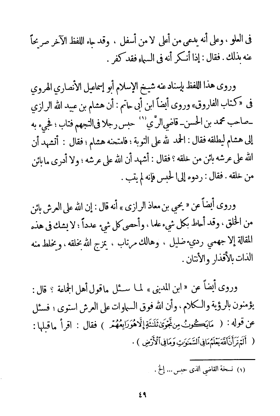 فِي الْعُلُوِّ وَعَلَى أَنَّهُ يُدْعَى مِنْ أَعْلَى لَا مِنْ أَسْفَلُ وَقَدْ جَاءَ اللَّفْظُ الْآخَرُ صَرِيحًا عَنْهُ بِذَلِكَ. فَقَالَ: إذَا أَنْكَرَ أَنَّهُ فِي السَّمَاءِ فَقَدْ كَفَرَ. وَرَوَى هَذَا اللَّفْظَ بِإِسْنَادِ عَنْهُ شَيْخُ الْإِسْلَامِ أَبُو إسْمَاعِيلَ الْأَنْصَارِيُّ الهروي فِي " كِتَابِ الْفَارُوقِ " وَرَوَى أَيْضًا ابْنُ أَبِي حَاتِمٍ: أَنَّ هِشَامَ بْنَ عُبَيْدِ اللَّهِ الرَّازِي - صَاحِبَ مُحَمَّدِ بْنِ الْحَسَنِ - قَاضِي الرَّيِّ حَبَسَ رَجُلًا فِي التَّجَهُّمِ فَتَابَ؛ فَجِيءَ بِهِ إلَى هِشَامٍ لِيُطْلِقَهُ فَقَالَ: الْحَمْدُ اللَّهِ عَلَى التَّوْبَةِ؛ فَامْتَحَنَهُ هِشَامٌ؛ فَقَالَ: أَتَشْهَدُ أَنَّ اللَّهَ عَلَى عَرْشِهِ بَائِنٌ مِنْ خَلْقِهِ؟ فَقَالَ: أَشْهَدُ أَنَّ اللَّهَ عَلَى عَرْشِهِ؛ وَلَا أَدْرِي مَا بَائِنٌ مِنْ خَلْقِهِ. فَقَالَ: رُدُّوهُ إلَى الْحَبْسِ فَإِنَّهُ لَمْ يَتُبْ. وَرُوِيَ أَيْضًا عَنْ يَحْيَى بْنِ مُعَاذٍ الرَّازِي " أَنَّهُ قَالَ: إنَّ اللَّهَ عَلَى الْعَرْشِ بَائِنٌ مِنْ الْخَلْقِ وَقَدْ أَحَاطَ بِكُلِّ شَيْءٍ عِلْمًا وَأَحْصَى كُلَّ شَيْءٍ عَدَدًا؛ لَا يَشُكُّ فِي هَذِهِ الْمَقَالَةِ إلَّا جهمي رَدِيءٌ ضِلِّيلٌ وَهَالِكٌ مُرْتَابٌ يَمْزُجُ اللَّهَ بِخَلْقِهِ وَيَخْلِطُ مِنْهُ الذَّاتَ بِالْأَقْذَارِ والأنتان. وَرُوِيَ أَيْضًا عَنْ ابْنِ الْمَدِينِيِّ لَمَّا سُئِلَ مَا قَوْلُ أَهْلِ الْجَمَاعَةِ؟ قَالَ: يُؤْمِنُونَ بِالرُّؤْيَةِ وَالْكَلَامِ وَأَنَّ اللَّهَ فَوْقَ السَّمَوَاتِ عَلَى الْعَرْشِ اسْتَوَى؛ فَسُئِلَ عَنْ قَوْلِهِ: {مَا يَكُونُ مِنْ نَجْوَى ثَلَاثَةٍ إلَّا هُوَ رَابِعُهُمْ} فَقَالَ: اقْرَأْ مَا قَبْلَهَا: {أَلَمْ تَرَ أَنَّ اللَّهَ يَعْلَمُ مَا فِي السَّمَاوَاتِ وَمَا فِي الْأَرْضِ} .