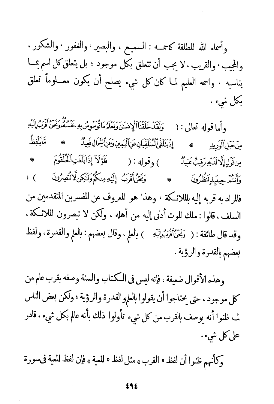 وَأَسْمَاءُ اللَّهِ الْمُطْلَقَةُ كَاسْمِهِ: السَّمِيعِ وَالْبَصِيرِ وَالْغَفُورِ وَالشَّكُورِ وَالْمُجِيبِ وَالْقَرِيبِ لَا يَجِبُ أَنْ تَتَعَلَّقَ بِكُلِّ مَوْجُودٍ؛ بَلْ يَتَعَلَّقُ كُلُّ اسْمٍ بِمَا يُنَاسِبُهُ وَاسْمُهُ الْعَلِيمُ لَمَّا كَانَ كُلُّ شَيْءٍ يَصْلُحُ أَنْ يَكُونَ مَعْلُومًا تَعَلَّقَ بِكُلِّ شَيْءٍ. وَأَمَّا قَوْله تَعَالَى {وَلَقَدْ خَلَقْنَا الْإِنْسَانَ وَنَعْلَمُ مَا تُوَسْوِسُ بِهِ نَفْسُهُ وَنَحْنُ أَقْرَبُ إلَيْهِ مِنْ حَبْلِ الْوَرِيدِ} {إذْ يَتَلَقَّى الْمُتَلَقِّيَانِ عَنِ الْيَمِينِ وَعَنِ الشِّمَالِ قَعِيدٌ} {مَا يَلْفِظُ مِنْ قَوْلٍ إلَّا لَدَيْهِ رَقِيبٌ عَتِيدٌ} وَقَوْلُهُ: {فَلَوْلَا إذَا بَلَغَتِ الْحُلْقُومَ} {وَأَنْتُمْ حِينَئِذٍ تَنْظُرُونَ} {وَنَحْنُ أَقْرَبُ إلَيْهِ مِنْكُمْ وَلَكِنْ لَا تُبْصِرُونَ} فَالْمُرَادُ بِهِ قُرْبُهُ إلَيْهِ بِالْمَلَائِكَةِ وَهَذَا هُوَ الْمَعْرُوفُ عَنْ الْمُفَسِّرِينَ الْمُتَقَدِّمِينَ مِنْ السَّلَفِ قَالُوا: مَلَكُ الْمَوْتِ أَدْنَى إلَيْهِ مِنْ أَهْلِهِ وَلَكِنْ لَا تُبْصِرُونَ الْمَلَائِكَةَ وَقَدْ قَالَ طَائِفَةٌ: {وَنَحْنُ أَقْرَبُ إلَيْهِ} بِالْعِلْمِ وَقَالَ بَعْضُهُمْ: بِالْعِلْمِ وَالْقُدْرَةِ وَلَفْظُ بَعْضِهِمْ بِالْقُدْرَةِ وَالرُّؤْيَةِ. وَهَذِهِ الْأَقْوَالُ ضَعِيفَةٌ فَإِنَّهُ لَيْسَ فِي الْكِتَابِ وَالسُّنَّةِ وَصْفُهُ بِقُرْبِ عَامٍّ مِنْ كُلِّ مَوْجُودٍ حَتَّى يَحْتَاجُوا أَنْ يَقُولُوا بِالْعِلْمِ وَالْقُدْرَةِ وَالرُّؤْيَةِ؛ وَلَكِنَّ بَعْضَ النَّاسِ لَمَّا ظَنُّوا أَنَّهُ يُوصَفُ بِالْقُرْبِ مِنْ كُلِّ شَيْءٍ تَأَوَّلُوا ذَلِكَ بِأَنَّهُ عَالِمٌ بِكُلِّ شَيْءٍ قَادِرٌ عَلَى كُلِّ شَيْءٍ. وَكَأَنَّهُمْ ظَنُّوا أَنَّ لَفْظَ " الْقُرْبِ " مِثْلُ لَفْظِ " الْمَعِيَّةِ " فَإِنَّ لَفْظَ الْمَعِيَّةِ فِي سُورَةِ
