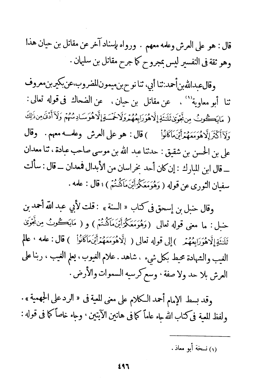 قَالَ: هُوَ عَلَى الْعَرْشِ وَعِلْمُهُ مَعَهُمْ. وَرَوَاهُ بِإِسْنَادِ آخَرَ عَنْ مُقَاتِلِ بْنِ حَيَّانَ هَذَا وَهُوَ ثِقَةٌ فِي التَّفْسِيرِ لَيْسَ بِمَجْرُوحِ كَمَا جُرِحَ مُقَاتِلُ بْنُ سُلَيْمَانَ. وَقَالَ عَبْدُ اللَّهِ بْنُ أَحْمَد: ثَنَا أَبِي ثَنَا نُوحُ بْنُ مَيْمُونٍ الْمَضْرُوبُ عَنْ بكير بْنِ مَعْرُوفٍ ثَنَا أَبُو مُعَاوِيَةَ عَنْ مُقَاتِلِ بْنِ حَيَّانَ عَنْ الضَّحَّاكِ فِي قَوْله تَعَالَى {مَا يَكُونُ مِنْ نَجْوَى ثَلَاثَةٍ إلَّا هُوَ رَابِعُهُمْ وَلَا خَمْسَةٍ إلَّا هُوَ سَادِسُهُمْ وَلَا أَدْنَى مِنْ ذَلِكَ وَلَا أَكْثَرَ إلَّا هُوَ مَعَهُمْ أَيْنَ مَا كَانُوا} قَالَ: هُوَ عَلَى الْعَرْشِ وَعِلْمُهُ مَعَهُمْ. وَقَالَ عَلِيُّ بْنُ الْحَسَنِ بْنِ شَقِيقٍ: حَدَّثَنَا عَبْدُ اللَّهِ بْنُ مُوسَى صَاحِبُ عبادة ثَنَا معدان - قَالَ ابْنُ الْمُبَارَكِ: إنْ كَانَ أَحَدٌ بِخُرَاسَانَ مِنْ الْأَبْدَالِ فمعدان - قَالَ: سَأَلْت سُفْيَانَ الثَّوْرِيَّ عَنْ قَوْلِهِ {وَهُوَ مَعَكُمْ أَيْنَ مَا كُنْتُمْ} قَالَ: عِلْمُهُ. وَقَالَ حَنْبَلُ بْنُ إسْحَاقَ فِي كِتَابِ " السُّنَّةِ ": قُلْت لِأَبِي عَبْدِ اللَّهِ أَحْمَد بْنِ حَنْبَلٍ: مَا مَعْنَى قَوْله تَعَالَى {وَهُوَ مَعَكُمْ أَيْنَ مَا كُنْتُمْ} و {مَا يَكُونُ مِنْ نَجْوَى ثَلَاثَةٍ إلَّا هُوَ رَابِعُهُمْ} إلَى قَوْله تَعَالَى {إلَّا هُوَ مَعَهُمْ أَيْنَ مَا كَانُوا} قَالَ: عِلْمُهُ عَالِمُ الْغَيْبِ وَالشَّهَادَةِ مُحِيطٌ بِكُلِّ شَيْءٍ شَاهِدٌ. عَلَّامُ الْغُيُوبِ يَعْلَمُ الْغَيْبَ رَبُّنَا عَلَى الْعَرْشِ بِلَا حَدٍّ وَلَا صِفَةٍ وَسِعَ كُرْسِيُّهُ السَّمَوَاتِ وَالْأَرْضَ. وَقَدْ بَسَطَ الْإِمَامُ أَحْمَد الْكَلَامَ عَلَى مَعْنَى الْمَعِيَّةِ فِي " الرَّدِّ عَلَى الْجَهْمِيَّة ". وَلَفْظُ الْمَعِيَّةِ فِي كِتَابِ اللَّهِ جَاءَ عَامًّا كَمَا فِي هَاتَيْنِ الْآيَتَيْنِ وَجَاءَ خَاصًّا كَمَا فِي قَوْلِهِ: