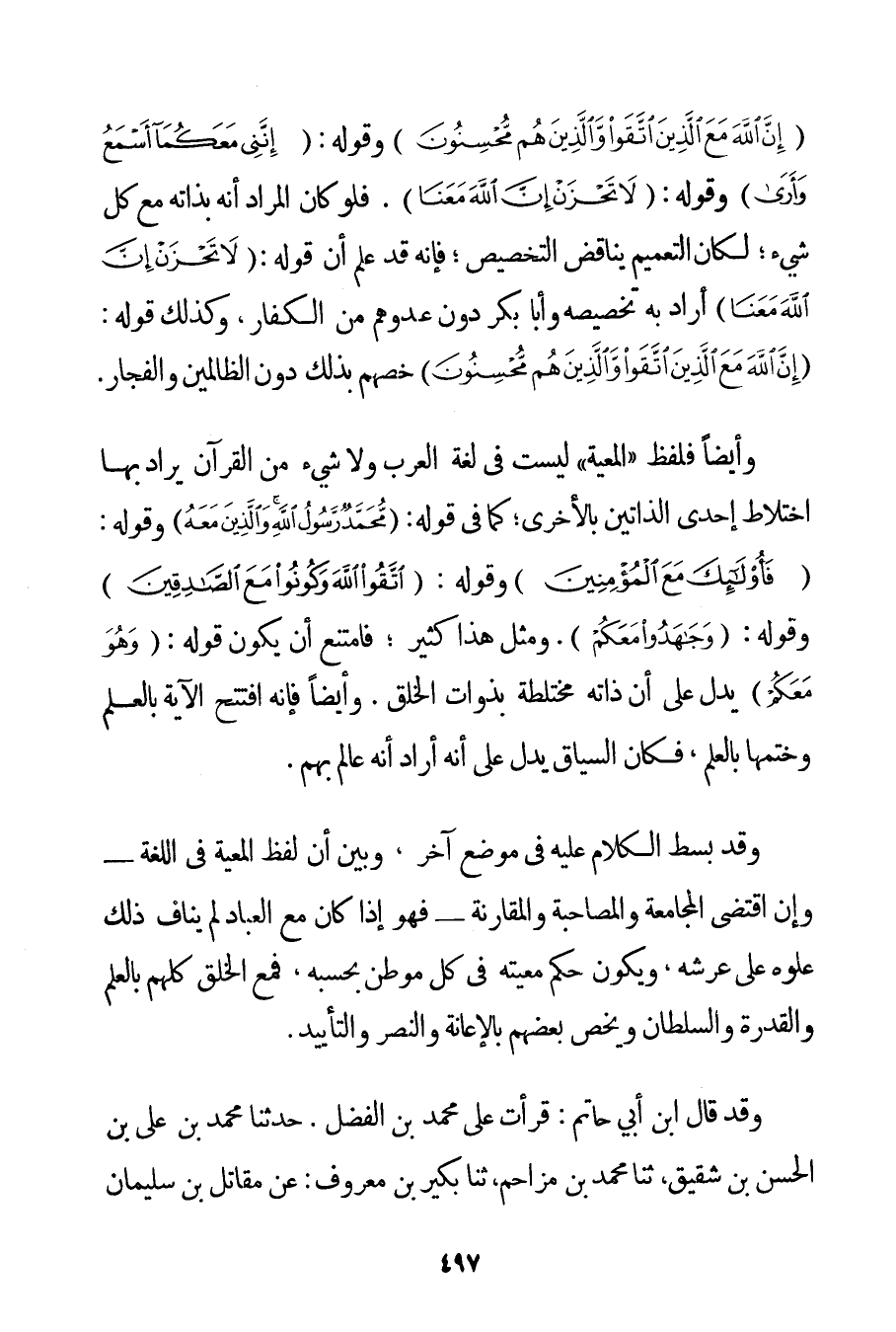{إنَّ اللَّهَ مَعَ الَّذِينَ اتَّقَوْا وَالَّذِينَ هُمْ مُحْسِنُونَ} وَقَوْلِهِ: {إنَّنِي مَعَكُمَا أَسْمَعُ وَأَرَى} وَقَوْلِهِ: {لَا تَحْزَنْ إنَّ اللَّهَ مَعَنَا} . فَلَوْ كَانَ الْمُرَادُ أَنَّهُ بِذَاتِهِ مَعَ كُلِّ شَيْءٍ؛ لَكَانَ التَّعْمِيمُ يُنَاقِضُ التَّخْصِيصَ؛ فَإِنَّهُ قَدْ عَلِمَ أَنَّ قَوْلَهُ: {لَا تَحْزَنْ إنَّ اللَّهَ مَعَنَا} أَرَادَ بِهِ تَخْصِيصَهُ وَأَبَا بَكْرٍ دُونَ عَدُوِّهِمْ مِنْ الْكُفَّارِ وَكَذَلِكَ قَوْلُهُ: {إنَّ اللَّهَ مَعَ الَّذِينَ اتَّقَوْا وَالَّذِينَ هُمْ مُحْسِنُونَ} خَصَّهُمْ بِذَلِكَ دُونَ الظَّالِمِينَ وَالْفُجَّارِ. وَأَيْضًا فَلَفْظُ " الْمَعِيَّةِ " لَيْسَتْ فِي لُغَةِ الْعَرَبِ وَلَا شَيْءَ مِنْ الْقُرْآنِ يُرَادُ بِهَا اخْتِلَاطُ إحْدَى الذَّاتَيْنِ بِالْأُخْرَى؛ كَمَا فِي قَوْلِهِ: {مُحَمَّدٌ رَسُولُ اللَّهِ وَالَّذِينَ مَعَهُ} وَقَوْلِهِ: {فَأُولَئِكَ مَعَ الْمُؤْمِنِينَ} وَقَوْلِهِ: {اتَّقُوا اللَّهَ وَكُونُوا مَعَ الصَّادِقِينَ} وَقَوْلِهِ: {وَجَاهَدُوا مَعَكُمْ} . وَمِثْلُ هَذَا كَثِيرٌ؛ فَامْتَنَعَ أَنْ يَكُونَ قَوْلُهُ: {وَهُوَ مَعَكُمْ} يَدُلُّ عَلَى أَنَّ ذَاتَه مُخْتَلِطَةٌ بِذَوَاتِ الْخَلْقِ. وَأَيْضًا فَإِنَّهُ افْتَتَحَ الْآيَةَ بِالْعِلْمِ وَخَتَمَهَا بِالْعِلْمِ فَكَانَ السِّيَاقُ يَدُلُّ عَلَى أَنَّهُ أَرَادَ أَنَّهُ عَالِمٌ بِهِمْ. وَقَدْ بُسِطَ الْكَلَامُ عَلَيْهِ فِي مَوْضِعٍ آخَرَ وَبَيَّنَ أَنَّ لَفْظَ الْمَعِيَّةِ فِي اللُّغَةِ - وَإِنْ اقْتَضَى الْمُجَامَعَةَ وَالْمُصَاحَبَةَ وَالْمُقَارَنَةَ - فَهُوَ إذَا كَانَ مَعَ الْعِبَادِ لَمْ يُنَافِ ذَلِكَ عُلُوَّهُ عَلَى عَرْشِهِ وَيَكُونُ حُكْمُ مَعِيَّتِه فِي كُلِّ مَوْطِنٍ بِحَسَبِهِ فَمَعَ الْخَلْقِ كُلِّهِمْ بِالْعِلْمِ وَالْقُدْرَةِ وَالسُّلْطَانِ وَيَخُصُّ بَعْضَهُمْ بِالْإِعَانَةِ وَالنَّصْرِ وَالتَّأْيِيدِ. وَقَدْ قَالَ ابْنُ أَبِي حَاتِمٍ: قَرَأْت عَلَى مُحَمَّدِ بْنِ الْفَضْلِ. حَدَّثَنَا مُحَمَّدُ بْنُ عَلِيِّ بْنِ الْحَسَنِ بْنِ شَقِيقٍ ثَنَا مُحَمَّدُ بْنُ مُزَاحِمٍ ثَنَا بكير بْنُ مَعْرُوفٍ: عَنْ مُقَاتِلِ بْنِ سُلَيْمَانَ