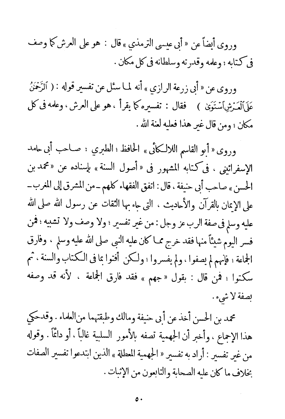 وَرُوِيَ أَيْضًا عَنْ أَبِي عِيسَى التِّرْمِذِيِّ قَالَ: هُوَ عَلَى الْعَرْشِ كَمَا وَصَفَ فِي كِتَابِهِ؛ وَعِلْمُهُ وَقُدْرَتُهُ وَسُلْطَانُهُ فِي كُلِّ مَكَانٍ. وَرُوِيَ عَنْ أَبِي زُرْعَةَ الرَّازِي أَنَّهُ لَمَّا سُئِلَ عَنْ تَفْسِيرِ قَوْلِهِ: {الرَّحْمَنُ عَلَى الْعَرْشِ اسْتَوَى} فَقَالَ: تَفْسِيرُهُ كَمَا يُقْرَأُ هُوَ عَلَى الْعَرْشِ وَعِلْمُهُ فِي كُلِّ مَكَانٍ؛ وَمَنْ قَالَ غَيْرَ هَذَا فَعَلَيْهِ لَعْنَةُ اللَّهِ. وَرَوَى أَبُو الْقَاسِمِ اللالكائي " الْحَافِظُ. الطبري؛ صَاحِبُ أَبِي حَامِدٍ الإسفرائيني فِي كِتَابِهِ الْمَشْهُورِ فِي " أُصُولِ السُّنَّةِ " بِإِسْنَادِهِ عَنْ مُحَمَّدِ بْنِ الْحَسَنِ صَاحِبِ أَبِي حَنِيفَةَ قَالَ: اتَّفَقَ الْفُقَهَاءُ كُلُّهُمْ - مِنْ الْمَشْرِقِ إلَى الْمَغْرِبِ - عَلَى الْإِيمَانِ بِالْقُرْآنِ وَالْأَحَادِيثِ؛ الَّتِي جَاءَ بِهَا الثِّقَاتُ عَنْ رَسُولِ اللَّهِ صَلَّى اللَّهُ عَلَيْهِ وَسَلَّمَ فِي صِفَةِ الرَّبِّ عَزَّ وَجَلَّ: مِنْ غَيْرِ تَفْسِيرٍ؛ وَلَا وَصْفٍ وَلَا تَشْبِيهٍ؛ فَمَنْ فَسَّرَ الْيَوْمَ شَيْئًا مِنْهَا فَقَدْ خَرَجَ مِمَّا كَانَ عَلَيْهِ النَّبِيُّ صَلَّى اللَّهُ عَلَيْهِ وَسَلَّمَ وَفَارَقَ الْجَمَاعَةَ؛ فَإِنَّهُمْ لَمْ يَصِفُوا وَلَمْ يُفَسِّرُوا؛ وَلَكِنْ أَفْتَوْا بِمَا فِي الْكِتَابِ وَالسُّنَّةِ ثُمَّ سَكَتُوا؛ فَمَنْ قَالَ: بِقَوْلِ جَهْمٍ فَقَدْ فَارَقَ الْجَمَاعَةَ لِأَنَّهُ قَدْ وَصَفَهُ بِصِفَةِ لَا شَيْءَ. مُحَمَّدُ بْنُ الْحَسَنِ أَخَذَ عَنْ أَبِي حَنِيفَةَ وَمَالِكٍ وَطَبَقَتِهِمَا مِنْ الْعُلَمَاءِ. وَقَدْ حَكَى هَذَا الْإِجْمَاعَ وَأَخْبَرَ أَنَّ الْجَهْمِيَّة تَصِفُهُ بِالْأُمُورِ السَّلْبِيَّةِ غَالِبًا أَوْ دَائِمًا. وَقَوْلُهُ مِنْ غَيْرِ تَفْسِيرٍ: أَرَادَ بِهِ تَفْسِيرَ " الْجَهْمِيَّة الْمُعَطِّلَةِ " الَّذِينَ ابْتَدَعُوا تَفْسِيرَ الصِّفَاتِ بِخِلَافِ مَا كَانَ عَلَيْهِ الصَّحَابَةُ وَالتَّابِعُونَ مِنْ الأثبات.