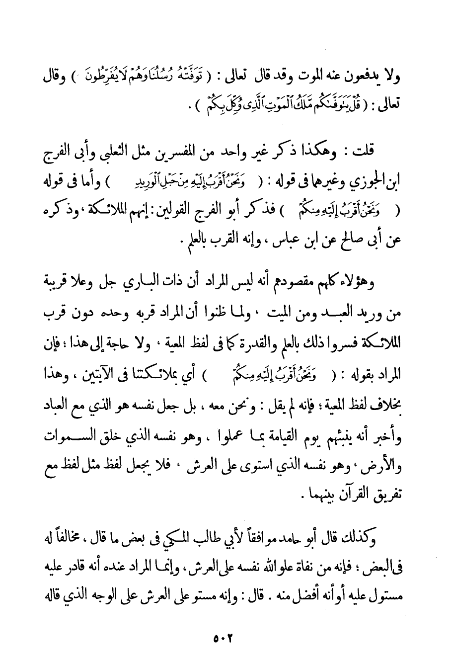 وَلَا يَدْفَعُونَ عَنْهُ الْمَوْتَ وَقَدْ قَالَ تَعَالَى: {تَوَفَّتْهُ رُسُلُنَا وَهُمْ لَا يُفَرِّطُونَ} وَقَالَ تَعَالَى: {قُلْ يَتَوَفَّاكُمْ مَلَكُ الْمَوْتِ الَّذِي وُكِّلَ بِكُمْ} . قُلْت: وَهَكَذَا ذَكَرَ غَيْرُ وَاحِدٍ مِنْ الْمُفَسِّرِينَ مِثْلَ الثَّعْلَبِيِّ وَأَبِي الْفَرَجِ ابْنِ الْجَوْزِيِّ وَغَيْرِهِمَا فِي قَوْلِهِ: {وَنَحْنُ أَقْرَبُ إلَيْهِ مِنْ حَبْلِ الْوَرِيدِ} وَأَمَّا فِي قَوْلِهِ {وَنَحْنُ أَقْرَبُ إلَيْهِ مِنْكُمْ} فَذَكَرَ أَبُو الْفَرَجِ الْقَوْلَيْنِ: إنَّهُمْ الْمَلَائِكَةُ وَذَكَرَهُ عَنْ أَبِي صَالِحٍ عَنْ ابْنِ عَبَّاسٍ وَإِنَّهُ الْقُرْبُ بِالْعِلْمِ. وَهَؤُلَاءِ كُلُّهُمْ مَقْصُودُهُمْ أَنَّهُ لَيْسَ الْمُرَادُ أَنَّ ذَاتَ الْبَارِي جَلَّ وَعَلَا قَرِيبَةٌ مِنْ وَرِيدِ الْعَبْدِ وَمِنْ الْمَيِّتِ وَلَمَّا ظَنُّوا أَنَّ الْمُرَادَ قُرْبُهُ وَحْدَهُ دُونَ قُرْبِ الْمَلَائِكَةِ فَسَّرُوا ذَلِكَ بِالْعِلْمِ وَالْقُدْرَةِ كَمَا فِي لَفْظِ الْمَعِيَّةِ وَلَا حَاجَةَ إلَى هَذَا؛ فَإِنَّ الْمُرَادَ بِقَوْلِهِ: {وَنَحْنُ أَقْرَبُ إلَيْهِ مِنْكُمْ} أَيْ بِمَلَائِكَتِنَا فِي الْآيَتَيْنِ وَهَذَا بِخِلَافِ لَفْظ الْمَعِيَّةِ؛ فَإِنَّهُ لَمْ يَقُلْ: وَنَحْنُ مَعَهُ بَلْ جَعَلَ نَفْسَهُ هُوَ الَّذِي مَعَ الْعِبَادِ وَأَخْبَرَ أَنَّهُ يُنَبِّئُهُمْ يَوْمَ الْقِيَامَةِ بِمَا عَمِلُوا وَهُوَ نَفْسُهُ الَّذِي خَلَقَ السَّمَوَاتِ وَالْأَرْضَ وَهُوَ نَفْسُهُ الَّذِي اسْتَوَى عَلَى الْعَرْشِ فَلَا يُجْعَلُ لَفْظٌ مِثْلَ لَفْظٍ مَعَ تَفْرِيقِ الْقُرْآنِ بَيْنَهُمَا. وَكَذَلِكَ قَالَ أَبُو حَامِدٍ مُوَافِقًا لِأَبِي طَالِبٍ الْمَكِّيِّ فِي بَعْضِ مَا قَالَ مُخَالِفًا لَهُ فِي الْبَعْضِ؛ فَإِنَّهُ مِنْ نفاة عُلُوِّ اللَّهِ نَفْسِهِ عَلَى الْعَرْشِ وَإِنَّمَا الْمُرَادُ عِنْدَهُ أَنَّهُ قَادِرٌ عَلَيْهِ مُسْتَوْلٍ عَلَيْهِ أَوْ أَنَّهُ أَفْضَلُ مِنْهُ. قَالَ: وَإِنَّهُ مُسْتَوٍ عَلَى الْعَرْشِ عَلَى الْوَجْهِ الَّذِي قَالَهُ
