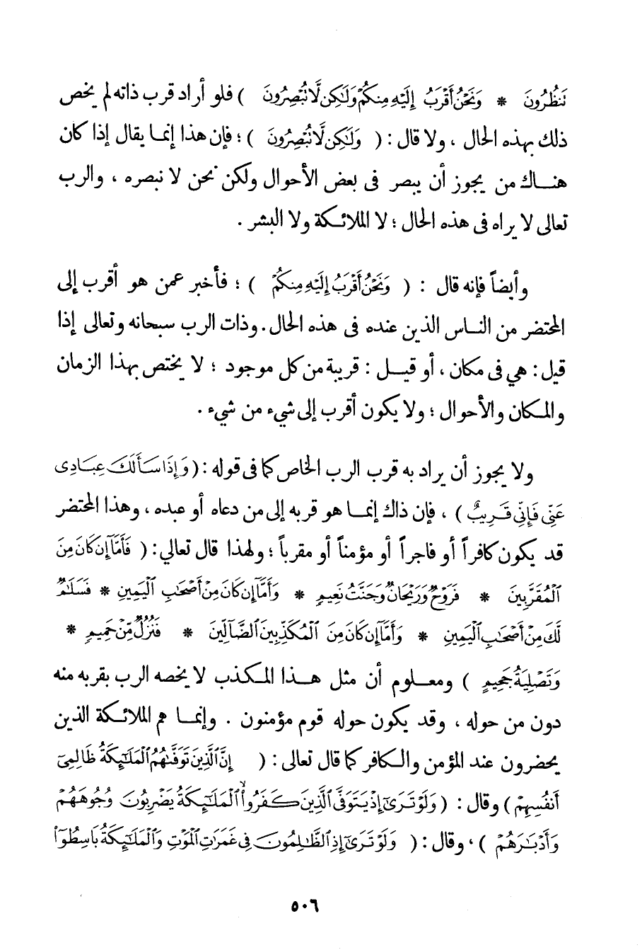 تَنْظُرُونَ} {وَنَحْنُ أَقْرَبُ إلَيْهِ مِنْكُمْ وَلَكِنْ لَا تُبْصِرُونَ} فَلَوْ أَرَادَ قُرْبَ ذَاتِهِ لَمْ يَخُصَّ ذَلِكَ بِهَذِهِ الْحَالِ وَلَا قَالَ: {وَلَكِنْ لَا تُبْصِرُونَ} فَإِنَّ هَذَا إنَّمَا يُقَالُ إذَا كَانَ هُنَاكَ مَنْ يَجُوزُ أَنْ يُبْصِرَ فِي بَعْضِ الْأَحْوَالِ وَلَكِنْ نَحْنُ لَا نُبْصِرُهُ وَالرَّبُّ تَعَالَى لَا يَرَاهُ فِي هَذِهِ الْحَالِ؛ لَا الْمَلَائِكَةُ وَلَا الْبَشَرُ. وَأَيْضًا فَإِنَّهُ قَالَ: {وَنَحْنُ أَقْرَبُ إلَيْهِ مِنْكُمْ} فَأَخْبَرَ عَمَّنْ هُوَ أَقْرَبُ إلَى الْمُحْتَضَرِ مِنْ النَّاسِ الَّذِينَ عِنْدَهُ فِي هَذِهِ الْحَالِ. وَذَاتُ الرَّبِّ سُبْحَانَهُ وَتَعَالَى إذَا قِيلَ: هِيَ فِي مَكَانٍ أَوْ قِيلَ: قَرِيبَةٌ مِنْ كُلِّ مَوْجُودٍ؛ لَا يَخْتَصُّ بِهَذَا الزَّمَانِ وَالْمَكَانِ وَالْأَحْوَالِ؛ وَلَا يَكُونُ أَقْرَبَ إلَى شَيْءٍ مِنْ شَيْءٍ. وَلَا يَجُوزُ أَنْ يُرَادَ بِهِ قُرْبَ الرَّبِّ الْخَاصِّ كَمَا فِي قَوْلِهِ: {وَإِذَا سَأَلَكَ عِبَادِي عَنِّي فَإِنِّي قَرِيبٌ} فَإِنَّ ذَاكَ إنَّمَا هُوَ قُرْبُهُ إلَى مَنْ دَعَاهُ أَوْ عَبَدَهُ وَهَذَا الْمُحْتَضَرُ قَدْ يَكُونُ كَافِرًا أَوْ فَاجِرًا أَوْ مُؤْمِنًا أَوْ مُقَرَّبًا؛ وَلِهَذَا قَالَ تَعَالَى: {فَأَمَّا إنْ كَانَ مِنَ الْمُقَرَّبِينَ} {فَرَوْحٌ وَرَيْحَانٌ وَجَنَّةُ نَعِيمٍ} {وَأَمَّا إنْ كَانَ مِنْ أَصْحَابِ الْيَمِينِ} {فَسَلَامٌ لَكَ مِنْ أَصْحَابِ الْيَمِينِ} {وَأَمَّا إنْ كَانَ مِنَ الْمُكَذِّبِينَ الضَّالِّينَ} {فَنُزُلٌ مِنْ حَمِيمٍ} {وَتَصْلِيَةُ جَحِيمٍ} وَمَعْلُومٌ أَنَّ مِثْلَ هَذَا الْمُكَذِّبِ لَا يَخُصُّهُ الرَّبُّ بِقُرْبِهِ مِنْهُ دُونَ مَنْ حَوْلَهُ وَقَدْ يَكُونُ حَوْلَهُ قَوْمٌ مُؤْمِنُونَ. وَإِنَّمَا هُمْ الْمَلَائِكَةُ الَّذِينَ يَحْضُرُونَ عِنْدَ الْمُؤْمِنِ وَالْكَافِرِ كَمَا قَالَ تَعَالَى: {إنَّ الَّذِينَ تَوَفَّاهُمُ الْمَلَائِكَةُ ظَالِمِي أَنْفُسِهِمْ} وَقَالَ: {وَلَوْ تَرَى إذْ يَتَوَفَّى الَّذِينَ كَفَرُوا الْمَلَائِكَةُ يَضْرِبُونَ وُجُوهَهُمْ وَأَدْبَارَهُمْ} وَقَالَ: {وَلَوْ تَرَى إذِ الظَّالِمُونَ فِي غَمَرَاتِ الْمَوْتِ وَالْمَلَائِكَةُ بَاسِطُو