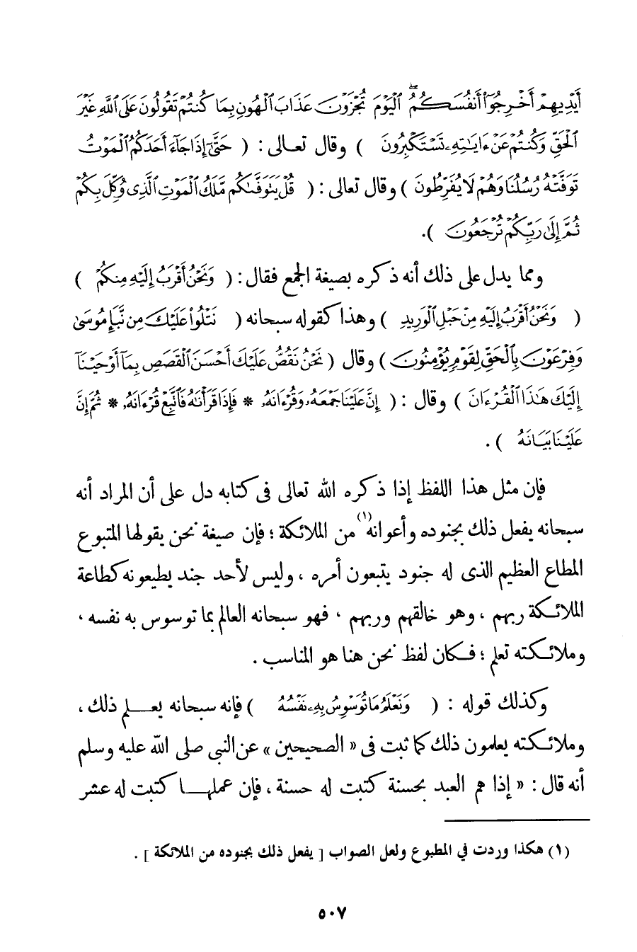 أَيْدِيهِمْ أَخْرِجُوا أَنْفُسَكُمُ الْيَوْمَ تُجْزَوْنَ عَذَابَ الْهُونِ بِمَا كُنْتُمْ تَقُولُونَ عَلَى اللَّهِ غَيْرَ الْحَقِّ وَكُنْتُمْ عَنْ آيَاتِهِ تَسْتَكْبِرُونَ} وَقَالَ تَعَالَى: {حَتَّى إذَا جَاءَ أَحَدَكُمُ الْمَوْتُ تَوَفَّتْهُ رُسُلُنَا وَهُمْ لَا يُفَرِّطُونَ} وَقَالَ تَعَالَى: {قُلْ يَتَوَفَّاكُمْ مَلَكُ الْمَوْتِ الَّذِي وُكِّلَ بِكُمْ ثُمَّ إلَى رَبِّكُمْ تُرْجَعُونَ} . وَمِمَّا يَدُلُّ عَلَى ذَلِكَ أَنَّهُ ذَكَرَهُ بِصِيغَةِ الْجَمْعِ فَقَالَ: {وَنَحْنُ أَقْرَبُ إلَيْهِ مِنْكُمْ} {وَنَحْنُ أَقْرَبُ إلَيْهِ مِنْ حَبْلِ الْوَرِيدِ} وَهَذَا كَقَوْلِهِ سُبْحَانَهُ {نَتْلُوا عَلَيْكَ مِنْ نَبَإِ مُوسَى وَفِرْعَوْنَ بِالْحَقِّ لِقَوْمٍ يُؤْمِنُونَ} وَقَالَ {نَحْنُ نَقُصُّ عَلَيْكَ أَحْسَنَ الْقَصَصِ بِمَا أَوْحَيْنَا إلَيْكَ هَذَا الْقُرْآنَ} وَقَالَ: {إنَّ عَلَيْنَا جَمْعَهُ وَقُرْآنَهُ} {فَإِذَا قَرَأْنَاهُ فَاتَّبِعْ قُرْآنَهُ} {ثُمَّ إنَّ عَلَيْنَا بَيَانَهُ} . فَإِنَّ مِثْلَ هَذَا اللَّفْظِ إذَا ذَكَرَهُ اللَّهُ تَعَالَى فِي كِتَابِهِ دَلَّ عَلَى أَنَّ الْمُرَادَ أَنَّهُ سُبْحَانَهُ يَفْعَلُ ذَلِكَ بِجُنُودِهِ وَأَعْوَانِهِ مِنْ الْمَلَائِكَةِ؛ فَإِنَّ صِيغَةَ نَحْنُ يَقُولُهَا الْمَتْبُوعُ الْمُطَاعُ الْعَظِيمُ الَّذِي لَهُ جُنُودٌ يَتَّبِعُونَ أَمْرَهُ وَلَيْسَ لِأَحَدِ جُنْدٌ يُطِيعُونَهُ كَطَاعَةِ الْمَلَائِكَةِ رَبَّهُمْ وَهُوَ خَالِقُهُمْ وَرَبُّهُمْ فَهُوَ سُبْحَانَهُ الْعَالِمُ بِمَا تُوَسْوِسُ بِهِ نَفْسُهُ وَمَلَائِكَتُهُ تَعْلَمُ؛ فَكَانَ لَفْظُ نَحْنُ هُنَا هُوَ الْمُنَاسِبُ. وَكَذَلِكَ قَوْلُهُ: {وَنَعْلَمُ مَا تُوَسْوِسُ بِهِ نَفْسُهُ} فَإِنَّهُ سُبْحَانَهُ يَعْلَمُ ذَلِكَ وَمَلَائِكَتُهُ يَعْلَمُونَ ذَلِكَ كَمَا ثَبَتَ فِي " الصَّحِيحَيْنِ " عَنْ النَّبِيِّ صَلَّى اللَّهُ عَلَيْهِ وَسَلَّمَ أَنَّهُ قَالَ: {إذَا هَمَّ الْعَبْدُ بِحَسَنَةٍ كُتِبَتْ لَهُ حَسَنَةٌ فَإِنْ عَمِلَهَا كُتِبَتْ لَهُ عَشْرُ