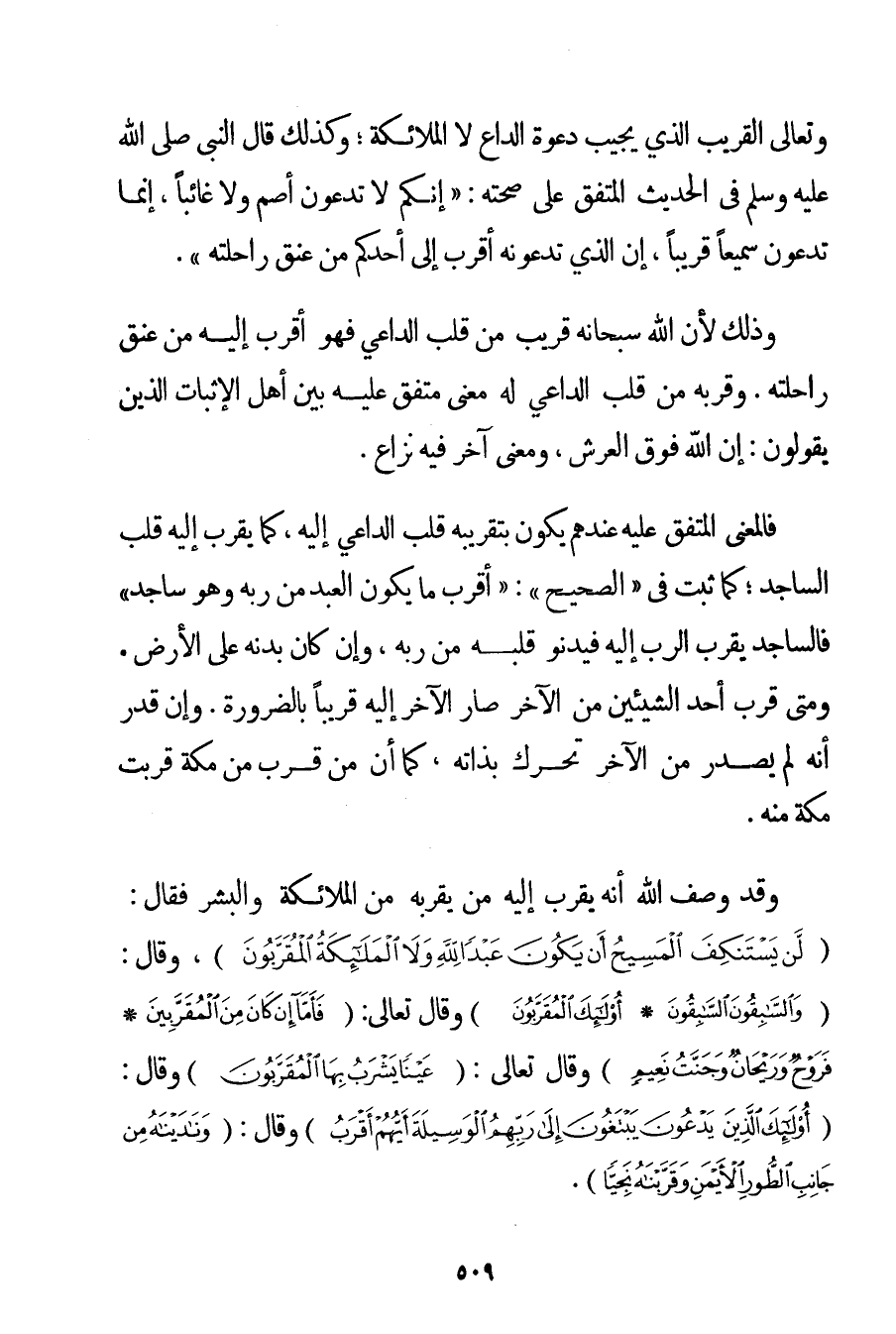 وَتَعَالَى الْقَرِيبُ الَّذِي يُجِيبُ دَعْوَةَ الداع لَا الْمَلَائِكَةُ؛ وَكَذَلِكَ قَالَ النَّبِيُّ صَلَّى اللَّهُ عَلَيْهِ وَسَلَّمَ فِي الْحَدِيثِ الْمُتَّفَقِ عَلَى صِحَّتِهِ: {إنَّكُمْ لَا تَدْعُونَ أَصَمَّ وَلَا غَائِبًا إنَّمَا تَدْعُونَ سَمِيعًا قَرِيبًا إنَّ الَّذِي تَدْعُونَهُ أَقْرَبُ إلَى أَحَدِكُمْ مِنْ عُنُقِ رَاحِلَتِهِ} . وَذَلِكَ لِأَنَّ اللَّهَ سُبْحَانَهُ قَرِيبٌ مِنْ قَلْبِ الدَّاعِي فَهُوَ أَقْرَبُ إلَيْهِ مِنْ عُنُقِ رَاحِلَتِهِ. وَقُرْبُهُ مِنْ قَلْبِ الدَّاعِي لَهُ مَعْنًى مُتَّفَقٌ عَلَيْهِ بَيْنَ أَهْلِ الْإِثْبَاتِ الَّذِينَ يَقُولُونَ: إنَّ اللَّهَ فَوْقَ الْعَرْشِ وَمَعْنًى آخَرُ فِيهِ نِزَاعٌ. فَالْمَعْنَى الْمُتَّفَقُ عَلَيْهِ عِنْدَهُمْ يَكُونُ بِتَقْرِيبِهِ قَلْبَ الدَّاعِي إلَيْهِ كَمَا يُقَرِّبُ إلَيْهِ قَلْبَ السَّاجِدِ؛ كَمَا ثَبَتَ فِي " الصَّحِيحِ ": {أَقْرَبُ مَا يَكُونُ الْعَبْدُ مِنْ رَبِّهِ وَهُوَ سَاجِدٌ} فَالسَّاجِدُ يَقْرُبُ الرَّبُّ إلَيْهِ فَيَدْنُو قَلْبُهُ مِنْ رَبِّهِ وَإِنْ كَانَ بَدَنُهُ عَلَى الْأَرْضِ. وَمَتَى قَرُبَ أَحَدُ الشَّيْئَيْنِ مِنْ الْآخَرِ صَارَ الْآخَرُ إلَيْهِ قَرِيبًا بِالضَّرُورَةِ. وَإِنْ قُدِّرَ أَنَّهُ لَمْ يَصْدُرْ مِنْ الْآخَرِ تَحَرُّكٌ بِذَاتِهِ كَمَا أَنَّ مَنْ قَرُبَ مِنْ مَكَّةَ قَرُبَتْ مَكَّةُ مِنْهُ. وَقَدْ وَصَفَ اللَّهُ أَنَّهُ يَقْرُبُ إلَيْهِ مَنْ يَقْرَبُهُ مِنْ الْمَلَائِكَةِ وَالْبَشَرِ فَقَالَ: {لَنْ يَسْتَنْكِفَ الْمَسِيحُ أَنْ يَكُونَ عَبْدًا لِلَّهِ وَلَا الْمَلَائِكَةُ الْمُقَرَّبُونَ} وَقَالَ: {وَالسَّابِقُونَ السَّابِقُونَ} {أُولَئِكَ الْمُقَرَّبُونَ} وَقَالَ تَعَالَى: {فَأَمَّا إنْ كَانَ مِنَ الْمُقَرَّبِينَ} {فَرَوْحٌ وَرَيْحَانٌ وَجَنَّةُ نَعِيمٍ} وَقَالَ تَعَالَى: {عَيْنًا يَشْرَبُ بِهَا الْمُقَرَّبُونَ} وَقَالَ: {أُولَئِكَ الَّذِينَ يَدْعُونَ يَبْتَغُونَ إلَى رَبِّهِمُ الْوَسِيلَةَ أَيُّهُمْ أَقْرَبُ} وَقَالَ: {وَنَادَيْنَاهُ مِنْ جَانِبِ الطُّورِ الْأَيْمَنِ وَقَرَّبْنَاهُ نَجِيًّا} .