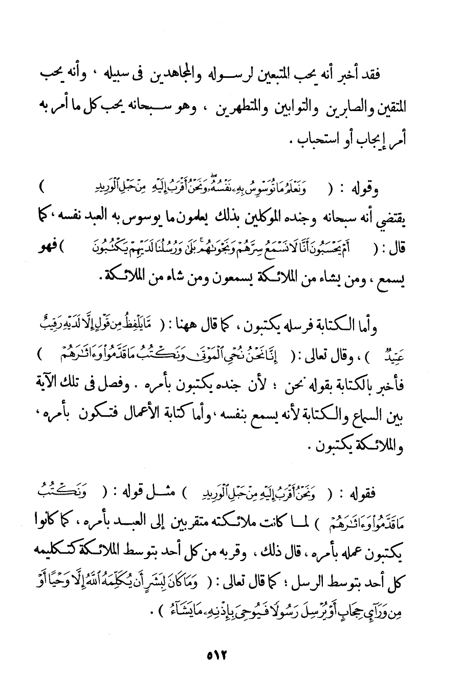 فَقَدْ أَخْبَرَ أَنَّهُ يُحِبُّ الْمُتَّبِعِينَ لِرَسُولِهِ وَالْمُجَاهِدِينَ فِي سَبِيلِهِ وَأَنَّهُ يُحِبُّ الْمُتَّقِينَ وَالصَّابِرِينَ وَالتَّوَّابِينَ والمتطهرين وَهُوَ سُبْحَانَهُ يُحِبُّ كُلَّ مَا أَمَرَ بِهِ أَمْرَ إيجَابٍ أَوْ اسْتِحْبَابٍ. وَقَوْلُهُ: {وَنَعْلَمُ مَا تُوَسْوِسُ بِهِ نَفْسُهُ وَنَحْنُ أَقْرَبُ إلَيْهِ مِنْ حَبْلِ الْوَرِيدِ} يَقْتَضِي أَنَّهُ سُبْحَانَهُ وَجُنْدَهُ الْمُوَكَّلِينَ بِذَلِكَ يَعْلَمُونَ مَا يُوَسْوِسُ بِهِ الْعَبْدُ نَفْسَهُ كَمَا قَالَ: {أَمْ يَحْسَبُونَ أَنَّا لَا نَسْمَعُ سِرَّهُمْ وَنَجْوَاهُمْ بَلَى وَرُسُلُنَا لَدَيْهِمْ يَكْتُبُونَ} فَهُوَ يَسْمَعُ وَمَنْ يَشَاءُ مِنْ الْمَلَائِكَةِ يَسْمَعُونَ وَمَنْ شَاءَ مِنْ الْمَلَائِكَةِ. وَأَمَّا الْكِتَابَةُ فَرُسُلُهُ يَكْتُبُونَ كَمَا قَالَ هَهُنَا: {مَا يَلْفِظُ مِنْ قَوْلٍ إلَّا لَدَيْهِ رَقِيبٌ عَتِيدٌ} وَقَالَ تَعَالَى: {إنَّا نَحْنُ نُحْيِي الْمَوْتَى وَنَكْتُبُ مَا قَدَّمُوا وَآثَارَهُمْ} فَأَخْبَرَ بِالْكِتَابَةِ بِقَوْلِهِ نَحْنُ؛ لِأَنَّ جُنْدَهُ يَكْتُبُونَ بِأَمْرِهِ. وَفَصَلَ فِي تِلْكَ الْآيَةِ بَيْنَ السَّمَاعِ وَالْكِتَابَةِ لِأَنَّهُ يَسْمَعُ بِنَفْسِهِ وَأَمَّا كِتَابَةُ الْأَعْمَالِ فَتَكُونُ بِأَمْرِهِ وَالْمَلَائِكَةُ يَكْتُبُونَ. فَقَوْلُهُ: {وَنَحْنُ أَقْرَبُ إلَيْهِ مِنْ حَبْلِ الْوَرِيدِ} مِثْلُ قَوْلِهِ: {وَنَكْتُبُ مَا قَدَّمُوا وَآثَارَهُمْ} لَمَّا كَانَتْ مَلَائِكَتُهُ مُتَقَرِّبِينَ إلَى الْعَبْدِ بِأَمْرِهِ كَمَا كَانُوا يَكْتُبُونَ عَمَلَهُ بِأَمْرِهِ قَالَ ذَلِكَ وَقَرَّبَهُ مِنْ كُلِّ أَحَدٍ بِتَوَسُّطِ الْمَلَائِكَةِ كَتَكْلِيمِهِ كُلَّ أَحَدٍ بِتَوَسُّطِ الرُّسُلِ؛ كَمَا قَالَ تَعَالَى: {وَمَا كَانَ لِبَشَرٍ أَنْ يُكَلِّمَهُ اللَّهُ إلَّا وَحْيًا أَوْ مِنْ وَرَاءِ حِجَابٍ أَوْ يُرْسِلَ رَسُولًا فَيُوحِيَ بِإِذْنِهِ مَا يَشَاءُ} .