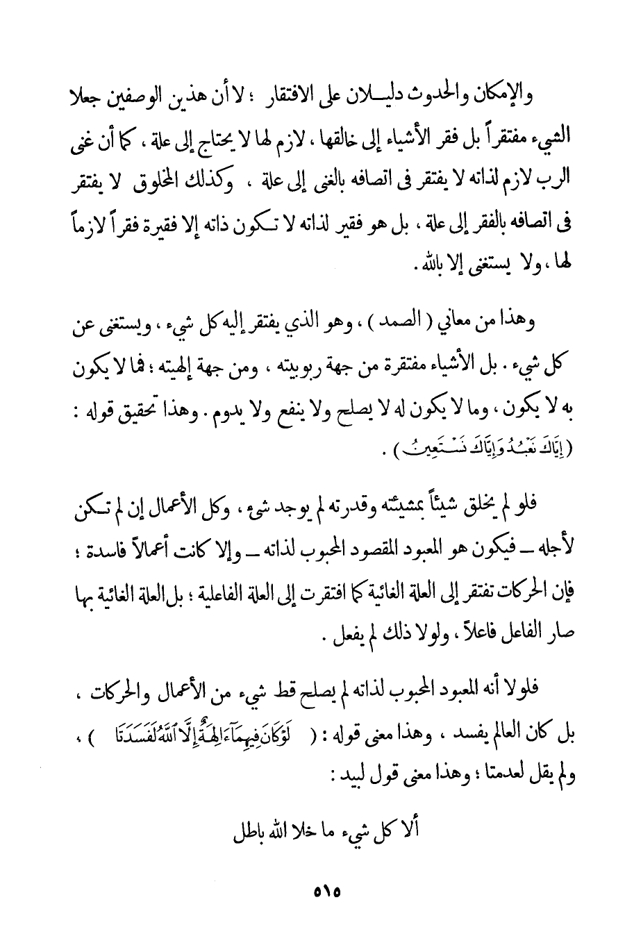 وَالْإِمْكَانُ وَالْحُدُوثُ دَلِيلَانِ عَلَى الِافْتِقَارِ؛ لَا أَنَّ هَذَيْنِ الْوَصْفَيْنِ جَعَلَا الشَّيْءَ مُفْتَقِرًا بَلْ فَقْرُ الْأَشْيَاءِ إلَى خَالِقِهَا لَازِمٌ لَهَا لَا يَحْتَاجُ إلَى عِلَّةٍ كَمَا أَنَّ غِنَى الرَّبِّ لَازِمٌ لِذَاتِهِ لَا يَفْتَقِرُ فِي اتِّصَافِهِ بِالْغِنَى إلَى عِلَّةٍ وَكَذَلِكَ الْمَخْلُوقُ لَا يَفْتَقِرُ فِي اتِّصَافِهِ بِالْفَقْرِ إلَى عِلَّةٍ بَلْ هُوَ فَقِيرٌ لِذَاتِهِ لَا تَكُونُ ذَاتُهُ إلَّا فَقِيرَةً فَقْرًا لَازِمًا لَهَا وَلَا يُسْتَغْنَى إلَّا بِاَللَّهِ. وَهَذَا مِنْ مَعَانِي (الصَّمَدِ) وَهُوَ الَّذِي يَفْتَقِرُ إلَيْهِ كُلُّ شَيْءٍ وَيَسْتَغْنِي عَنْ كُلِّ شَيْءٍ. بَلْ الْأَشْيَاءُ مُفْتَقِرَةٌ مِنْ جِهَةِ رُبُوبِيَّتِهِ وَمِنْ جِهَةِ إلَهِيَّتِهِ؛ فَمَا لَا يَكُونُ بِهِ لَا يَكُونُ وَمَا لَا يَكُونُ لَهُ لَا يَصْلُحُ وَلَا يَنْفَعُ وَلَا يَدُومُ. وَهَذَا تَحْقِيقُ قَوْلِهِ: {إيَّاكَ نَعْبُدُ وَإِيَّاكَ نَسْتَعِينُ} . فَلَوْ لَمْ يَخْلُقْ شَيْئًا بِمَشِيئَتِهِ وَقُدْرَتِهِ لَمْ يُوجَدْ شَيْءٌ وَكُلُّ الْأَعْمَالِ إنْ لَمْ تَكُنْ لِأَجْلِهِ - فَيَكُونُ هُوَ الْمَعْبُودَ الْمَقْصُودَ الْمَحْبُوبَ لِذَاتِهِ - وَإِلَّا كَانَتْ أَعْمَالًا فَاسِدَةً؛ فَإِنَّ الْحَرَكَاتِ تَفْتَقِرُ إلَى الْعِلَّةِ الغائية كَمَا افْتَقَرَتْ إلَى الْعِلَّةِ الْفَاعِلِيَّةِ؛ بَلْ الْعِلَّةُ الغائية بِهَا صَارَ الْفَاعِلُ فَاعِلًا وَلَوْلَا ذَلِكَ لَمْ يَفْعَلْ. فَلَوْلَا أَنَّهُ الْمَعْبُودُ الْمَحْبُوبُ لِذَاتِهِ لَمْ يَصْلُحْ قَطُّ شَيْءٌ مِنْ الْأَعْمَالِ وَالْحَرَكَاتِ بَلْ كَانَ الْعَالَمُ يَفْسُدُ وَهَذَا مَعْنَى قَوْلِهِ: {لَوْ كَانَ فِيهِمَا آلِهَةٌ إلَّا اللَّهُ لَفَسَدَتَا} وَلَمْ يَقُلْ لَعُدِمَتَا؛ وَهَذَا مَعْنَى قَوْلِ لَبِيَدٍ: أَلَا كُلُّ شَيْءٍ مَا خَلَا اللَّهَ بَاطِلُ