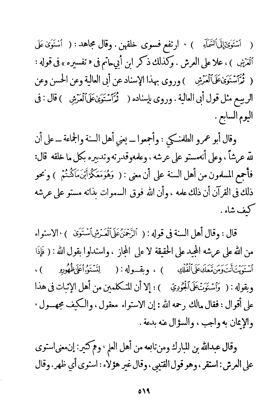 {اسْتَوَى إلَى السَّمَاءِ} ارْتَفَعَ فَسَوَّى خَلْقَهُنَّ. وَقَالَ مُجَاهِدٌ: {اسْتَوَى عَلَى الْعَرْشِ} عَلَا عَلَى الْعَرْشِ. وَكَذَلِكَ ذَكَرَ ابْنُ أَبِي حَاتِمٍ فِي " تَفْسِيرِهِ " فِي قَوْلِهِ: {ثُمَّ اسْتَوَى عَلَى الْعَرْشِ} وَرُوِيَ بِهَذَا الْإِسْنَادِ عَنْ أَبِي الْعَالِيَةِ وَعَنْ الْحَسَنِ وَعَنْ الرَّبِيعِ مِثْلُ قَوْلِ أَبِي الْعَالِيَةِ. وَرُوِيَ بِإِسْنَادِهِ {ثُمَّ اسْتَوَى عَلَى الْعَرْشِ} قَالَ: فِي الْيَوْمِ السَّابِعِ. وَقَالَ أَبُو عَمْرٍو الطلمنكي: وَأَجْمَعُوا - يَعْنِي أَهْلَ السُّنَّةِ وَالْجَمَاعَةِ - عَلَى أَنَّ لِلَّهِ عَرْشًا وَعَلَى أَنَّهُ مُسْتَوٍ عَلَى عَرْشِهِ وَعِلْمِهِ وَقُدْرَتِهِ وَتَدْبِيرِهِ بِكُلِّ مَا خَلَقَهُ قَالَ: فَأَجْمَعَ الْمُسْلِمُونَ مِنْ أَهْلِ السُّنَّةِ عَلَى أَنَّ مَعْنَى: {وَهُوَ مَعَكُمْ أَيْنَ مَا كُنْتُمْ} وَنَحْوُ ذَلِكَ فِي الْقُرْآنِ أَنَّ ذَلِكَ عِلْمُهُ وَأَنَّ اللَّهَ فَوْقَ السَّمَوَاتِ بِذَاتِهِ مُسْتَوٍ عَلَى عَرْشِهِ كَيْفَ شَاءَ. قَالَ: وَقَالَ أَهْلُ السُّنَّةِ فِي قَوْلِهِ: {الرَّحْمَنُ عَلَى الْعَرْشِ اسْتَوَى} الِاسْتِوَاءُ مِنْ اللَّهِ عَلَى عَرْشِهِ الْمَجِيدِ عَلَى الْحَقِيقَةِ لَا عَلَى الْمَجَازِ وَاسْتَدَلُّوا بِقَوْلِ اللَّهِ: {فَإِذَا اسْتَوَيْتَ أَنْتَ وَمَنْ مَعَكَ عَلَى الْفُلْكِ} وَبِقَوْلِهِ: {لِتَسْتَوُوا عَلَى ظُهُورِهِ} وَبِقَوْلِهِ: {وَاسْتَوَتْ عَلَى الْجُودِيِّ} . إلَّا أَنَّ الْمُتَكَلِّمِينَ مِنْ أَهْلِ الْإِثْبَاتِ فِي هَذَا عَلَى أَقْوَالٍ: فَقَالَ مَالِكٌ رَحِمَهُ اللَّهُ إنَّ الِاسْتِوَاءَ مَعْقُولٌ وَالْكَيْفُ مَجْهُولٌ وَالْإِيمَانُ بِهِ وَاجِبٌ وَالسُّؤَالُ عَنْهُ بِدْعَةٌ. وَقَالَ عَبْدُ اللَّهِ بْنُ الْمُبَارَكِ وَمَنْ تَابَعَهُ مِنْ أَهْلِ الْعِلْمِ وَهُمْ كَثِيرٌ: إنَّ مَعْنَى اسْتَوَى عَلَى الْعَرْشِ: اسْتَقَرَّ وَهُوَ قَوْلُ القتيبي وَقَالَ غَيْرُ هَؤُلَاءِ: اسْتَوَى أَيْ ظَهَرَ. وَقَالَ