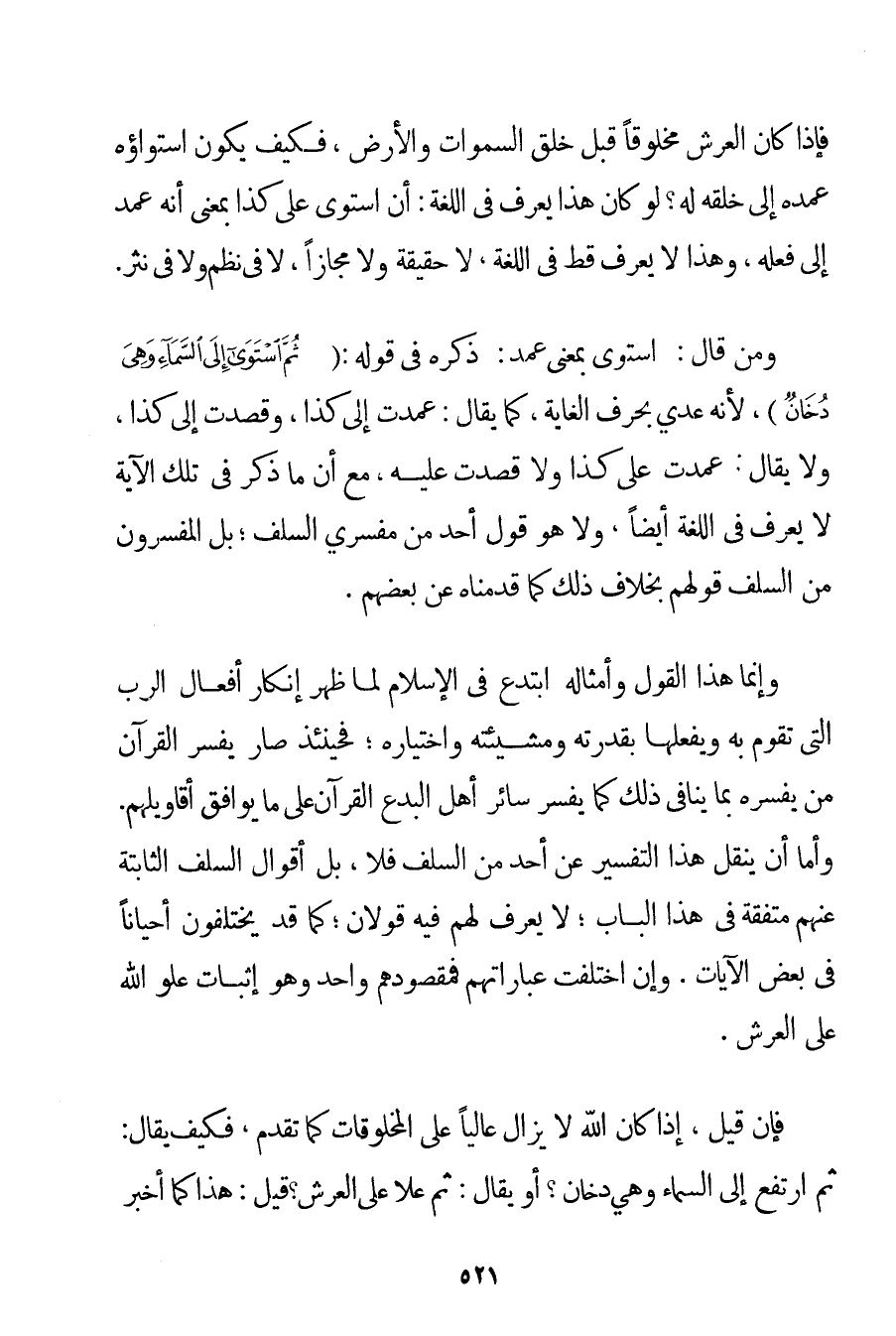 فَإِذَا كَانَ الْعَرْشُ مَخْلُوقًا قَبْلَ خَلْقِ السَّمَوَاتِ وَالْأَرْضِ فَكَيْفَ يَكُونُ اسْتِوَاؤُهُ عَمْدَهُ إلَى خَلْقِهِ لَهُ؟ لَوْ كَانَ هَذَا يُعْرَفُ فِي اللُّغَةِ: أَنَّ اسْتَوَى عَلَى كَذَا بِمَعْنَى أَنَّهُ عَمَدَ إلَى فِعْلِهِ وَهَذَا لَا يُعْرَفُ قَطُّ فِي اللُّغَةِ لَا حَقِيقَةً وَلَا مَجَازًا لَا فِي نَظْمٍ وَلَا فِي نَثْرٍ.