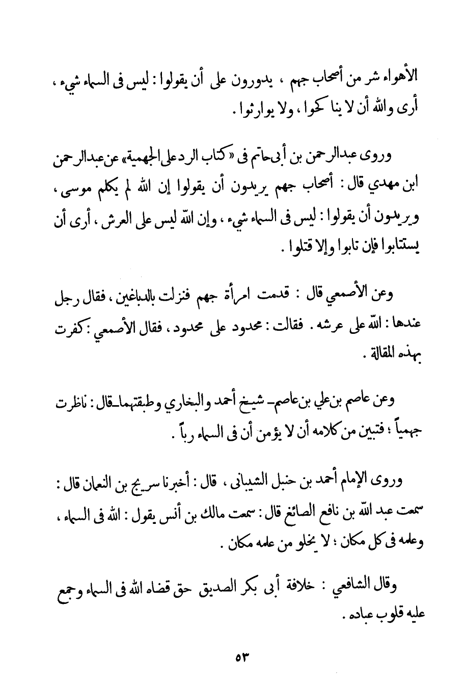 الْأَهْوَاءِ شَرٌّ مِنْ أَصْحَابِ جَهْمٍ يَدُورُونَ عَلَى أَنْ يَقُولُوا: لَيْسَ فِي السَّمَاءِ شَيْءٌ أَرَى وَاَللَّهِ أَنْ لَا يُنَاكَحُوا وَلَا يوارثوا. وَرَوَى عَبْدُ الرَّحْمَنِ بْنُ أَبِي حَاتِمٍ فِي " كِتَابِ الرَّدِّ عَلَى الْجَهْمِيَّة " عَنْ عَبْدِ الرَّحْمَنِ بْنِ مَهْدِيٍّ قَالَ: أَصْحَابُ جَهْمٍ يُرِيدُونَ أَنْ يَقُولُوا إنَّ اللَّهَ لَمْ يُكَلِّمْ مُوسَى وَيُرِيدُونَ أَنْ يَقُولُوا: لَيْسَ فِي السَّمَاءِ شَيْءٌ وَإِنَّ اللَّهَ لَيْسَ عَلَى الْعَرْشِ أَرَى أَنْ يُسْتَتَابُوا فَإِنْ تَابُوا وَإِلَّا قُتِلُوا. وَعَنْ الْأَصْمَعِيِّ قَالَ: قَدِمَتْ امْرَأَةُ جَهْمٍ فَنَزَلَتْ بِالدَّبَّاغِينَ فَقَالَ رَجُلٌ عِنْدَهَا: اللَّهُ عَلَى عَرْشِهِ. فَقَالَتْ: مَحْدُودٌ عَلَى مَحْدُودٍ فَقَالَ الْأَصْمَعِيُّ: كَفَرَتْ بِهَذِهِ الْمَقَالَةِ. وَعَنْ عَاصِمِ بْنِ عَلِيِّ بْنِ عَاصِمٍ - شَيْخِ أَحْمَد وَالْبُخَارِيِّ وَطَبَقَتِهِمَا - قَالَ: نَاظَرْت جهميا؛ فَتَبَيَّنَ مِنْ كَلَامِهِ أَنْ لَا يُؤْمِنَ أَنَّ فِي السَّمَاءِ رَبًّا. وَرَوَى الْإِمَامُ أَحْمَد بْنُ حَنْبَلٍ الشيباني قَالَ: أَخْبَرَنَا سُرَيْجُ بْنُ النُّعْمَانِ قَالَ: سَمِعْت عَبْدَ اللَّهِ بْنَ نَافِعٍ الصَّائِغَ قَالَ: سَمِعْت مَالِكَ بْنَ أَنَسٍ يَقُولُ: اللَّهُ فِي السَّمَاءِ وَعِلْمُهُ فِي كُلِّ مَكَانٍ؛ لَا يَخْلُو مِنْ عِلْمِهِ مَكَانٌ. وَقَالَ الشَّافِعِيُّ: خِلَافَةُ أَبِي بَكْرٍ الصِّدِّيقِ حَقٌّ قَضَاهُ اللَّهُ فِي السَّمَاءِ وَجَمَعَ عَلَيْهِ قُلُوبَ عِبَادِهِ.