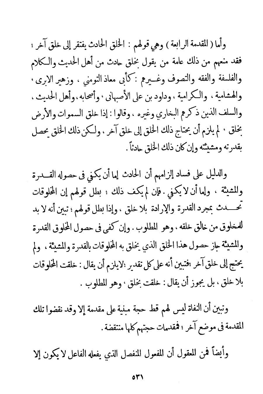 وَأَمَّا الْمُقَدِّمَةُ الرَّابِعَةُ وَهِيَ قَوْلُهُمْ: الْخَلْقُ الْحَادِثُ يَفْتَقِرُ إلَى خَلْقٍ آخَرَ؛ فَقَدْ مَنَعَهُمْ مِنْ ذَلِكَ عَامَّةُ مَنْ يَقُولُ بِخَلْقِ حَادِثٍ مِنْ أَهْلِ الْحَدِيثِ وَالْكَلَامِ وَالْفَلْسَفَةِ وَالْفِقْهِ وَالتَّصَوُّفِ وَغَيْرِهِمْ: كَأَبِي مُعَاذٍ التومني وَزُهَيْرٍ الْإِبَرِيِّ والهشامية والكَرَّامِيَة ودَاوُد بْنِ عَلِيٍّ الأصبهاني وَأَصْحَابِهِ وَأَهْلِ الْحَدِيثِ وَالسَّلَفِ الَّذِينَ ذَكَرَهُمْ الْبُخَارِيُّ وَغَيْرُهُ وَقَالُوا: إذَا خَلَقَ السَّمَوَاتِ وَالْأَرْضَ بِخَلْقٍ لَمْ يَلْزَمْ أَنْ يَحْتَاجَ ذَلِكَ الْخَلْقُ إلَى خَلْقٍ آخَرَ وَلَكِنَّ ذَلِكَ الْخَلْقَ يَحْصُلُ بِقُدْرَتِهِ وَمَشِيئَتِهِ وَإِنْ كَانَ ذَلِكَ الْخَلْقُ حَادِثًا. وَالدَّلِيلُ عَلَى فَسَادِ إلْزَامِهِمْ أَنَّ الْحَادِثَ إمَّا أَنْ يَكْفِيَ فِي حُصُولِهِ الْقُدْرَةُ وَالْمَشِيئَةُ وَإِمَّا أَنْ لَا يَكْفِيَ. فَإِنْ لَمْ يَكْفِ ذَلِكَ؛ بَطَلَ قَوْلُهُمْ إنَّ الْمَخْلُوقَاتِ تَحْدُثُ بِمُجَرَّدِ الْقُدْرَةِ وَالْإِرَادَةِ بِلَا خَلْقٍ وَإِذَا بَطَلَ قَوْلُهُمْ؛ تَبَيَّنَ أَنَّهُ لَا بُدَّ لِلْمَخْلُوقِ مِنْ خَالِقٍ خَلَقَهُ وَهُوَ الْمَطْلُوبُ. وَإِنْ كَفَى فِي حُصُولِ الْمَخْلُوقِ الْقُدْرَةُ وَالْمَشِيئَةُ جَازَ حُصُولُ هَذَا الْخَلْقِ الَّذِي يَخْلُقُ بِهِ الْمَخْلُوقَاتِ بِالْقُدْرَةِ وَالْمَشِيئَةِ وَلَمْ يَحْتَجْ إلَى خَلْقٍ آخَرَ؛ فَتَبَيَّنَ أَنَّهُ عَلَى كُلِّ تَقْدِيرٍ؛ لَا يَلْزَمُ أَنْ يُقَالَ: خَلَقْت الْمَخْلُوقَاتِ بِلَا خَلْقٍ بَلْ يَجُوزُ أَنْ يُقَالَ: خَلَقْت بِخَلْقِ وَهُوَ الْمَطْلُوبُ. وَتَبَيَّنَ أَنَّ الْنُّفَاةِ لَيْسَ لَهُمْ قَطُّ حُجَّةٌ مَبْنِيَّةٌ عَلَى مُقَدِّمَةٍ إلَّا وَقَدْ نَقَضُوا تِلْكَ الْمُقَدِّمَةَ فِي مَوْضِعٍ آخَرَ؛ فَمُقَدِّمَاتُ حُجَّتِهِمْ كُلُّهَا مُنْتَقِضَةٌ. وَأَيْضًا فَمِنْ الْمَعْقُولِ أَنَّ الْمَفْعُولَ الْمُنْفَصِلَ الَّذِي يَفْعَلُهُ الْفَاعِلُ لَا يَكُونُ إلَّا