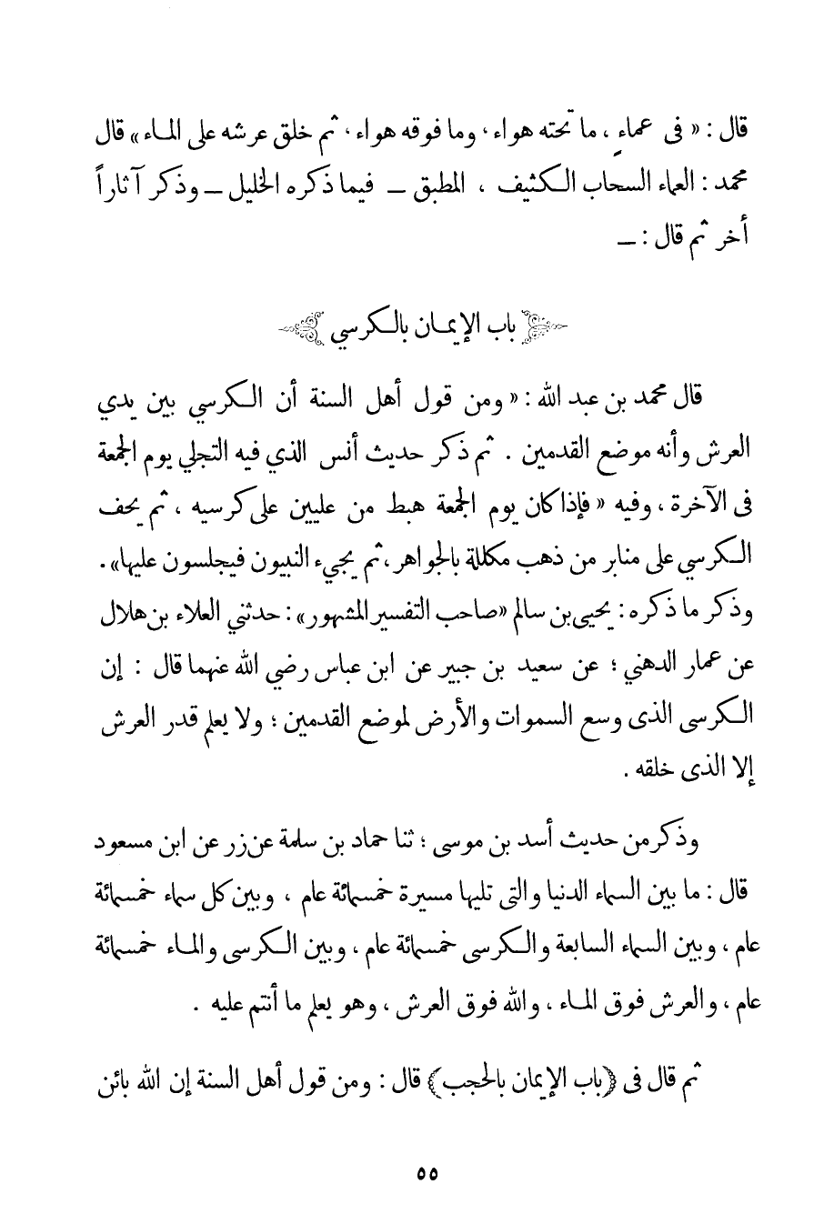 ثُمَّ قَالَ: بَابُ الْإِيمَانِ بِالْكُرْسِيِّ قَالَ مُحَمَّدُ بْنُ عَبْدِ اللَّهِ: " وَمِنْ قَوْلِ أَهْلِ السُّنَّةِ أَنَّ الْكُرْسِيَّ بَيْنَ يَدَيْ الْعَرْشِ وَأَنَّهُ مَوْضِعُ الْقَدَمَيْنِ. ثُمَّ ذَكَرَ {حَدِيثَ أَنَسٍ الَّذِي فِيهِ التَّجَلِّي يَوْمَ الْجُمُعَةِ فِي الْآخِرَةِ وَفِيهِ فَإِذَا كَانَ يَوْمُ الْجُمُعَةِ هَبَطَ مِنْ عِلِّيِّينَ عَلَى كُرْسِيِّهِ ثُمَّ يَحُفُّ الْكُرْسِيَّ عَلَى مَنَابِرَ مَنْ ذَهَبٍ مُكَلَّلَةٍ بِالْجَوَاهِرِ؛ ثُمَّ يَجِيءُ النَّبِيُّونَ فَيَجْلِسُونَ عَلَيْهَا} . وَذَكَرَ مَا ذَكَرَهُ: يَحْيَى بْنُ سَالِمٍ " صَاحِبُ التَّفْسِيرِ الْمَشْهُورِ ": حَدَّثَنِي الْعَلَاءُ بْنُ هِلَالٍ عَنْ عَمَّارٍ الدُّهْنِيِّ؛ عَنْ سَعِيدِ بْنِ جُبَيْرٍ عَنْ ابْنِ عَبَّاسٍ رَضِيَ اللَّهُ عَنْهُمَا قَالَ: إنَّ الْكُرْسِيَّ الَّذِي وَسِعَ السَّمَوَاتِ وَالْأَرْضَ لَمَوْضِعُ الْقَدَمَيْنِ؛ وَلَا يَعْلَمُ قَدْرَ الْعَرْشِ إلَّا الَّذِي خَلَقَهُ. وَذَكَرَ مِنْ حَدِيثِ أَسَدِ بْنِ مُوسَى؛ ثَنَا حَمَّادُ بْنُ سَلَمَةَ عَنْ زِرٍّ عَنْ ابْنِ مَسْعُودٍ قَالَ: مَا بَيْنَ السَّمَاءِ الدُّنْيَا وَاَلَّتِي تَلِيهَا مَسِيرَةُ خَمْسمِائَةِ عَامٍ وَبَيْنَ كُلِّ سَمَاءٍ خَمْسُمِائَةِ عَامٍ وَبَيْنَ السَّمَاءِ السَّابِعَةِ وَالْكُرْسِيِّ خَمْسُمِائَةِ عَامٍ وَبَيْنَ الْكُرْسِيِّ وَالْمَاءِ خَمْسُمِائَةِ عَامٍ وَالْعَرْشُ فَوْقَ الْمَاءِ وَاَللَّهُ فَوْقَ الْعَرْشِ وَهُوَ يَعْلَمُ مَا أَنْتُمْ عَلَيْهِ.