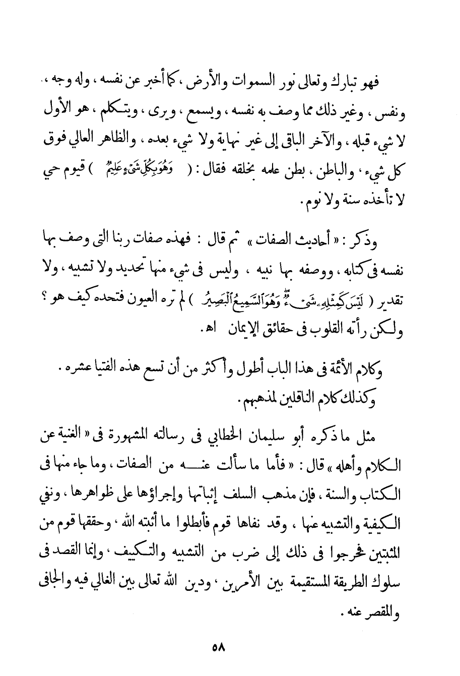وَكَلَامُ الْأَئِمَّةِ فِي هَذَا الْبَابِ أَطْوَلُ وَأَكْثَرُ مِنْ أَنْ تَسَعَ هَذِهِ الْفُتْيَا عُشْرَهُ. وَكَذَلِكَ كَلَامُ النَّاقِلِينَ لِمَذْهَبِهِمْ. مِثْلُ مَا ذَكَرَهُ أَبُو سُلَيْمَانَ الخطابي فِي رِسَالَتِهِ الْمَشْهُورَةِ فِي " الغنية عَنْ الْكَلَامِ وَأَهْلِهِ " قَالَ: " فَأَمَّا مَا سَأَلْت عَنْهُ مِنْ الصِّفَاتِ وَمَا جَاءَ مِنْهَا فِي الْكِتَابِ وَالسُّنَّةِ فَإِنَّ مَذْهَبَ السَّلَفِ إثْبَاتُهَا وَإِجْرَاؤُهَا عَلَى ظَوَاهِرِهَا وَنَفْيُ الْكَيْفِيَّةِ وَالتَّشْبِيهِ عَنْهَا وَقَدْ نَفَاهَا قَوْمٌ فَأَبْطَلُوا مَا أَثْبَتَهُ اللَّهُ وَحَقَّقَهَا قَوْمٌ مِنْ الْمُثْبِتِينَ فَخَرَجُوا فِي ذَلِكَ إلَى ضَرْبٍ مِنْ التَّشْبِيهِ وَالتَّكْيِيفِ وَإِنَّمَا الْقَصْدُ فِي سُلُوكِ الطَّرِيقَةِ الْمُسْتَقِيمَةِ بَيْنَ الْأَمْرَيْنِ وَدِينُ اللَّهِ تَعَالَى بَيْنَ الْغَالِي فِيهِ وَالْجَافِي وَالْمُقَصِّرِ عَنْهُ.