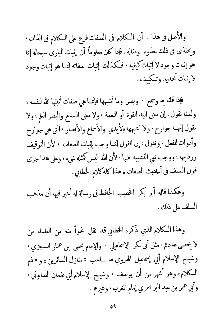 وَالْأَصْلُ فِي هَذَا: أَنَّ الْكَلَامَ فِي الصِّفَاتِ فَرْعٌ عَلَى الْكَلَامِ فِي الذَّاتِ وَيُحْتَذَى فِي ذَلِكَ حَذْوُهُ وَمِثَالُهُ. فَإِذَا كَانَ مَعْلُومًا أَنَّ إثْبَاتَ الْبَارِي سُبْحَانَهُ إنَّمَا هُوَ إثْبَاتُ وُجُودٍ لَا إثْبَاتَ كَيْفِيَّةٍ فَكَذَلِكَ إثْبَاتُ صِفَاتِهِ إنَّمَا هُوَ إثْبَاتُ وُجُودٍ لَا إثْبَاتَ تَحْدِيدٍ وَتَكْيِيفٍ. فَإِذَا قُلْنَا يَدٌ وَسَمْعٌ وَبَصَرٌ وَمَا أَشْبَهَهَا فَإِنَّمَا هِيَ صِفَاتٌ أَثْبَتَهَا اللَّهُ لِنَفْسِهِ؛ وَلَسْنَا نَقُولُ: إنَّ مَعْنَى الْيَدِ الْقُوَّةُ أَوْ النِّعْمَةُ وَلَا مَعْنَى السَّمْعِ وَالْبَصَرِ الْعِلْمُ؛ وَلَا نَقُولُ إنَّهَا جَوَارِحُ وَلَا نُشَبِّهُهَا بِالْأَيْدِي وَالْأَسْمَاعِ وَالْأَبْصَارِ الَّتِي هِيَ جَوَارِحُ وَأَدَوَاتٌ لِلْفِعْلِ وَنَقُولُ: إنَّ الْقَوْلَ إنَّمَا وَجَبَ بِإِثْبَاتِ الصِّفَاتِ؛ لِأَنَّ التَّوْقِيفَ وَرَدَ بِهَا؛ وَوَجَبَ نَفْيُ التَّشْبِيهِ عَنْهَا لِأَنَّ اللَّهَ لَيْسَ كَمِثْلِهِ شَيْءٌ؛ وَعَلَى هَذَا جَرَى قَوْلُ السَّلَفِ فِي أَحَادِيثِ الصِّفَاتِ " هَذَا كُلُّهُ كَلَامُ الخطابي.