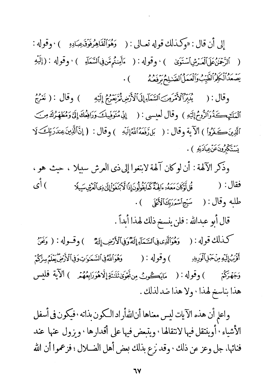 إلَى أَنْ قَالَ: " وَكَذَلِكَ قَوْله تَعَالَى {وَهُوَ الْقَاهِرُ فَوْقَ عِبَادِهِ} وَقَوْلُهُ: {الرَّحْمَنُ عَلَى الْعَرْشِ اسْتَوَى} وَقَوْلُهُ: {أَأَمِنْتُمْ مَنْ فِي السَّمَاءِ} وَقَوْلُهُ: {إلَيْهِ يَصْعَدُ الْكَلِمُ الطَّيِّبُ وَالْعَمَلُ الصَّالِحُ يَرْفَعُهُ} . وَقَالَ: {يُدَبِّرُ الْأَمْرَ مِنَ السَّمَاءِ إلَى الْأَرْضِ ثُمَّ يَعْرُجُ إلَيْهِ} وَقَالَ: {تَعْرُجُ الْمَلَائِكَةُ وَالرُّوحُ إلَيْهِ} وَقَالَ لِعِيسَى: {إنِّي مُتَوَفِّيكَ وَرَافِعُكَ إلَيَّ وَمُطَهِّرُكَ مِنَ الَّذِينَ كَفَرُوا} الْآيَةَ وَقَالَ: {بَلْ رَفَعَهُ اللَّهُ إلَيْهِ} وَقَالَ: {إنَّ الَّذِينَ عِنْدَ رَبِّكَ لَا يَسْتَكْبِرُونَ عَنْ عِبَادَتِهِ} . وَذَكَرَ الْآلِهَةَ: أَنْ لَوْ كَانَ آلِهَةٌ لَابْتَغَوْا إلَى ذِي الْعَرْشِ سَبِيلًا حَيْثُ هُوَ فَقَالَ: {قُلْ لَوْ كَانَ مَعَهُ آلِهَةٌ كَمَا يَقُولُونَ إذًا لَابْتَغَوْا إلَى ذِي الْعَرْشِ سَبِيلًا} أَيْ طَلَبَهُ وَقَالَ: {سَبِّحِ اسْمَ رَبِّكَ الْأَعْلَى} . قَالَ أَبُو عَبْدِ اللَّهِ: فَلَنْ يَنْسَخَ ذَلِكَ لِهَذَا أَبَدًا. كَذَلِكَ قَوْلُهُ: {وَهُوَ الَّذِي فِي السَّمَاءِ إلَهٌ وَفِي الْأَرْضِ إلَهٌ} وَقَوْلُهُ: {وَنَحْنُ أَقْرَبُ إلَيْهِ مِنْ حَبْلِ الْوَرِيدِ} وَقَوْلُهُ: {وَهُوَ اللَّهُ فِي السَّمَاوَاتِ وَفِي الْأَرْضِ يَعْلَمُ سِرَّكُمْ وَجَهْرَكُمْ} وَقَوْلُهُ: {مَا يَكُونُ مِنْ نَجْوَى ثَلَاثَةٍ إلَّا هُوَ رَابِعُهُمْ} الْآيَةَ فَلَيْسَ هَذَا بِنَاسِخِ لِهَذَا وَلَا هَذَا ضِدٌّ لِذَلِكَ. وَاعْلَمْ أَنَّ هَذِهِ الْآيَاتِ لَيْسَ مَعْنَاهَا أَنَّ اللَّهَ أَرَادَ الْكَوْنَ بِذَاتِهِ فَيَكُونُ فِي أَسْفَلِ الْأَشْيَاءِ أَوْ يَنْتَقِلُ فِيهَا لِانْتِقَالِهَا وَيَتَبَعَّضُ فِيهَا عَلَى أَقْدَارِهَا وَيَزُولُ عَنْهَا عِنْدَ فَنَائِهَا جَلَّ وَعَزَّ عَنْ ذَلِكَ وَقَدْ نَزَعَ بِذَلِكَ بَعْضُ أَهْلِ الضَّلَالِ؛ فَزَعَمُوا أَنَّ اللَّهَ
