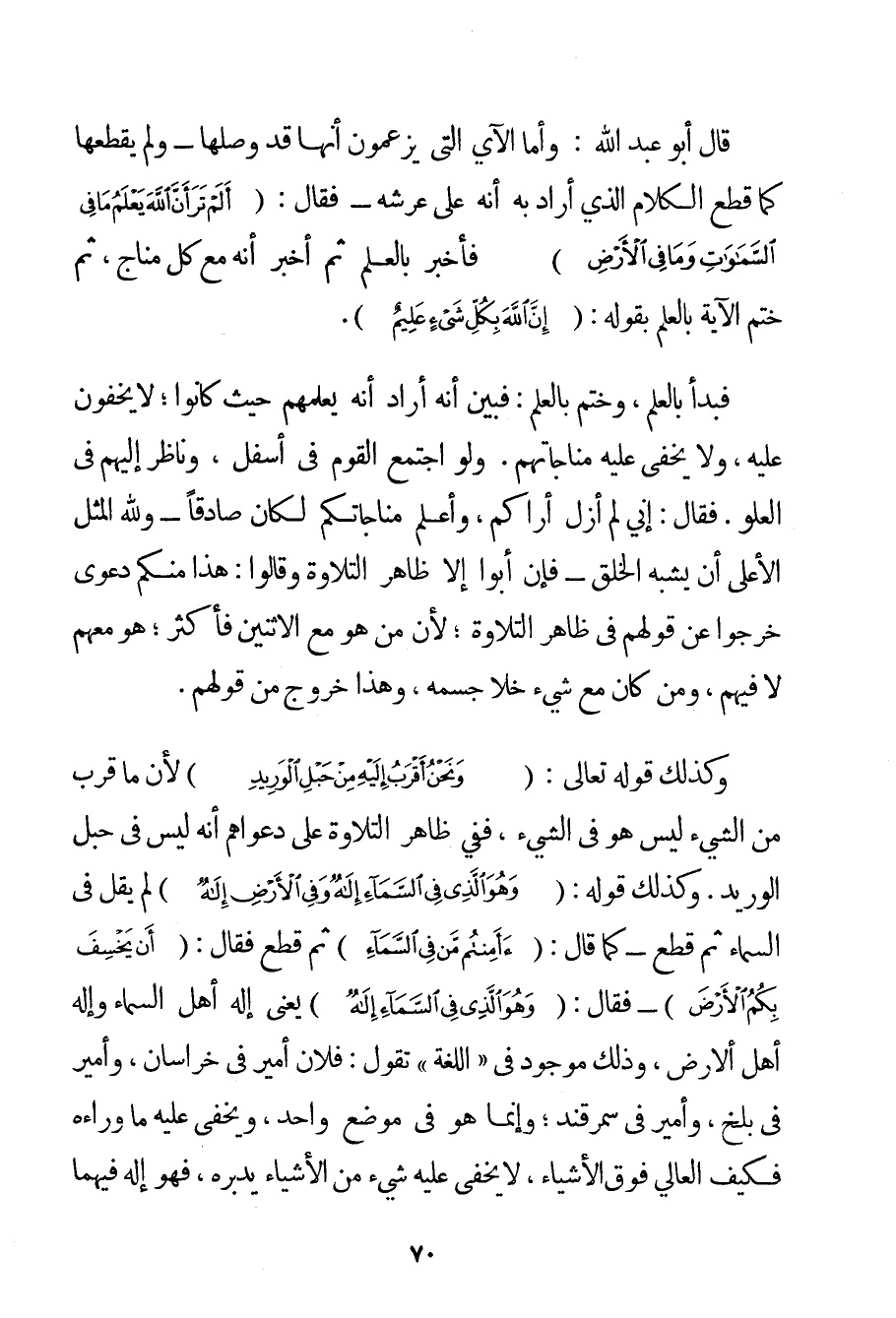 قَالَ أَبُو عَبْدِ اللَّهِ: وَأَمَّا الْآيُ الَّتِي يَزْعُمُونَ أَنَّهَا قَدْ وَصَلَهَا - وَلَمْ يَقْطَعْهَا كَمَا قَطَعَ الْكَلَامَ الَّذِي أَرَادَ بِهِ أَنَّهُ عَلَى عَرْشِهِ - فَقَالَ: {أَلَمْ تَرَ أَنَّ اللَّهَ يَعْلَمُ مَا فِي السَّمَاوَاتِ وَمَا فِي الْأَرْضِ} فَأَخْبَرَ بِالْعِلْمِ ثُمَّ أَخْبَرَ أَنَّهُ مَعَ كُلِّ مُنَاجٍ ثُمَّ خَتَمَ الْآيَةَ بِالْعِلْمِ بِقَوْلِهِ: {إنَّ اللَّهَ بِكُلِّ شَيْءٍ عَلِيمٌ} . فَبَدَأَ بِالْعِلْمِ وَخَتَمَ بِالْعِلْمِ: فَبَيَّنَ أَنَّهُ أَرَادَ أَنَّهُ يَعْلَمُهُمْ حَيْثُ كَانُوا؛ لَا يَخْفُونَ عَلَيْهِ وَلَا يَخْفَى عَلَيْهِ مُنَاجَاتُهُمْ. وَلَوْ اجْتَمَعَ الْقَوْمُ فِي أَسْفَلُ وَنَاظَرَ إلَيْهِمْ فِي الْعُلُوِّ. فَقَالَ: إنِّي لَمْ أَزَلْ أَرَاكُمْ وَأَعْلَمُ مُنَاجَاتَكُمْ لَكَانَ صَادِقًا - وَلِلَّهِ الْمَثَلُ الْأَعْلَى أَنْ يُشْبِهَ الْخَلْقَ - فَإِنْ أَبَوْا إلَّا ظَاهِرَ التِّلَاوَةِ وَقَالُوا: هَذَا مِنْكُمْ دَعْوَى خَرَجُوا عَنْ قَوْلِهِمْ فِي ظَاهِرِ التِّلَاوَةِ؛ لِأَنَّ مَنْ هُوَ مَعَ الِاثْنَيْنِ فَأَكْثَرُ؛ هُوَ مَعَهُمْ لَا فِيهِمْ وَمَنْ كَانَ مَعَ شَيْءٍ خَلَا جِسْمِهِ وَهَذَا خُرُوجٌ مِنْ قَوْلِهِمْ. وَكَذَلِكَ قَوْله تَعَالَى {وَنَحْنُ أَقْرَبُ إلَيْهِ مِنْ حَبْلِ الْوَرِيدِ} لِأَنَّ مَا قَرُبَ مِنْ الشَّيْءِ لَيْسَ هُوَ فِي الشَّيْءِ فَفِي ظَاهِرِ التِّلَاوَةِ عَلَى دَعْوَاهُمْ أَنَّهُ لَيْسَ فِي حَبْلِ الْوَرِيدِ. وَكَذَلِكَ قَوْلُهُ: {وَهُوَ الَّذِي فِي السَّمَاءِ إلَهٌ وَفِي الْأَرْضِ إلَهٌ} لَمْ يَقُلْ فِي السَّمَاءِ ثُمَّ قَطَعَ - كَمَا قَالَ: {أَأَمِنْتُمْ مَنْ فِي السَّمَاءِ} ثُمَّ قَطَعَ فَقَالَ: {أَنْ يَخْسِفَ بِكُمُ الْأَرْضَ} - فَقَالَ: {وَهُوَ الَّذِي فِي السَّمَاءِ إلَهٌ} يَعْنِي إلَهَ أَهْلِ السَّمَاءِ وَإِلَهَ أَهْلِ الْأَرْضِ وَذَلِكَ مَوْجُودٌ فِي " اللُّغَةِ " تَقُولُ: فُلَانٌ أَمِيرٌ فِي خُرَاسَانَ وَأَمِيرٌ فِي بلخ وَأَمِيرٌ فِي سَمَرْقَنْدَ؛ وَإِنَّمَا هُوَ فِي مَوْضِعٍ وَاحِدٍ وَيَخْفَى عَلَيْهِ مَا وَرَاؤُهُ فَكَيْفَ الْعَالِي فَوْقَ الْأَشْيَاءِ لَا يَخْفَى عَلَيْهِ شَيْءٌ مِنْ الْأَشْيَاءِ يُدَبِّرُهُ فَهُوَ إلَهٌ فِيهِمَا
