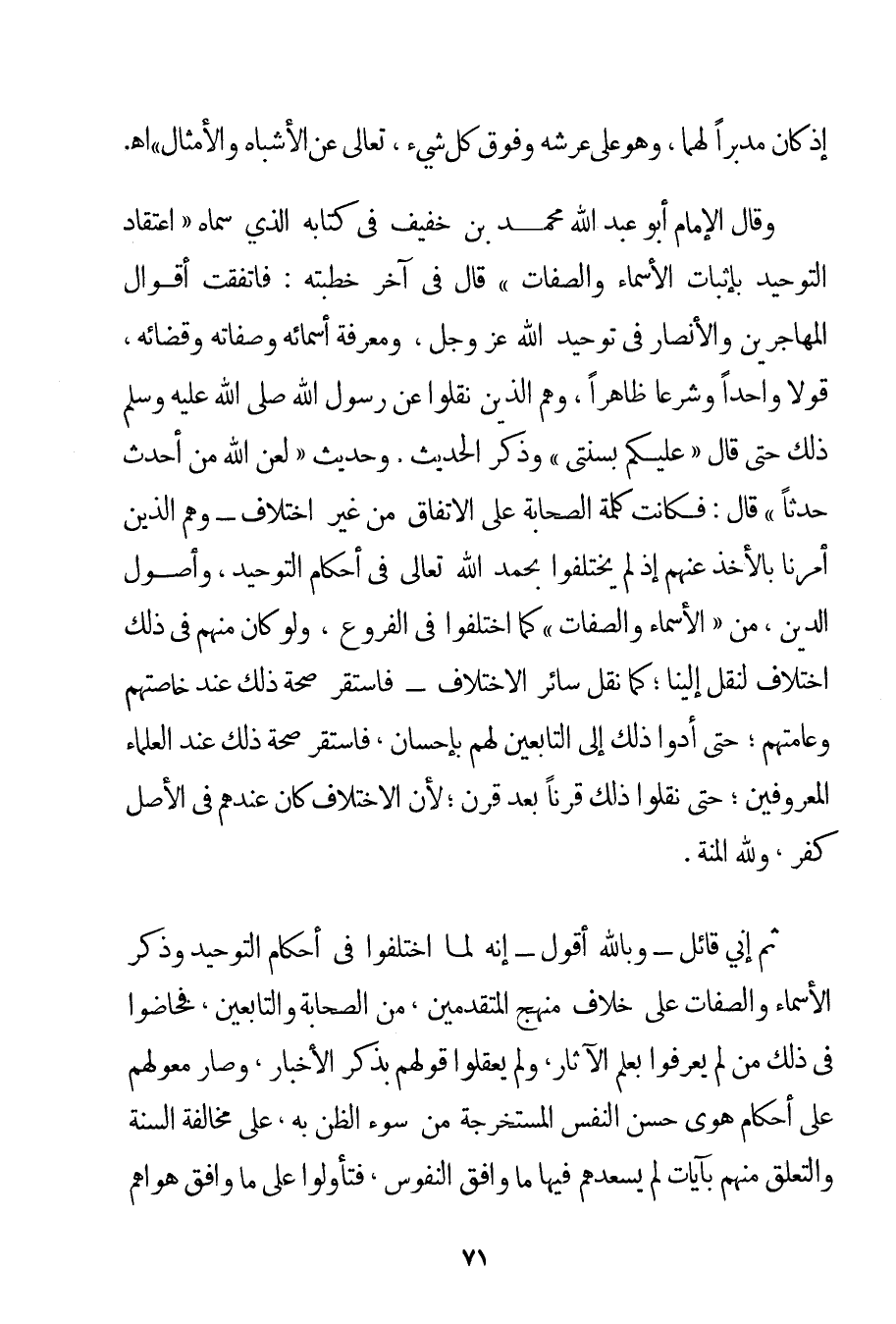 وَقَالَ الْإِمَامُ أَبُو عَبْدِ اللَّهِ مُحَمَّدُ بْنُ خَفِيفٍ فِي كِتَابِهِ الَّذِي سَمَّاهُ " اعْتِقَادُ التَّوْحِيدِ بِإِثْبَاتِ الْأَسْمَاءِ وَالصِّفَاتِ " قَالَ فِي آخِرِ خُطْبَتِهِ: فَاتَّفَقَتْ أَقْوَالُ الْمُهَاجِرِينَ وَالْأَنْصَارِ فِي تَوْحِيدِ اللَّهِ عَزَّ وَجَلَّ وَمَعْرِفَةِ أَسْمَائِهِ وَصِفَاتِهِ وَقَضَائِهِ قَوْلًا وَاحِدًا وَشَرْعًا ظَاهِرًا وَهُمْ الَّذِينَ نَقَلُوا عَنْ رَسُولِ اللَّهِ صَلَّى اللَّهُ عَلَيْهِ وَسَلَّمَ ذَلِكَ حَتَّى قَالَ {عَلَيْكُمْ بِسُنَّتِي} وَذَكَرَ الْحَدِيثَ وَحَدِيثَ {لَعَنَ اللَّهُ مَنْ أَحْدَثَ حَدَثًا} قَالَ: فَكَانَتْ كَلِمَةُ الصَّحَابَةِ عَلَى الِاتِّفَاقِ مِنْ غَيْرِ اخْتِلَافٍ - وَهُمْ الَّذِينَ أُمِرْنَا بِالْأَخْذِ عَنْهُمْ إذْ لَمْ يَخْتَلِفُوا بِحَمْدِ اللَّهِ تَعَالَى فِي أَحْكَامِ التَّوْحِيدِ وَأُصُولِ الدِّينِ مِنْ " الْأَسْمَاءِ وَالصِّفَاتِ " كَمَا اخْتَلَفُوا فِي الْفُرُوعِ وَلَوْ كَانَ مِنْهُمْ فِي ذَلِكَ اخْتِلَافٌ لَنُقِلَ إلَيْنَا؛ كَمَا نُقِلَ سَائِرُ الِاخْتِلَافِ - فَاسْتَقَرَّ صِحَّةُ ذَلِكَ عِنْدَ خَاصَّتِهِمْ وَعَامَّتِهِمْ؛ حَتَّى أَدَّوْا ذَلِكَ إلَى التَّابِعِينَ لَهُمْ بِإِحْسَانِ فَاسْتَقَرَّ صِحَّةُ ذَلِكَ عِنْدَ الْعُلَمَاءِ الْمَعْرُوفِينَ؛ حَتَّى نَقَلُوا ذَلِكَ قَرْنًا بَعْدَ قَرْنٍ؛ لِأَنَّ الِاخْتِلَافَ كَانَ عِنْدَهُمْ فِي الْأَصْلِ كُفْرٌ وَلِلَّهِ الْمِنَّةُ. ثُمَّ إنِّي قَائِلٌ - وَبِاَللَّهِ أَقُولُ - إنَّهُ لَمَّا اخْتَلَفُوا فِي أَحْكَامِ التَّوْحِيدِ وَذِكْرِ الْأَسْمَاءِ وَالصِّفَاتِ عَلَى خِلَافِ مَنْهَجِ الْمُتَقَدِّمِينَ مِنْ الصَّحَابَةِ وَالتَّابِعِينَ فَخَاضُوا فِي ذَلِكَ مَنْ لَمْ يُعْرَفُوا بِعِلْمِ الْآثَارِ وَلَمْ يَعْقِلُوا قَوْلَهُمْ بِذِكْرِ الْأَخْبَارِ وَصَارَ مِعْوَلُهُمْ عَلَى أَحْكَامِ هَوَى حُسْنِ النَّفْسِ الْمُسْتَخْرَجَةِ مِنْ سُوءِ الظَّنِّ بِهِ عَلَى مُخَالَفَةِ السُّنَّةِ وَالتَّعَلُّقِ مِنْهُمْ بِآيَاتِ لَمْ يُسْعِدْهُمْ فِيهَا مَا وَافَقَ النُّفُوسَ فَتَأَوَّلُوا عَلَى مَا وَافَقَ هَوَاهُمْ