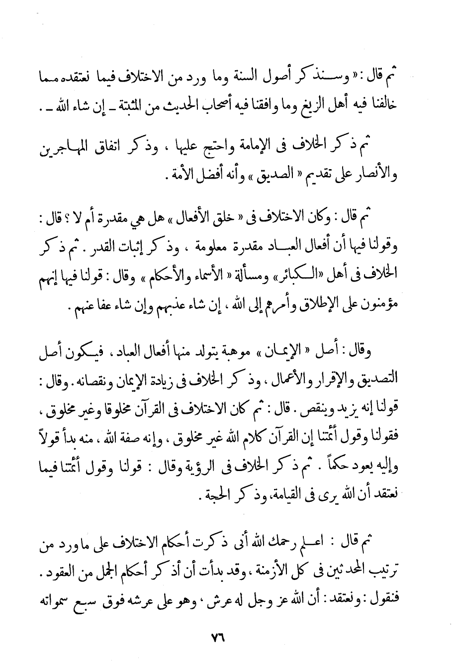 ثُمَّ قَالَ: " وَسَنَذْكُرُ أُصُولَ السُّنَّةِ وَمَا وَرَدَ مِنْ الِاخْتِلَافِ فِيمَا نَعْتَقِدُهُ مِمَّا خَالَفْنَا فِيهِ أَهْلَ الزَّيْغِ وَمَا وَافَقْنَا فِيهِ أَصْحَابَ الْحَدِيثِ مِنْ الْمُثْبِتَةِ - إنْ شَاءَ اللَّهُ -. ثُمَّ ذَكَرَ الْخِلَافَ فِي الْإِمَامَةِ وَاحْتَجَّ عَلَيْهَا وَذَكَرَ اتِّفَاقَ الْمُهَاجِرِينَ وَالْأَنْصَارِ عَلَى تَقْدِيمِ " الصِّدِّيقِ " وَأَنَّهُ أَفْضَلُ الْأُمَّةِ. ثُمَّ قَالَ: وَكَانَ الِاخْتِلَافُ فِي " خَلْقِ الْأَفْعَالِ " هَلْ هِيَ مُقَدَّرَةٌ أَمْ لَا؟ قَالَ: وَقَوْلُنَا فِيهَا أَنَّ أَفْعَالَ الْعِبَادِ مُقَدَّرَةٌ مَعْلُومَةٌ وَذَكَرَ إثْبَاتَ الْقَدَرِ. ثُمَّ ذَكَرَ الْخِلَافَ فِي أَهْلِ " الْكَبَائِرِ " وَمَسْأَلَةَ " الْأَسْمَاءِ وَالْأَحْكَامِ " وَقَالَ: قَوْلُنَا فِيهَا إنَّهُمْ مُؤْمِنُونَ عَلَى الْإِطْلَاقِ وَأَمْرُهُمْ إلَى اللَّهِ إنْ شَاءَ عَذَّبَهُمْ وَإِنْ شَاءَ عَفَا عَنْهُمْ. وَقَالَ: أَصْلُ " الْإِيمَانِ " مَوْهِبَةٌ يَتَوَلَّدُ مِنْهَا أَفْعَالُ الْعِبَادِ فَيَكُونُ أَصْلَ التَّصْدِيقِ وَالْإِقْرَارِ وَالْأَعْمَالِ وَذَكَرَ الْخِلَافَ فِي زِيَادَةِ الْإِيمَانِ وَنُقْصَانِهِ. وَقَالَ: قَوْلُنَا إنَّهُ يَزِيدُ وَيَنْقُصُ. قَالَ: ثُمَّ كَانَ الِاخْتِلَافُ فِي الْقُرْآنِ مَخْلُوقًا وَغَيْرُ مَخْلُوقٍ فَقَوْلُنَا وَقَوْلُ أَئِمَّتِنَا إنَّ الْقُرْآنَ كَلَامُ اللَّهِ غَيْرَ مَخْلُوقٍ وَإِنَّهُ صِفَةُ اللَّهِ مِنْهُ بَدَأَ قَوْلًا وَإِلَيْهِ يَعُودُ حُكْمًا. ثُمَّ ذَكَرَ الْخِلَافَ فِي الرُّؤْيَةِ وَقَالَ: قَوْلُنَا وَقَوْلُ أَئِمَّتِنَا فِيمَا نَعْتَقِدُ أَنَّ اللَّهَ يُرَى فِي الْقِيَامَةِ وَذَكَرَ الْحُجَّةَ. ثُمَّ قَالَ: اعْلَمْ رَحِمَك اللَّهُ أَنِّي ذَكَرْت أَحْكَامَ الِاخْتِلَافِ عَلَى مَا وَرَدَ مِنْ تَرْتِيبِ الْمُحَدِّثِينَ فِي كُلِّ الْأَزْمِنَةِ وَقَدْ بَدَأْت أَنْ أَذْكُرَ أَحْكَامَ الْجُمَلِ مِنْ الْعُقُودِ. فَنَقُولُ: وَنَعْتَقِدُ: أَنَّ اللَّهَ عَزَّ وَجَلَّ لَهُ عَرْشٌ وَهُوَ عَلَى عَرْشِهِ فَوْقَ سَبْعِ سَمَوَاتِهِ