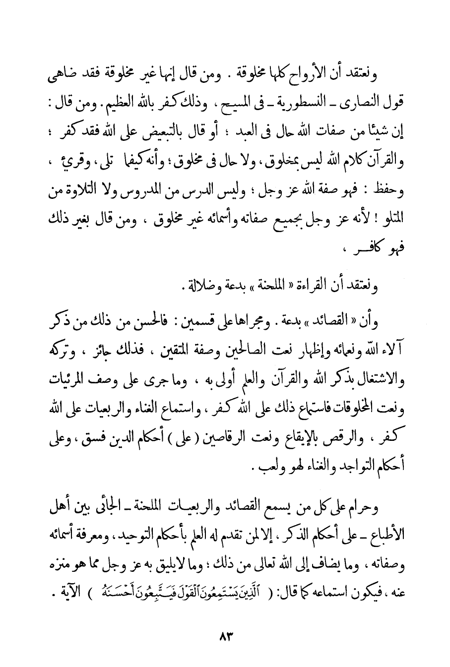 وَنَعْتَقِدُ أَنَّ الْقِرَاءَةَ " الْمُلَحَّنَةَ " بِدْعَةٌ وَضَلَالَةٌ. وَأَنَّ " الْقَصَائِدَ " بِدْعَةٌ. وَمَجْرَاهَا عَلَى قِسْمَيْنِ: فَالْحَسَنُ مِنْ ذَلِكَ مَنْ ذَكَرَ آلَاءِ اللَّهِ وَنَعْمَائِهِ وَإِظْهَارِ نَعْتِ الصَّالِحِينَ وَصِفَةِ الْمُتَّقِينَ فَذَلِكَ جَائِزٌ وَتَرْكُهُ وَالِاشْتِغَالُ بِذِكْرِ اللَّهِ وَالْقُرْآنِ وَالْعِلْمِ أَوْلَى بِهِ وَمَا جَرَى عَلَى وَصْفِ الْمَرْئِيَّاتِ وَنَعْتِ الْمَخْلُوقَاتِ فَاسْتِمَاعُ ذَلِكَ عَلَى اللَّهِ كُفْرٌ وَاسْتِمَاعُ الْغِنَاءِ والربعيات عَلَى اللَّهِ كُفْرٌ وَالرَّقْصُ بِالْإِيقَاعِ وَنَعْتُ الرَّقَّاصِينَ عَلَى أَحْكَامِ الدِّينِ فِسْقٌ وَعَلَى أَحْكَامِ التَّوَاجُدِ وَالْغِنَاءِ لَهْوٌ وَلَعِبٌ. وَحَرَامٌ عَلَى كُلِّ مَنْ يَسْمَعُ الْقَصَائِدَ والربعيات الْمُلَحَّنَةَ - الْجَائِي بَيْنَ أَهْلِ الْأَطْبَاعِ - عَلَى أَحْكَامِ الذِّكْرِ إلَّا لِمَنْ تَقَدَّمَ لَهُ الْعِلْمُ بِأَحْكَامِ التَّوْحِيدِ وَمَعْرِفَةِ أَسْمَائِهِ وَصِفَاتِهِ وَمَا يُضَافُ إلَى اللَّهِ تَعَالَى مِنْ ذَلِكَ؛ وَمَا لَا يَلِيقُ بِهِ عَزَّ وَجَلَّ مِمَّا هُوَ مُنَزَّهٌ عَنْهُ فَيَكُونُ اسْتِمَاعُهُ كَمَا قَالَ: {الَّذِينَ يَسْتَمِعُونَ الْقَوْلَ فَيَتَّبِعُونَ أَحْسَنَهُ} الْآيَةَ.