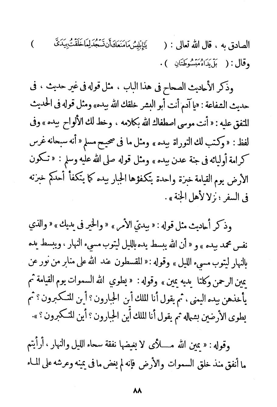 الصَّادِقِ بِهِ قَالَ اللَّهُ تَعَالَى: {يَا إبْلِيسُ مَا مَنَعَكَ أَنْ تَسْجُدَ لِمَا خَلَقْتُ بِيَدَيَّ} وَقَالَ: {بَلْ يَدَاهُ مَبْسُوطَتَانِ} . وَذَكَرَ الْأَحَادِيثَ الصِّحَاحَ فِي هَذَا الْبَابِ مِثْلُ قَوْلِهِ فِي غَيْرِ حَدِيثٍ فِي حَدِيثِ الشَّفَاعَةِ: {يَا آدَمَ أَنْتَ أَبُو الْبَشَرِ خَلَقَك اللَّهُ بِيَدِهِ} وَمِثْلُ قَوْلِهِ فِي الْحَدِيثِ الْمُتَّفَقِ عَلَيْهِ: {أَنْتَ مُوسَى اصْطَفَاك اللَّهُ بِكَلَامِهِ وَخَطَّ لَك الْأَلْوَاحَ بِيَدِهِ} وَفِي لَفْظٍ: {وَكَتَبَ لَك التَّوْرَاةَ بِيَدِهِ} وَمِثْلُ مَا فِي صَحِيحِ مُسْلِمٍ {أَنَّهُ سُبْحَانَهُ غَرَسَ كَرَامَةَ أَوْلِيَائِهِ فِي جَنَّةِ عَدْنٍ بِيَدِهِ} وَمِثْلُ قَوْلِهِ صَلَّى اللَّهُ عَلَيْهِ وَسَلَّمَ {تَكُونُ الْأَرْضُ يَوْمَ الْقِيَامَةِ خُبْزَةً وَاحِدَةً يتكفؤها الْجَبَّارُ بِيَدِهِ كَمَا يَتَكَفَّأُ أَحَدُكُمْ خُبْزَتَهُ فِي السَّفَرِ؛ نُزُلًا لِأَهْلِ الْجَنَّةِ} . وَذَكَرَ أَحَادِيثَ مِثْلَ قَوْلِهِ: {بِيَدِي الْأَمْرُ} {وَالْخَيْرُ فِي يَدَيْك} {وَاَلَّذِي نَفْسُ مُحَمَّدٍ بِيَدِهِ} و {أَنَّ اللَّهَ يَبْسُطُ يَدَهُ بِاللَّيْلِ لِيَتُوبَ مُسِيءُ النَّهَارِ وَيَبْسُطُ يَدَهُ بِالنَّهَارِ لِيَتُوبَ مُسِيءُ اللَّيْلِ} وَقَوْلُهُ: {الْمُقْسِطُونَ عِنْدَ اللَّهِ عَلَى مَنَابِرَ مِنْ نُورٍ عَنْ يَمِينِ الرَّحْمَنِ وَكِلْتَا يَدَيْهِ يَمِينٌ} وَقَوْلُهُ: {يَطْوِي اللَّهُ السَّمَوَاتِ يَوْمَ الْقِيَامَةِ ثُمَّ يَأْخُذُهُنَّ بِيَدِهِ الْيُمْنَى ثُمَّ يَقُولُ أَنَا الْمَلِكُ أَيْنَ الْجَبَّارُونَ؟ أَيْنَ الْمُتَكَبِّرُونَ؟ ثُمَّ يَطْوِي الْأَرْضِينَ بِشِمَالِهِ ثُمَّ يَقُولُ أَنَا الْمَلِكُ أَيْنَ الْجَبَّارُونَ؟ أَيْنَ الْمُتَكَبِّرُونَ؟} . وَقَوْلُهُ: {يَمِينُ اللَّهِ مَلْأَى لَا يَغِيضهَا نَفَقَةٌ سَحَّاءُ اللَّيْلَ وَالنَّهَارَ أَرَأَيْتُمْ مَا أَنْفَقَ مُنْذُ خَلَقَ السَّمَوَاتِ وَالْأَرْضَ فَإِنَّهُ لَمْ يَغِضْ مَا فِي يَمِينِهِ وَعَرْشُهُ عَلَى الْمَاءِ