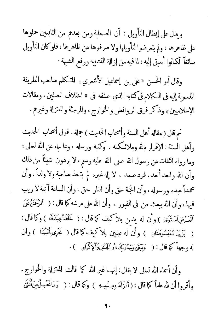 وَقَالَ أَبُو الْحَسَنِ عَلِيُّ بْنُ إسْمَاعِيلَ الْأَشْعَرِيُّ " الْمُتَكَلِّمُ صَاحِبُ الطَّرِيقَةِ الْمَنْسُوبَةِ إلَيْهِ فِي الْكَلَامِ فِي كِتَابِهِ الَّذِي صَنَّفَهُ فِي " اخْتِلَافِ الْمُصَلِّينَ وَمَقَالَاتِ الْإِسْلَامِيِّينَ " وَذَكَرَ فِرَقَ الرَّوَافِضِ وَالْخَوَارِجِ وَالْمُرْجِئَةِ وَالْمُعْتَزِلَةِ وَغَيْرَهُمْ. ثُمَّ قَالَ (مَقَالَةَ أَهْلِ السُّنَّةِ وَأَصْحَابِ الْحَدِيثِ جُمْلَةً. قَوْلُ أَصْحَابِ الْحَدِيثِ وَأَهْلِ السُّنَّةِ: الْإِقْرَارُ بِاَللَّهِ وَمَلَائِكَتِهِ وَكُتُبِهِ وَرُسُلِهِ وَبِمَا جَاءَ عَنْ اللَّهِ تَعَالَى؛ وَمَا رَوَاهُ الثِّقَاتُ عَنْ رَسُولِ اللَّهِ صَلَّى اللَّهُ عَلَيْهِ وَسَلَّمَ لَا يَرُدُّونَ شَيْئًا مِنْ ذَلِكَ وَأَنَّ اللَّهَ وَاحِدٌ أَحَدٌ فَرْدٌ صَمَدٌ لَا إلَهَ غَيْرُهُ لَمْ يَتَّخِذْ صَاحِبَةً وَلَا وَلَدًا وَأَنَّ مُحَمَّدًا عَبْدُهُ وَرَسُولُهُ وَأَنَّ الْجَنَّةَ حَقٌّ وَأَنَّ النَّارَ حَقٌّ وَأَنَّ السَّاعَةَ آتِيَةٌ لَا رَيْبَ فِيهَا وَأَنَّ اللَّهَ يَبْعَثُ مَنْ فِي الْقُبُورِ وَأَنَّ اللَّهَ عَلَى عَرْشِهِ كَمَا قَالَ: {الرَّحْمَنُ عَلَى الْعَرْشِ اسْتَوَى} وَأَنَّ لَهُ يَدَيْنِ بِلَا كَيْفٍ كَمَا قَالَ: {خَلَقْتُ بِيَدَيَّ} وَكَمَا قَالَ: {بَلْ يَدَاهُ مَبْسُوطَتَانِ} وَأَنَّ لَهُ عَيْنَيْنِ بِلَا كَيْفٍ كَمَا قَالَ {تَجْرِي بِأَعْيُنِنَا} وَأَنَّ لَهُ وَجْهًا كَمَا قَالَ: {وَيَبْقَى وَجْهُ رَبِّكَ ذُو الْجَلَالِ وَالْإِكْرَامِ} . وَأَنَّ أَسْمَاءَ اللَّهِ تَعَالَى لَا يُقَالُ: إنَّهَا غَيْرُ اللَّهِ كَمَا قَالَتْ الْمُعْتَزِلَةُ وَالْخَوَارِجُ. وَأَقَرُّوا أَنَّ لِلَّهِ عِلْمًا كَمَا قَالَ: {أَنْزَلَهُ بِعِلْمِهِ} وَكَمَا قَالَ: {وَمَا تَحْمِلُ مِنْ أُنْثَى وَلَا