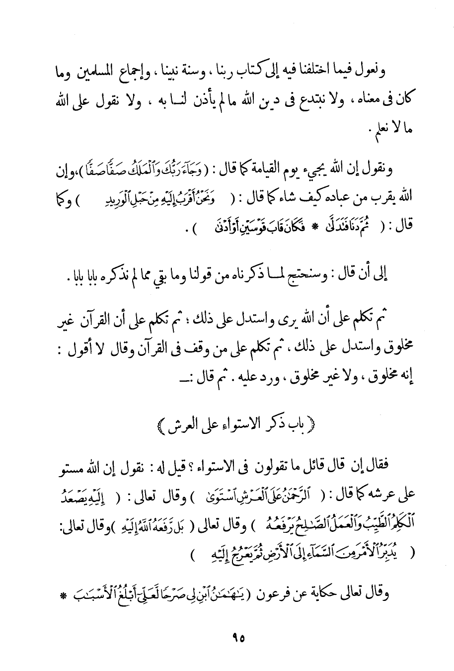 وَنُعَوِّلُ فِيمَا اخْتَلَفْنَا فِيهِ إلَى كِتَابِ رَبِّنَا وَسُنَّةِ نَبِيِّنَا وَإِجْمَاعِ الْمُسْلِمِينَ وَمَا كَانَ فِي مَعْنَاهُ وَلَا نَبْتَدِعُ فِي دِينِ اللَّهِ مَا لَمْ يَأْذَنْ لَنَا بِهِ وَلَا نَقُولُ عَلَى اللَّهِ مَا لَا نَعْلَمُ. وَنَقُولُ إنَّ اللَّهَ يَجِيءُ يَوْمَ الْقِيَامَةِ كَمَا قَالَ: {وَجَاءَ رَبُّكَ وَالْمَلَكُ صَفًّا صَفًّا} وَإِنَّ اللَّهَ يَقْرُبُ مِنْ عِبَادِهِ كَيْفَ شَاءَ كَمَا قَالَ: {وَنَحْنُ أَقْرَبُ إلَيْهِ مِنْ حَبْلِ الْوَرِيدِ} وَكَمَا قَالَ: {ثُمَّ دَنَا فَتَدَلَّى} {فَكَانَ قَابَ قَوْسَيْنِ أَوْ أَدْنَى} . إلَى أَنْ قَالَ: وَسَنَحْتَجُّ لِمَا ذَكَرْنَاهُ مِنْ قَوْلِنَا وَمَا بَقِيَ مِمَّا لَمْ نَذْكُرْهُ بَابًا بَابًا. ثُمَّ تَكَلَّمَ عَلَى أَنَّ اللَّهَ يُرَى وَاسْتَدَلَّ عَلَى ذَلِكَ؛ ثُمَّ تَكَلَّمَ عَلَى أَنَّ الْقُرْآنَ غَيْرُ مَخْلُوقٍ وَاسْتَدَلَّ عَلَى ذَلِكَ ثُمَّ تَكَلَّمَ عَلَى مَنْ وَقَفَ فِي الْقُرْآنِ وَقَالَ لَا أَقُولُ: إنَّهُ مَخْلُوقٌ وَلَا غَيْرُ مَخْلُوقٍ وَرَدَّ عَلَيْهِ. ثُمَّ قَالَ: (بَابُ ذِكْرِ الِاسْتِوَاءِ عَلَى الْعَرْشِ فَقَالَ إنَّ قَالَ قَائِلٌ مَا تَقُولُونَ فِي الِاسْتِوَاءِ؟ قِيلَ لَهُ: نَقُولُ إنَّ اللَّهَ مُسْتَوٍ عَلَى عَرْشِهِ كَمَا قَالَ: {الرَّحْمَنُ عَلَى الْعَرْشِ اسْتَوَى} وَقَالَ تَعَالَى: {إلَيْهِ يَصْعَدُ الْكَلِمُ الطَّيِّبُ وَالْعَمَلُ الصَّالِحُ يَرْفَعُهُ} وَقَالَ تَعَالَى {بَلْ رَفَعَهُ اللَّهُ إلَيْهِ} وَقَالَ تَعَالَى: {يُدَبِّرُ الْأَمْرَ مِنَ السَّمَاءِ إلَى الْأَرْضِ ثُمَّ يَعْرُجُ إلَيْهِ} وَقَالَ تَعَالَى حِكَايَةً عَنْ فِرْعَوْنَ {يَا هَامَانُ ابْنِ لِي صَرْحًا لَعَلِّي أَبْلُغُ الْأَسْبَابَ}
