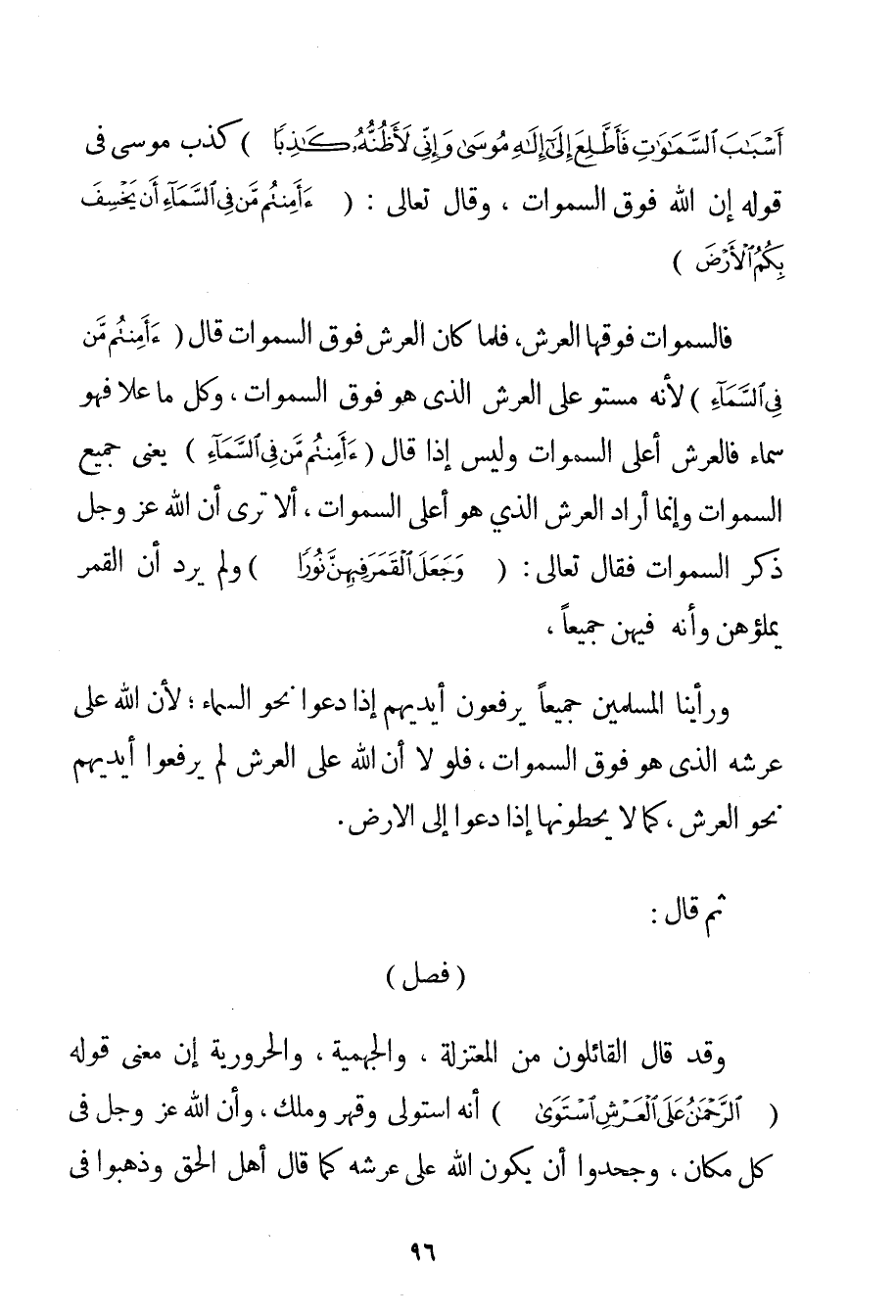 {أَسْبَابَ السَّمَاوَاتِ فَأَطَّلِعَ إلَى إلَهِ مُوسَى وَإِنِّي لَأَظُنُّهُ كَاذِبًا} كَذَّبَ مُوسَى فِي قَوْلِهِ إنَّ اللَّهَ فَوْقَ السَّمَوَاتِ وَقَالَ تَعَالَى: {أَأَمِنْتُمْ مَنْ فِي السَّمَاءِ أَنْ يَخْسِفَ بِكُمُ الْأَرْضَ} فَالسَّمَوَاتُ فَوْقَهَا الْعَرْشُ فَلَمَّا كَانَ الْعَرْشُ فَوْقَ السَّمَوَاتِ قَالَ {أَأَمِنْتُمْ مَنْ فِي السَّمَاءِ} لِأَنَّهُ مُسْتَوٍ عَلَى الْعَرْشِ الَّذِي هُوَ فَوْقَ السَّمَوَاتِ وَكُلُّ مَا عَلَا فَهُوَ سَمَاءٌ فَالْعَرْشُ أَعْلَى السَّمَوَاتِ وَلَيْسَ إذَا قَالَ {أَأَمِنْتُمْ مَنْ فِي السَّمَاءِ} يَعْنِي جَمِيعَ السَّمَوَاتِ وَإِنَّمَا أَرَادَ الْعَرْشَ الَّذِي هُوَ أَعْلَى السَّمَوَاتِ أَلَا تَرَى أَنَّ اللَّهَ عَزَّ وَجَلَّ ذَكَرَ السَّمَوَاتِ فَقَالَ تَعَالَى: {وَجَعَلَ الْقَمَرَ فِيهِنَّ نُورًا} وَلَمْ يُرِدْ أَنَّ الْقَمَرَ يَمْلَؤُهُنَّ وَأَنَّهُ فِيهِنَّ جَمِيعًا وَرَأَيْنَا الْمُسْلِمِينَ جَمِيعًا يَرْفَعُونَ أَيْدِيَهُمْ إذَا دَعَوْا نَحْوَ السَّمَاءِ: لِأَنَّ اللَّهَ عَلَى عَرْشِهِ الَّذِي هُوَ فَوْقَ السَّمَوَاتِ فَلَوْلَا أَنَّ اللَّهَ عَلَى الْعَرْشِ لَمْ يَرْفَعُوا أَيْدِيَهُمْ نَحْوَ الْعَرْشِ كَمَا لَا يَحُطُّونَهَا إذَا دَعَوْا إلَى الْأَرْضِ. ثُمَّ قَالَ: