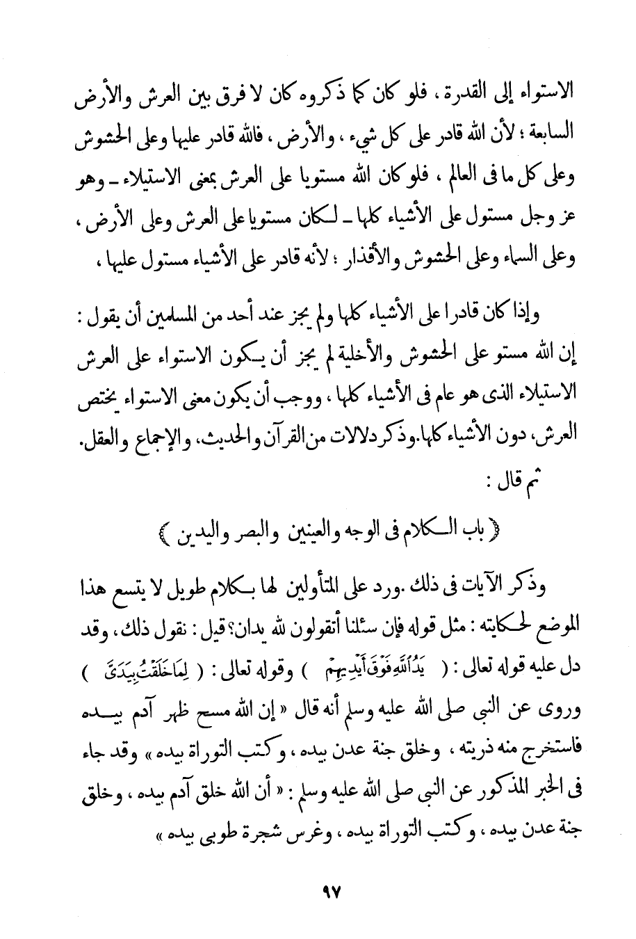 الِاسْتِوَاءِ إلَى الْقُدْرَةِ فَلَوْ كَانَ كَمَا ذَكَرُوهُ كَانَ لَا فَرْقَ بَيْنَ الْعَرْشِ وَالْأَرْضِ السَّابِعَةِ؛ لِأَنَّ اللَّهَ قَادِرٌ عَلَى كُلِّ شَيْءٍ وَالْأَرْضِ فَاَللَّهُ قَادِرٌ عَلَيْهَا وَعَلَى الْحُشُوشِ وَعَلَى كُلِّ مَا فِي الْعَالَمِ فَلَوْ كَانَ اللَّهُ مُسْتَوِيًا عَلَى الْعَرْشِ بِمَعْنَى الِاسْتِيلَاءِ - وَهُوَ عَزَّ وَجَلَّ مُسْتَوْلٍ عَلَى الْأَشْيَاءِ كُلِّهَا - لَكَانَ مُسْتَوِيًا عَلَى الْعَرْشِ وَعَلَى الْأَرْضِ وَعَلَى السَّمَاءِ وَعَلَى الْحُشُوشِ وَالْأَقْذَارِ؛ لِأَنَّهُ قَادِرٌ عَلَى الْأَشْيَاءِ مُسْتَوْلٍ عَلَيْهَا وَإِذَا كَانَ قَادِرًا عَلَى الْأَشْيَاءِ كُلِّهَا وَلَمْ يَجُزْ عِنْدَ أَحَدٍ مِنْ الْمُسْلِمِينَ أَنْ يَقُولَ: إنَّ اللَّهَ مُسْتَوٍ عَلَى الْحُشُوشِ والأخلية لَمْ يَجُزْ أَنْ يَكُونَ الِاسْتِوَاءُ عَلَى الْعَرْشِ الِاسْتِيلَاءَ الَّذِي هُوَ عَامٌّ فِي الْأَشْيَاءِ كُلِّهَا وَوَجَبَ أَنْ يَكُونَ مَعْنَى الِاسْتِوَاءِ يَخْتَصُّ الْعَرْشَ دُونَ الْأَشْيَاءِ كُلِّهَا. وَذَكَرَ دَلَالَاتٍ مِنْ الْقُرْآنِ وَالْحَدِيثِ وَالْإِجْمَاعِ وَالْعَقْلِ. ثُمَّ قَالَ: (بَابُ الْكَلَامِ فِي الْوَجْهِ وَالْعَيْنَيْنِ وَالْبَصَرِ وَالْيَدَيْنِ وَذِكْرِ الْآيَاتِ فِي ذَلِكَ. وَرَدَّ عَلَى الْمُتَأَوِّلِينَ لَهَا بِكَلَامِ طَوِيلٍ لَا يَتَّسِعُ هَذَا الْمَوْضِعُ لِحِكَايَتِهِ: مِثْلُ قَوْلِهِ فَإِنْ سُئِلْنَا أَتَقُولُونَ لِلَّهِ يَدَانِ؟ قِيلَ: نَقُولُ ذَلِكَ وَقَدْ دَلَّ عَلَيْهِ قَوْلُهُ تَعَالَى: {يَدُ اللَّهِ فَوْقَ أَيْدِيهِمْ} وقَوْله تَعَالَى {لِمَا خَلَقْتُ بِيَدَيَّ} وَرُوِيَ عَنْ النَّبِيِّ صَلَّى اللَّهُ عَلَيْهِ وَسَلَّمَ أَنَّهُ قَالَ {إنَّ اللَّهَ مَسَحَ ظَهْرَ آدَمَ بِيَدِهِ فَاسْتَخْرَجَ مِنْهُ ذُرِّيَّتَهُ وَخَلَقَ جَنَّةَ عَدْنٍ بِيَدِهِ وَكَتَبَ التَّوْرَاةَ بِيَدِهِ} وَقَدْ جَاءَ فِي الْخَبَرِ الْمَذْكُورِ عَنْ النَّبِيِّ صَلَّى اللَّهُ عَلَيْهِ وَسَلَّمَ {أَنَّ اللَّهَ خَلَقَ آدَمَ بِيَدِهِ وَخَلَقَ جَنَّةَ عَدْنٍ بِيَدِهِ وَكَتَبَ التَّوْرَاةَ بِيَدِهِ وَغَرَسَ شَجَرَةَ طُوبَى بِيَدِهِ}