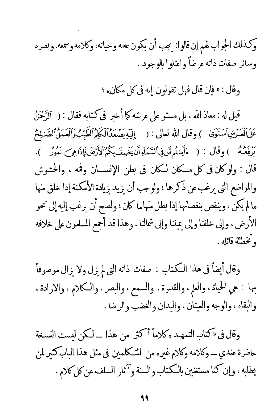 وَكَذَلِكَ الْجَوَابُ لَهُمْ إنْ قَالُوا: يَجِبُ أَنْ يَكُونَ عِلْمُهُ وَحَيَاتُهُ وَكَلَامُهُ وَسَمْعُهُ وَبَصَرُهُ وَسَائِرُ صِفَاتِ ذَاتِهِ عَرَضًا وَاعْتَلُّوا بِالْوُجُودِ. وَقَالَ: " فَإِنْ قَالَ فَهَلْ تَقُولُونَ إنَّهُ فِي كُلِّ مَكَانٍ "؟ . قِيلَ لَهُ: مَعَاذَ اللَّهِ بَلْ مُسْتَوٍ عَلَى عَرْشِهِ كَمَا أَخْبَرَ فِي كِتَابِهِ فَقَالَ: {الرَّحْمَنُ عَلَى الْعَرْشِ اسْتَوَى} وَقَالَ اللَّهُ تَعَالَى: {إلَيْهِ يَصْعَدُ الْكَلِمُ الطَّيِّبُ وَالْعَمَلُ الصَّالِحُ يَرْفَعُهُ} وَقَالَ: {أَأَمِنْتُمْ مَنْ فِي السَّمَاءِ أَنْ يَخْسِفَ بِكُمُ الْأَرْضَ فَإِذَا هِيَ تَمُورُ} . قَالَ: وَلَوْ كَانَ فِي كُلِّ مَكَانٍ لَكَانَ فِي بَطْنِ الْإِنْسَانِ وَفَمِهِ وَالْحُشُوشِ وَالْمَوَاضِعِ الَّتِي يَرْغَبُ عَنْ ذِكْرِهَا؛ وَلَوَجَبَ أَنْ يَزِيدَ بِزِيَادَةِ الْأَمْكِنَةِ إذَا خَلَقَ مِنْهَا مَا لَمْ يَكُنْ وَيَنْقُصُ بِنُقْصَانِهَا إذَا بَطَلَ مِنْهَا مَا كَانَ؛ وَلَصَحَّ أَنْ يَرْغَبَ إلَيْهِ إلَى نَحْوِ الْأَرْضِ وَإِلَى خَلْفِنَا وَإِلَى يَمِينِنَا وَإِلَى شِمَالِنَا وَهَذَا قَدْ أَجْمَعَ الْمُسْلِمُونَ عَلَى خِلَافِهِ وَتَخْطِئَةِ قَائِلِهِ. وَقَالَ أَيْضًا فِي هَذَا الْكِتَابِ: صِفَاتُ ذَاتِهِ الَّتِي لَمْ يَزَلْ وَلَا يَزَالُ مَوْصُوفًا بِهَا: هِيَ الْحَيَاةُ وَالْعِلْمُ وَالْقُدْرَةُ وَالسَّمْعُ وَالْبَصَرُ وَالْكَلَامُ وَالْإِرَادَةُ وَالْبَقَاءُ وَالْوَجْهُ وَالْعَيْنَانِ وَالْيَدَانِ وَالْغَضَبُ وَالرِّضَا. وَقَالَ فِي " كِتَابِ التَّمْهِيدِ " كَلَامًا أَكْثَرَ مِنْ هَذَا - لَكِنْ لَيْسَتْ النُّسْخَةُ حَاضِرَةً عِنْدِي - وَكَلَامُهُ وَكَلَامُ غَيْرِهِ مِنْ الْمُتَكَلِّمِينَ فِي مِثْلِ هَذَا الْبَابِ كَثِيرٌ لِمَنْ يَطْلُبُهُ وَإِنْ كُنَّا مُسْتَغْنِينَ بِالْكِتَابِ وَالسُّنَّةِ وَآثَارِ السَّلَفِ عَنْ كُلِّ كَلَامٍ.