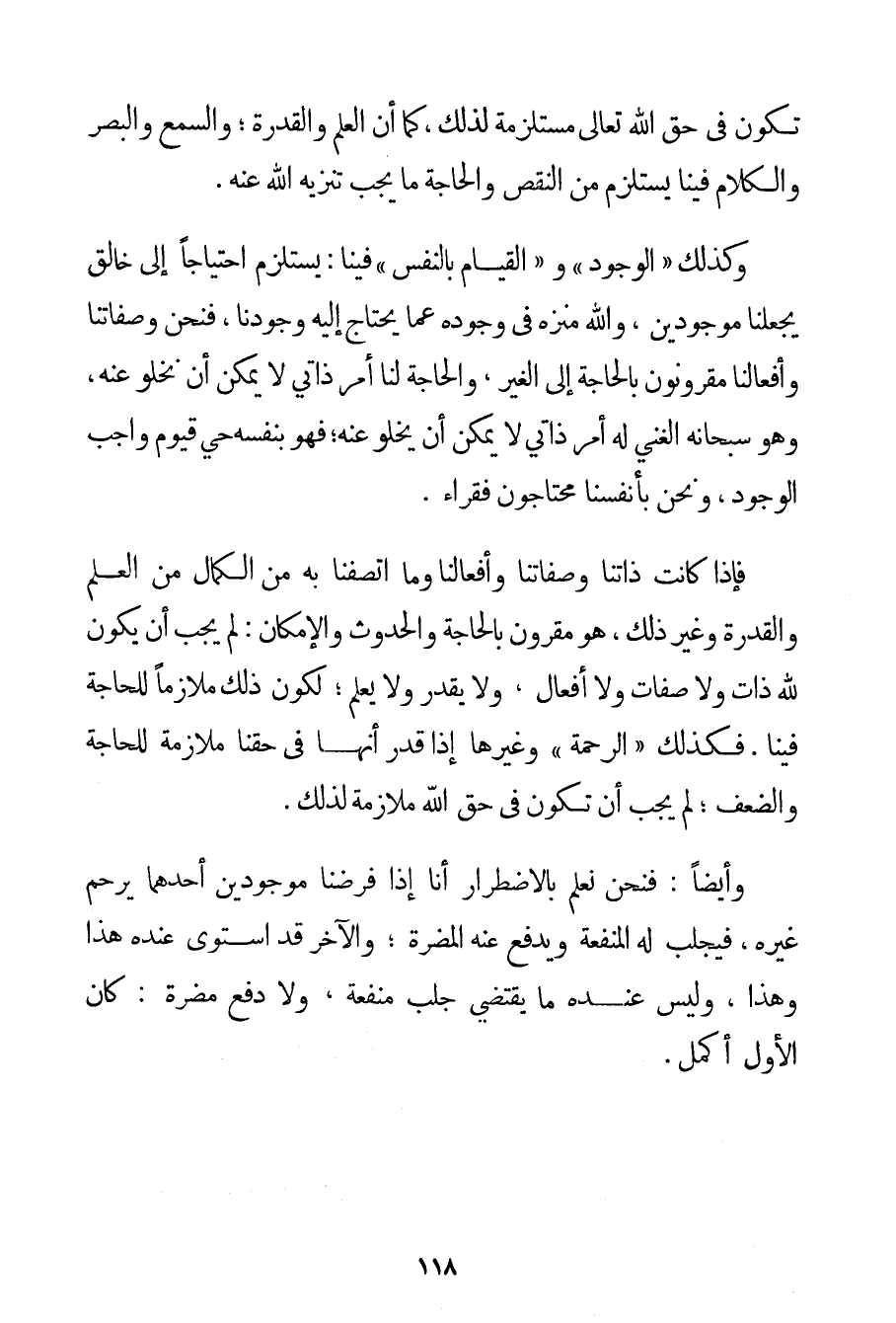 وَأَيْضًا: فَلَوْ قُدِّرَ أَنَّهَا فِي حَقِّ الْمَخْلُوقِينَ مُسْتَلْزِمَةٌ لِذَلِكَ لَمْ يَجِبْ أَنْ تَكُونَ فِي حَقِّ اللَّهِ تَعَالَى مُسْتَلْزِمَةً لِذَلِكَ كَمَا أَنَّ الْعِلْمَ وَالْقُدْرَةَ؛ وَالسَّمْعَ وَالْبَصَرَ وَالْكَلَامَ فِينَا يَسْتَلْزِمُ مِنْ النَّقْصِ وَالْحَاجَةِ مَا يَجِبُ تَنْزِيهُ اللَّهِ عَنْهُ. وَكَذَلِكَ " الْوُجُودُ " وَ " الْقِيَامُ بِالنَّفْسِ " فِينَا: يَسْتَلْزِمُ احْتِيَاجًا إلَى خَالِقٍ يَجْعَلُنَا مَوْجُودِينَ وَاَللَّهُ مُنَزَّهٌ فِي وُجُودِهِ عَمَّا يَحْتَاجُ إلَيْهِ وُجُودُنَا فَنَحْنُ وَصِفَاتُنَا وَأَفْعَالُنَا مَقْرُونُونَ بِالْحَاجَةِ إلَى الْغَيْرِ وَالْحَاجَةُ لَنَا أَمْرٌ ذَاتِيٌّ لَا يُمْكِنُ أَنْ نَخْلُوَ عَنْهُ وَهُوَ سُبْحَانَهُ الْغَنِيُّ لَهُ أَمْرٌ ذَاتِيٌّ لَا يُمْكِنُ أَنْ يَخْلُوَ عَنْهُ؛ فَهُوَ بِنَفْسِهِ حَيٌّ قَيُّومٌ وَاجِبُ الْوُجُودِ وَنَحْنُ بِأَنْفُسِنَا مُحْتَاجُونَ فُقَرَاءُ. فَإِذَا كَانَتْ ذَاتُنَا وَصِفَاتُنَا وَأَفْعَالُنَا وَمَا اتَّصَفْنَا بِهِ مِنْ الْكَمَالِ مِنْ الْعِلْمِ وَالْقُدْرَةِ وَغَيْرِ ذَلِكَ هُوَ مَقْرُونٌ بِالْحَاجَةِ وَالْحُدُوثِ وَالْإِمْكَانِ: لَمْ يَجِبْ أَنْ يَكُونَ لِلَّهِ ذَاتٌ وَلَا صِفَاتٌ وَلَا أَفْعَالٌ وَلَا يَقْدِرُ وَلَا يَعْلَمُ؛ لِكَوْنِ ذَلِكَ مُلَازِمًا لِلْحَاجَةِ فِينَا. فَكَذَلِكَ " الرَّحْمَةُ " وَغَيْرُهَا إذَا قُدِّرَ أَنَّهَا فِي حَقِّنَا مُلَازِمَةٌ لِلْحَاجَةِ وَالضَّعْفِ؛ لَمْ يَجِبْ أَنْ تَكُونَ فِي حَقِّ اللَّهِ مُلَازِمَةً لِذَلِكَ. وَأَيْضًا: فَنَحْنُ نَعْلَمُ بِالِاضْطِرَارِ أَنَّا إذَا فَرَضْنَا مَوْجُودَيْنِ أَحَدُهُمَا يَرْحَمُ غَيْرَهُ فَيَجْلُبُ لَهُ الْمَنْفَعَةَ وَيَدْفَعُ عَنْهُ الْمَضَرَّةَ؛ وَالْآخَرُ قَدْ اسْتَوَى عِنْدَهُ هَذَا وَهَذَا وَلَيْسَ عِنْدَهُ مَا يَقْتَضِي جَلْبَ مَنْفَعَةٍ وَلَا دَفْعَ مَضَرَّةٍ: كَانَ الْأَوَّلُ أَكْمَلَ.