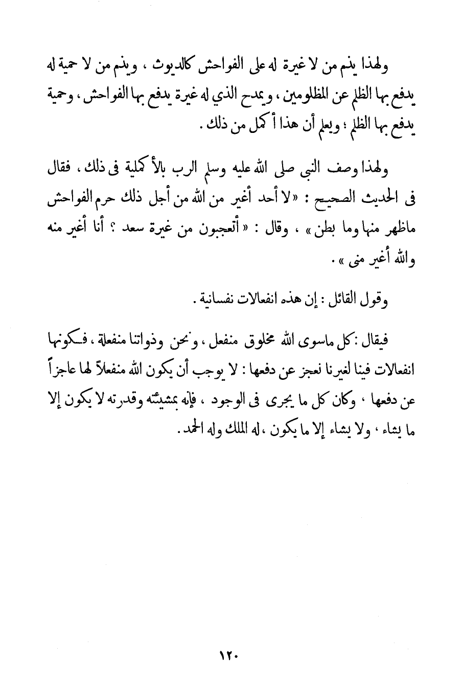 وَلِهَذَا يُذَمُّ مَنْ لَا غَيْرَةَ لَهُ عَلَى الْفَوَاحِشِ كَالدَّيُّوثِ وَيُذَمُّ مَنْ لَا حَمِيَّةَ لَهُ يَدْفَعُ بِهَا الظُّلْمَ عَنْ الْمَظْلُومِينَ وَيَمْدَحُ الَّذِي لَهُ غَيْرَةٌ يَدْفَعُ بِهَا الْفَوَاحِشَ وَحَمِيَّةٌ يَدْفَعُ بِهَا الظُّلْمَ؛ وَيُعْلَمُ أَنَّ هَذَا أَكْمَلُ مِنْ ذَلِكَ. وَلِهَذَا وَصَفَ النَّبِيُّ صَلَّى اللَّهُ عَلَيْهِ وَسَلَّمَ الرَّبَّ بالأكملية فِي ذَلِكَ فَقَالَ فِي الْحَدِيثِ الصَّحِيحِ: {لَا أَحَدَ أَغْيَرُ مِنْ اللَّهِ مِنْ أَجْلِ ذَلِكَ حَرَّمَ الْفَوَاحِشَ مَا ظَهَرَ مِنْهَا وَمَا بَطَنَ} وَقَالَ: {أَتَعْجَبُونَ مِنْ غَيْرَةِ سَعْدٍ؟ أَنَا أَغْيَرُ مِنْهُ وَاَللَّهُ أَغْيَرُ مِنِّي} . وَقَوْلُ الْقَائِلِ: إنَّ هَذِهِ انْفِعَالَاتٌ نَفْسَانِيَّةٌ. فَيُقَالُ: كُلُّ مَا سِوَى اللَّهِ مَخْلُوقٌ مُنْفَعِلٌ وَنَحْنُ وَذَوَاتُنَا مُنْفَعِلَةٌ فَكَوْنُهَا انْفِعَالَاتٍ فِينَا لِغَيْرِنَا نَعْجِزُ عَنْ دَفْعِهَا: لَا يُوجِبُ أَنْ يَكُونَ اللَّهُ مُنْفَعِلًا لَهَا عَاجِزًا عَنْ دَفْعِهَا وَكَانَ كُلُّ مَا يَجْرِي فِي الْوُجُودِ فَإِنَّهُ بِمَشِيئَتِهِ وَقُدْرَتِهِ لَا يَكُونُ إلَّا مَا يَشَاءُ وَلَا يَشَاءُ إلَّا مَا يَكُونُ لَهُ الْمُلْكُ وَلَهُ الْحَمْدُ.