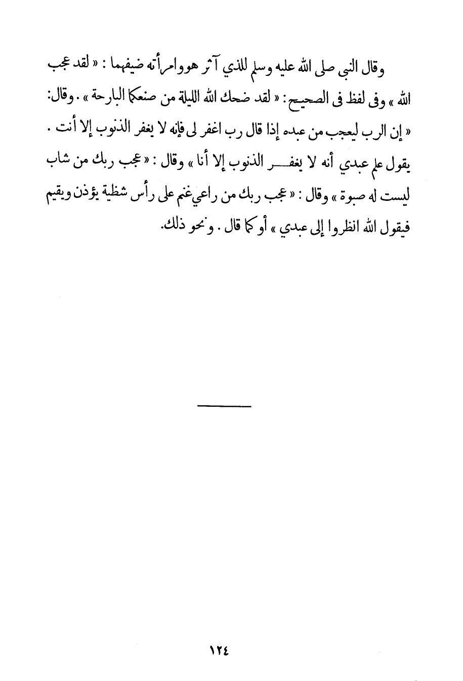 {وَقَالَ النَّبِيُّ صَلَّى اللَّهُ عَلَيْهِ وَسَلَّمَ لِلَّذِي آثَرَ هُوَ وَامْرَأَتُهُ ضَيْفَهُمَا: لَقَدْ عَجِبَ اللَّهُ} وَفِي لَفْظٍ فِي الصَّحِيحِ: {لَقَدْ ضَحِكَ اللَّهُ اللَّيْلَةَ مِنْ صُنْعِكُمَا الْبَارِحَةَ} . وَقَالَ: {إنَّ الرَّبَّ لَيَعْجَبُ مِنْ عَبْدِهِ إذَا قَالَ رَبِّ اغْفِرْ لِي فَإِنَّهُ لَا يَغْفِرُ الذُّنُوبَ إلَّا أَنْتَ. يَقُولُ عَلِمَ عَبْدِي أَنَّهُ لَا يَغْفِرُ الذُّنُوبَ إلَّا أَنَا} وَقَالَ: {عَجِبَ رَبُّك مِنْ شَابٍّ لَيْسَتْ لَهُ صَبْوَةٌ} وَقَالَ: {عَجِبَ رَبُّك مِنْ رَاعِي غَنَمٍ عَلَى رَأْسِ شَظِيَّةٍ يُؤَذِّنُ وَيُقِيمُ فَيَقُولُ اللَّهُ اُنْظُرُوا إلَى عَبْدِي} أَوْ كَمَا قَالَ. وَنَحْوَ ذَلِكَ.