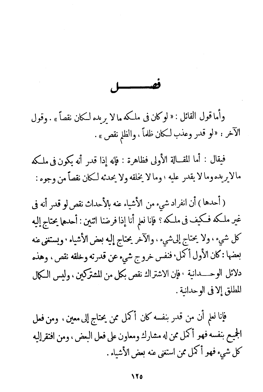 وَأَمَّا قَوْلُ الْقَائِلِ: " لَوْ كَانَ فِي مُلْكِهِ مَا لَا يُرِيدُهُ لَكَانَ نَقْصًا ". وَقَوْلُ الْآخَرِ: " لَوْ قَدَرَ وَعَذَّبَ لَكَانَ ظُلْمًا وَالظُّلْمُ نَقْصٌ ". فَيُقَالُ: أَمَّا الْمَقَالَةُ الْأُولَى فَظَاهِرَةٌ: فَإِنَّهُ إذَا قُدِّرَ أَنَّهُ يَكُونُ فِي مُلْكِهِ مَا لَا يُرِيدُهُ وَمَا لَا يَقْدِرُ عَلَيْهِ؛ وَمَا لَا يَخْلُقُهُ وَلَا يُحْدِثُهُ لَكَانَ نَقْصًا مِنْ وُجُوهٍ: (أَحَدُهَا أَنَّ انْفِرَادَ شَيْءٍ مِنْ الْأَشْيَاءِ عَنْهُ بِالْأَحْدَاثِ نَقْصٌ لَوْ قُدِّرَ أَنَّهُ فِي غَيْرِ مُلْكِهِ فَكَيْفَ فِي مُلْكِهِ؟ فَإِنَّا نَعْلَمُ أَنَّا إذَا فَرَضْنَا اثْنَيْنِ: أَحَدُهُمَا يَحْتَاجُ إلَيْهِ كُلُّ شَيْءٍ وَلَا يَحْتَاجُ إلَى شَيْءٍ وَالْآخَرُ يَحْتَاجُ إلَيْهِ بَعْضُ الْأَشْيَاءِ وَيَسْتَغْنِي عَنْهُ بَعْضُهَا: كَانَ الْأَوَّلُ أَكْمَلَ فَنَفْسُ خُرُوجِ شَيْءٍ عَنْ قُدْرَتِهِ وَخَلْقِهِ نَقْصٌ وَهَذِهِ دَلَائِلُ الْوَحْدَانِيَّةِ فَإِنَّ الِاشْتِرَاكَ نَقْصٌ بِكُلِّ مِنْ الْمُشْتَرِكَيْنِ وَلَيْسَ الْكَمَالُ الْمُطْلَقُ إلَّا فِي الْوَحْدَانِيَّةِ. فَإِنَّا نَعْلَمُ أَنَّ مَنْ قَدَرَ بِنَفْسِهِ كَانَ أَكْمَلَ مِمَّنْ يَحْتَاجُ إلَى مُعِينٍ وَمَنْ فَعَلَ الْجَمِيعَ بِنَفْسِهِ فَهُوَ أَكْمَلُ مِمَّنْ لَهُ مُشَارِكٌ وَمُعَاوِنٌ عَلَى فِعْلِ الْبَعْضِ وَمَنْ افْتَقَرَ إلَيْهِ كُلُّ شَيْءٍ فَهُوَ أَكْمَلُ مِمَّنْ اسْتَغْنَى عَنْهُ بَعْضُ الْأَشْيَاءِ.