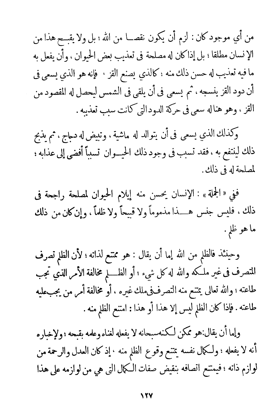 مِنْ أَيِّ مَوْجُودٍ كَانَ: لَزِمَ أَنْ يَكُونَ نَقْصًا مِنْ اللَّهِ؛ بَلْ وَلَا يَقْبُحُ هَذَا مِنْ الْإِنْسَانِ مُطْلَقًا؛ بَلْ إذَا كَانَ لَهُ مَصْلَحَةٌ فِي تَعْذِيبِ بَعْضِ الْحَيَوَانِ وَأَنْ يَفْعَلَ بِهِ مَا فِيهِ تَعْذِيبٌ لَهُ حَسُنَ ذَلِكَ مِنْهُ؛ كَاَلَّذِي يَصْنَعُ الْقَزَّ فَإِنَّهُ هُوَ الَّذِي يَسْعَى فِي أَنَّ دُودَ الْقَزِّ يَنْسِجُهُ ثُمَّ يَسْعَى فِي أَنْ يُلْقَى فِي الشَّمْسِ لِيَحْصُلَ لَهُ الْمَقْصُودُ مِنْ الْقَزِّ وَهُوَ هُنَا لَهُ سَعْيٌ فِي حَرَكَةِ الدُّودِ الَّتِي كَانَتْ سَبَبَ تَعْذِيبِهِ. وَكَذَلِكَ الَّذِي يَسْعَى فِي أَنْ يَتَوَالَدَ لَهُ مَاشِيَةٌ وَتَبِيضَ لَهُ دَجَاجٌ ثُمَّ يَذْبَحُ ذَلِكَ لِيَنْتَفِعَ بِهِ فَقَدْ تَسَبَّبَ فِي وُجُودِ ذَلِكَ الْحَيَوَانِ تَسَبُّبًا أَفْضَى إلَى عَذَابِهِ؛ لِمَصْلَحَةِ لَهُ فِي ذَلِكَ. فَفِي " الْجُمْلَةِ ": الْإِنْسَانُ يَحْسُنُ مِنْهُ إيلَامُ الْحَيَوَانِ لِمَصْلَحَةِ رَاجِحَةٍ فِي ذَلِكَ فَلَيْسَ جِنْسُ هَذَا مَذْمُومًا وَلَا قَبِيحًا وَلَا ظُلْمًا وَإِنْ كَانَ مِنْ ذَلِكَ مَا هُوَ ظُلْمٌ. وَحِينَئِذٍ فَالظُّلْمُ مِنْ اللَّهِ إمَّا أَنْ يُقَالَ: هُوَ مُمْتَنِعٌ لِذَاتِهِ؛ لِأَنَّ الظُّلْمَ تَصَرُّفُ الْمُتَصَرِّفِ فِي غَيْرِ مِلْكِهِ وَاَللَّهُ لَهُ كُلُّ شَيْءٍ؛ أَوْ الظُّلْمُ مُخَالَفَةُ الْأَمْرِ الَّذِي تَجِبُ طَاعَتُهُ؛ وَاَللَّهُ تَعَالَى يَمْتَنِعُ مِنْهُ التَّصَرُّفُ فِي مِلْكِ غَيْرِهِ أَوْ مُخَالَفَةُ أَمْرِ مَنْ يَجِبُ عَلَيْهِ طَاعَتُهُ. فَإِذَا كَانَ الظُّلْمُ لَيْسَ إلَّا هَذَا أَوْ هَذَا: امْتَنَعَ الظُّلْمُ مِنْهُ. وَإِمَّا أَنْ يُقَالَ: هُوَ مُمْكِنٌ لَكِنَّهُ سُبْحَانَهُ لَا يَفْعَلُهُ لِغِنَاهُ وَعِلْمِهِ بِقُبْحِهِ؛ وَلِإِخْبَارِهِ أَنَّهُ لَا يَفْعَلُهُ؛ وَلِكَمَالِ نَفْسِهِ يَمْتَنِعُ وُقُوعُ الظُّلْمِ مِنْهُ إذْ كَانَ الْعَدْلُ وَالرَّحْمَةُ مِنْ لَوَازِمِ ذَاتِهِ؛ فَيَمْتَنِعُ اتِّصَافُهُ بِنَقِيضِ صِفَاتِ الْكَمَالِ الَّتِي هِيَ مِنْ لَوَازِمِهِ عَلَى هَذَا