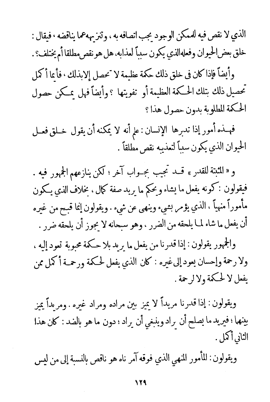 الَّذِي لَا نَقْصَ فِيهِ لِلْمُمْكِنِ الْوُجُودَ يَجِبُ اتِّصَافُهُ بِهِ وَتَنْزِيهُهُ عَمَّا يُنَاقِضُهُ فَيُقَالُ: خَلْقُ بَعْضِ الْحَيَوَانِ وَفِعْلُهُ الَّذِي يَكُونُ سَبَبًا لِعَذَابِهِ هَلْ هُوَ نَقْصٌ مُطْلَقًا أَمْ يَخْتَلِفُ؟ . وَأَيْضًا فَإِذَا كَانَ فِي خَلْقِ ذَلِكَ حِكْمَةٌ عَظِيمَةٌ لَا تَحْصُلُ إلَّا بِذَلِكَ فَأَيُّمَا أَكْمَلُ تَحْصِيلُ ذَلِكَ بِتِلْكَ الْحِكْمَةِ الْعَظِيمَةِ أَوْ تَفْوِيتُهَا؟ وَأَيْضًا فَهَلْ يُمْكِنُ حُصُولُ الْحِكْمَةِ الْمَطْلُوبَةِ بِدُونِ حُصُولِ هَذَا؟ فَهَذِهِ أُمُورٌ إذَا تَدَبَّرَهَا الْإِنْسَانُ؛ عَلِمَ أَنَّهُ لَا يُمْكِنُهُ أَنْ يَقُولَ خَلْقُ فِعْلِ الْحَيَوَانِ الَّذِي يَكُونُ سَبَبًا لِتَعْذِيبِهِ نَقْصٌ مُطْلَقًا. وَ " الْمُثْبِتَةُ لِلْقَدَرِ " قَدْ تُجِيبُ بِجَوَابِ آخَرَ؛ لَكِنْ يُنَازِعُهُمْ الْجُمْهُورُ فِيهِ. فَيَقُولُونَ: كَوْنُهُ يَفْعَلُ مَا يَشَاءُ وَيُحْكِمُ مَا يُرِيدُ صِفَةَ كَمَالٍ بِخِلَافِ الَّذِي يَكُونُ مَأْمُورًا مَنْهِيًّا الَّذِي يُؤْمَرُ بِشَيْءِ وَيُنْهَى عَنْ شَيْءٍ. وَيَقُولُونَ إنَّمَا قَبُحَ مِنْ غَيْرِهِ أَنْ يَفْعَلَ مَا شَاءَ لِمَا يَلْحَقُهُ مِنْ الضَّرَرِ وَهُوَ سُبْحَانَهُ لَا يَجُوزُ أَنْ يَلْحَقَهُ ضَرَرٌ. وَالْجُمْهُورُ يَقُولُونَ: إذَا قَدَّرْنَا مَنْ يَفْعَلُ مَا يُرِيدُ بِلَا حِكْمَةٍ مَحْبُوبَةٍ تَعُودُ إلَيْهِ وَلَا رَحْمَةٍ وَإِحْسَانٍ يَعُودُ إلَى غَيْرِهِ: كَانَ الَّذِي يَفْعَلُ لِحِكْمَةِ وَرَحْمَةٍ أَكْمَل مِمَّنْ يَفْعَلُ لَا لِحِكْمَةِ وَلَا لِرَحْمَةِ. وَيَقُولُونَ: إذَا قَدَّرْنَا مُرِيدًا لَا يُمَيِّزُ بَيْنَ مُرَادِهِ وَمُرَادِ غَيْرِهِ. وَمُرِيدًا يُمَيِّزُ بَيْنَهُمَا؛ فَيُرِيدُ مَا يَصْلُحُ أَنْ يُرَادَ وَيَنْبَغِي أَنْ يُرَادَ؛ دُونَ مَا هُوَ بِالضِّدِّ: كَانَ هَذَا الثَّانِي أَكْمَلَ. وَيَقُولُونَ: الْمَأْمُورُ الْمَنْهِيُّ الَّذِي فَوْقَهُ آمِرٌ نَاهٍ هُوَ نَاقِصٌ بِالنِّسْبَةِ إلَى مَنْ لَيْسَ