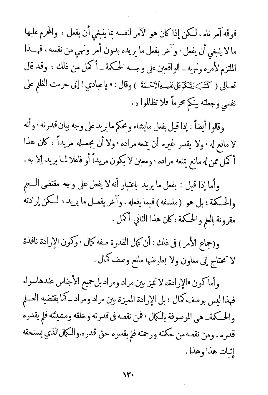 فَوْقَهُ آمِرٌ نَاهٍ لَكِنْ إذَا كَانَ هُوَ الْآمِرَ لِنَفْسِهِ بِمَا يَنْبَغِي أَنْ يَفْعَلَ وَالْمُحَرِّمَ عَلَيْهَا مَا لَا يَنْبَغِي أَنْ يَفْعَلَ وَآخَرُ يَفْعَلُ مَا يُرِيدُهُ بِدُونِ أَمْرٍ وَنَهْيٍ مِنْ نَفْسِهِ فَهَذَا الْمُلْتَزِمُ لِأَمْرِهِ وَنَهْيِهِ - الْوَاقِعَيْنِ عَلَى وَجْهِ الْحِكْمَةِ - أَكْمَل مِنْ ذَلِكَ؛ وَقَدْ قَالَ تَعَالَى {كَتَبَ رَبُّكُمْ عَلَى نَفْسِهِ الرَّحْمَةَ} وَقَالَ: {يَا عِبَادِي إنِّي حَرَّمْت الظُّلْمَ عَلَى نَفْسِي وَجَعَلْته بَيْنَكُمْ مُحَرَّمًا فَلَا تظالموا} . وَقَالُوا أَيْضًا: إذَا قِيلَ يَفْعَلُ مَا يَشَاءُ وَيَحْكُمُ مَا يُرِيدُ عَلَى وَجْهِ بَيَانِ قُدْرَتِهِ وَأَنَّهُ لَا مَانِعَ لَهُ وَلَا يَقْدِرُ غَيْرُهُ أَنْ يَمْنَعَهُ مُرَادَهُ وَلَا أَنْ يَجْعَلَهُ مُرِيدًا كَانَ هَذَا أَكْمَلَ مِمَّنْ لَهُ مَانِعٌ يَمْنَعُهُ مُرَادَهُ وَمُعِينٌ لَا يَكُونُ مُرِيدًا أَوْ فَاعِلًا لِمَا يُرِيدُ إلَّا بِهِ. وَأَمَّا إذَا قِيلَ: يَفْعَلُ مَا يُرِيدُ بِاعْتِبَارِ أَنَّهُ لَا يَفْعَلُ عَلَى وَجْهِ مُقْتَضَى الْعِلْمِ وَالْحِكْمَةِ؛ بَلْ هُوَ (مُتَسَفِّهٌ فِيمَا يَفْعَلُهُ وَآخَرُ يَفْعَلُ مَا يُرِيدُ؛ لَكِنَّ إرَادَتَهُ مَقْرُونَةٌ بِالْعِلْمِ وَالْحِكْمَةِ؛ كَانَ هَذَا الثَّانِي أَكْمَلَ. وَ (جِمَاعُ الْأَمْرِ فِي ذَلِكَ: أَنَّ كَمَالَ الْقُدْرَةِ صِفَةُ كَمَالٍ وَكَوْنُ الْإِرَادَةِ نَافِذَةً لَا تَحْتَاجُ إلَى مُعَاوِنٍ وَلَا يُعَارِضُهَا مَانِعٌ وَصْفُ كَمَالٍ. وَأَمَّا كَوْنُ " الْإِرَادَةِ " لَا تُمَيِّزُ بَيْنَ مُرَادٍ وَمُرَادٍ بَلْ جَمِيعُ الْأَجْنَاسِ عِنْدَهَا سَوَاءٌ فَهَذَا لَيْسَ بِوَصْفِ كَمَالٍ؛ بَلْ الْإِرَادَةُ الْمُمَيِّزَةُ بَيْنَ مُرَادٍ وَمُرَادٍ - كَمَا يَقْتَضِيهِ الْعِلْمُ وَالْحِكْمَةُ - هِيَ الْمَوْصُوفَةُ بِالْكَمَالِ فَمَنْ نَقَصَهُ فِي قُدْرَتِهِ وَخَلْقِهِ وَمَشِيئَتِهِ فَلَمْ يُقَدِّرْهُ قَدْرَهُ. وَمَنْ نَقَصَهُ مِنْ حِكْمَتِهِ وَرَحْمَتِهِ فَلَمْ يُقَدِّرْهُ حَقَّ قَدْرِهِ. وَالْكَمَالُ الَّذِي يَسْتَحِقُّهُ إثْبَاتُ هَذَا وَهَذَا.