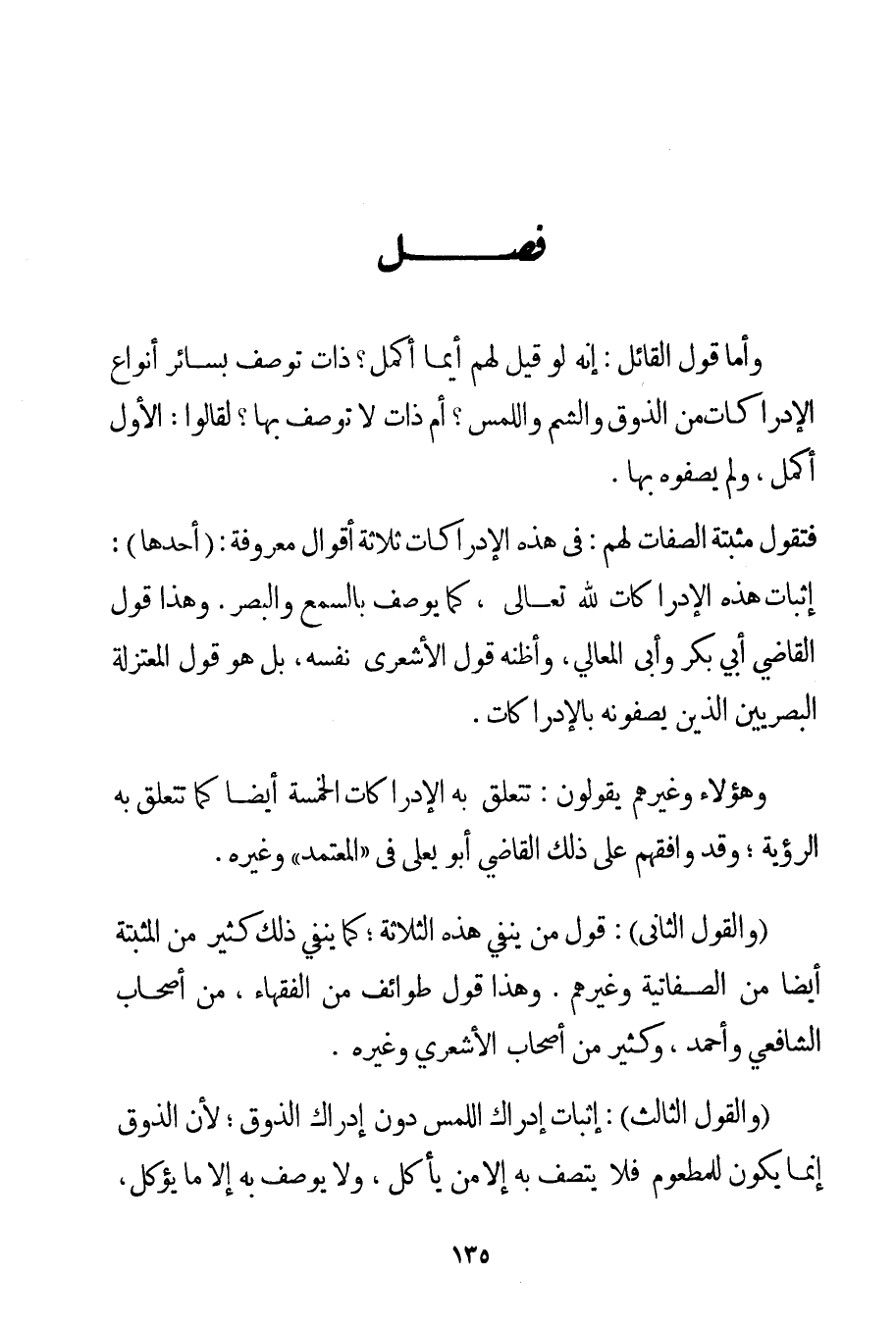وَأَمَّا قَوْلُ الْقَائِلِ: إنَّهُ لَوْ قِيلَ لَهُمْ أَيُّمَا أَكْمَلُ؟ ذَاتٌ تُوصَفُ بِسَائِرِ أَنْوَاعِ الْإِدْرَاكَاتِ مِنْ الذَّوْقِ وَالشَّمِّ وَاللَّمْسِ؟ أَمْ ذَاتٌ لَا تُوصَفُ بِهَا؟ لَقَالُوا: الْأَوَّلُ أَكْمَلُ وَلَمْ يَصِفُوهُ بِهَا. فَتَقُولُ مُثْبِتَةُ الصِّفَاتِ لَهُمْ: فِي هَذِهِ الْإِدْرَاكَاتِ ثَلَاثَةُ أَقْوَالٍ مَعْرُوفَةٍ: أَحَدُهَا: إثْبَاتُ هَذِهِ الْإِدْرَاكَاتِ لِلَّهِ تَعَالَى كَمَا يُوصَفُ بِالسَّمْعِ وَالْبَصَرِ. وَهَذَا قَوْلُ الْقَاضِي أَبِي بَكْرٍ وَأَبِي الْمَعَالِي وَأَظُنُّهُ قَوْلَ الْأَشْعَرِيِّ نَفْسِهِ بَلْ هُوَ قَوْلُ الْمُعْتَزِلَةِ الْبَصْرِيِّينَ الَّذِينَ يَصِفُونَهُ بِالْإِدْرَاكَاتِ. وَهَؤُلَاءِ وَغَيْرُهُمْ يَقُولُونَ: تَتَعَلَّقُ بِهِ الْإِدْرَاكَاتُ الْخَمْسَةُ أَيْضًا كَمَا تَتَعَلَّقُ بِهِ الرُّؤْيَةُ؛ وَقَدْ وَافَقَهُمْ عَلَى ذَلِكَ الْقَاضِي أَبُو يَعْلَى فِي " الْمُعْتَمَدِ " وَغَيْرِهِ. وَالْقَوْلُ الثَّانِي: قَوْلُ مَنْ يَنْفِي هَذِهِ الثَّلَاثَةَ؛ كَمَا يَنْفِي ذَلِكَ كَثِيرٌ مِنْ الْمُثْبِتَةِ أَيْضًا مِنْ الصفاتية وَغَيْرِهِمْ. وَهَذَا قَوْلُ طَوَائِفَ مِنْ الْفُقَهَاءِ مِنْ أَصْحَابِ الشَّافِعِيِّ وَأَحْمَد وَكَثِيرٍ مِنْ أَصْحَابِ الْأَشْعَرِيِّ وَغَيْرِهِ. وَالْقَوْلُ الثَّالِثُ: إثْبَاتُ إدْرَاكِ اللَّمْسِ دُونَ إدْرَاكِ الذَّوْقِ؛ لِأَنَّ الذَّوْقَ إنَّمَا يَكُونُ لِلْمَطْعُومِ فَلَا يَتَّصِفُ بِهِ إلَّا مَنْ يَأْكُلُ وَلَا يُوصَفُ بِهِ إلَّا مَا يُؤْكَلُ