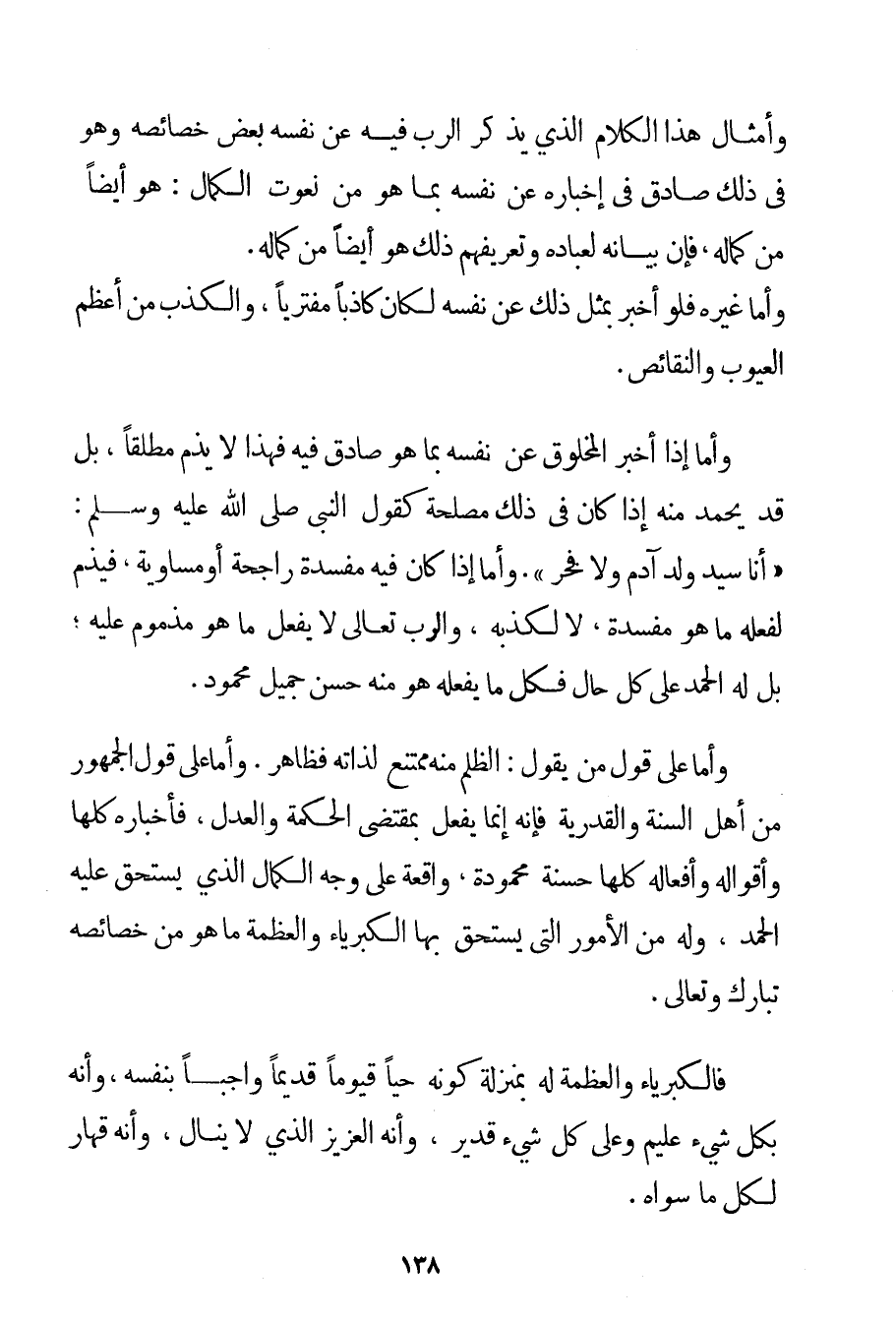 عَلَى اللَّهِ فَهُوَ حَسْبُهُ} وَأَمْثَالُ هَذَا الْكَلَامِ الَّذِي يَذْكُرُ الرَّبُّ فِيهِ عَنْ نَفْسِهِ بَعْضَ خَصَائِصِهِ وَهُوَ فِي ذَلِكَ صَادِقٌ فِي إخْبَارِهِ عَنْ نَفْسِهِ بِمَا هُوَ مِنْ نُعُوتِ الْكَمَالِ: هُوَ أَيْضًا مِنْ كَمَالِهِ فَإِنَّ بَيَانَهُ لِعِبَادِهِ وَتَعْرِيفَهُمْ ذَلِكَ هُوَ أَيْضًا مِنْ كَمَالِهِ. وَأَمَّا غَيْرُهُ فَلَوْ أَخْبَرَ بِمِثْلِ ذَلِكَ عَنْ نَفْسِهِ لَكَانَ كَاذِبًا مُفْتَرِيًا وَالْكَذِبُ مِنْ أَعْظَمِ الْعُيُوبِ وَالنَّقَائِصِ. وَأَمَّا إذَا أَخْبَرَ الْمَخْلُوقُ عَنْ نَفْسِهِ بِمَا هُوَ صَادِقٌ فِيهِ فَهَذَا لَا يُذَمُّ مُطْلَقًا بَلْ قَدْ يُحْمَدُ مِنْهُ إذَا كَانَ فِي ذَلِكَ مَصْلَحَةٌ كَقَوْلِ النَّبِيِّ صَلَّى اللَّهُ عَلَيْهِ وَسَلَّمَ {أَنَا سَيِّدُ وَلَدِ آدَمَ وَلَا فَخْرَ} . وَأَمَّا إذَا كَانَ فِيهِ مَفْسَدَةٌ رَاجِحَةٌ أَوْ مُسَاوِيَةٌ فَيُذَمُّ لِفِعْلِهِ مَا هُوَ مَفْسَدَةٌ لَا لِكَذِبِهِ وَالرَّبُّ تَعَالَى لَا يَفْعَلُ مَا هُوَ مَذْمُومٌ عَلَيْهِ؛ بَلْ لَهُ الْحَمْدُ عَلَى كُلِّ حَالٍ فَكُلُّ مَا يَفْعَلُهُ هُوَ مِنْهُ حَسَنٌ جَمِيلٌ مَحْمُودٌ. وَأَمَّا عَلَى قَوْلِ مَنْ يَقُولُ: الظُّلْمُ مِنْهُ مُمْتَنِعٌ لِذَاتِهِ فَظَاهِرٌ. وَأَمَّا عَلَى قَوْلِ الْجُمْهُورِ مِنْ أَهْلِ السُّنَّةِ وَالْقَدَرِيَّةِ فَإِنَّهُ إنَّمَا يَفْعَلُ بِمُقْتَضَى الْحِكْمَةِ وَالْعَدْلِ فَأَخْبَارُهُ كُلُّهَا وَأَقْوَالُهُ وَأَفْعَالُهُ كُلُّهَا حَسَنَةٌ مَحْمُودَةٌ وَاقِعَةٌ عَلَى وَجْهِ الْكَمَالِ الَّذِي يَسْتَحِقُّ عَلَيْهِ الْحَمْدَ وَلَهُ مِنْ الْأُمُورِ الَّتِي يَسْتَحِقُّ بِهَا الْكِبْرِيَاءَ وَالْعَظَمَةَ مَا هُوَ مِنْ خَصَائِصِهِ تَبَارَكَ وَتَعَالَى. فَالْكِبْرِيَاءُ وَالْعَظَمَةُ لَهُ بِمَنْزِلَةِ كَوْنِهِ حَيًّا قَيُّومًا قَدِيمًا وَاجِبًا بِنَفْسِهِ وَأَنَّهُ بِكُلِّ شَيْءٍ عَلِيمٌ وَعَلَى كُلِّ شَيْءٍ قَدِيرٌ وَأَنَّهُ الْعَزِيزُ الَّذِي لَا يُنَالُ وَأَنَّهُ قَهَّارٌ لِكُلِّ مَا سِوَاهُ.