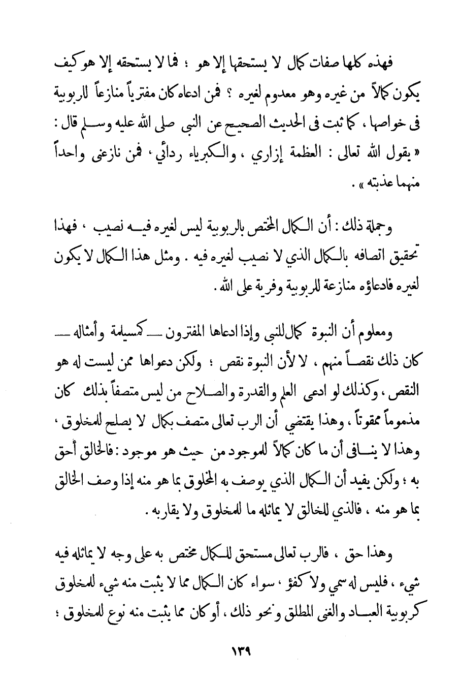 فَهَذِهِ كُلُّهَا صِفَاتُ كَمَالٍ لَا يَسْتَحِقُّهَا إلَّا هُوَ؛ فَمَا لَا يَسْتَحِقُّهُ إلَّا هُوَ كَيْفَ يَكُونُ كَمَالًا مِنْ غَيْرِهِ وَهُوَ مَعْدُومٌ لِغَيْرِهِ؟ فَمَنْ ادَّعَاهُ كَانَ مُفْتَرِيًا مُنَازِعًا لِلرُّبُوبِيَّةِ فِي خَوَاصِّهَا كَمَا ثَبَتَ فِي الْحَدِيثِ الصَّحِيحِ عَنْ النَّبِيِّ صَلَّى اللَّهُ عَلَيْهِ وَسَلَّمَ قَالَ: {يَقُولُ اللَّهُ تَعَالَى: الْعَظَمَةُ إزَارِي وَالْكِبْرِيَاءُ رِدَائِي فَمَنْ نَازَعَنِي وَاحِدًا مِنْهُمَا عَذَّبْته} . وَجُمْلَةُ ذَلِكَ: أَنَّ الْكَمَالَ الْمُخْتَصَّ بِالرُّبُوبِيَّةِ لَيْسَ لِغَيْرِهِ فِيهِ نَصِيبٌ فَهَذَا تَحْقِيقُ اتِّصَافِهِ بِالْكَمَالِ الَّذِي لَا نَصِيبَ لِغَيْرِهِ فِيهِ. وَمِثْلُ هَذَا الْكَمَالِ لَا يَكُونُ لِغَيْرِهِ فَادِّعَاؤُهُ مُنَازَعَةٌ لِلرُّبُوبِيَّةِ وَفِرْيَةٌ عَلَى اللَّهِ. وَمَعْلُومٌ أَنَّ النُّبُوَّةَ كَمَالٌ لِلنَّبِيِّ وَإِذَا ادَّعَاهَا الْمُفْتَرُونَ - كمسيلمة وَأَمْثَالِهِ - كَانَ ذَلِكَ نَقْصًا مِنْهُمْ لَا لِأَنَّ النُّبُوَّةَ نَقْصٌ؛ وَلَكِنَّ دَعْوَاهَا مِمَّنْ لَيْسَتْ لَهُ هُوَ النَّقْصُ وَكَذَلِكَ لَوْ ادَّعَى الْعِلْمَ وَالْقُدْرَةَ وَالصَّلَاحَ مَنْ لَيْسَ مُتَّصِفًا بِذَلِكَ كَانَ مَذْمُومًا مَمْقُوتًا وَهَذَا يَقْتَضِي أَنَّ الرَّبَّ تَعَالَى مُتَّصِفٌ بِكَمَالِ لَا يَصْلُحُ لِلْمَخْلُوقِ وَهَذَا لَا يُنَافِي أَنَّ مَا كَانَ كَمَالًا لِلْمَوْجُودِ مِنْ حَيْثُ هُوَ مَوْجُودٌ: فَالْخَالِقُ أَحَقُّ بِهِ؛ وَلَكِنْ يُفِيدُ أَنَّ الْكَمَالَ الَّذِي يُوصَفُ بِهِ الْمَخْلُوقُ بِمَا هُوَ مِنْهُ إذَا وُصِفَ الْخَالِقُ بِمَا هُوَ مِنْهُ فَاَلَّذِي لِلْخَالِقِ لَا يُمَاثِلُهُ مَا لِلْمَخْلُوقِ وَلَا يُقَارِبُهُ. وَهَذَا حَقٌّ فَالرَّبُّ تَعَالَى مُسْتَحِقٌّ لِلْكَمَالِ مُخْتَصٌّ بِهِ عَلَى وَجْهٍ لَا يُمَاثِلُهُ فِيهِ شَيْءٌ فَلَيْسَ لَهُ سَمِيٌّ وَلَا كُفُؤٌ سَوَاءٌ كَانَ الْكَمَالُ مِمَّا لَا يَثْبُتُ مِنْهُ شَيْءٌ لِلْمَخْلُوقِ كَرُبُوبِيَّةِ الْعِبَادِ وَالْغِنَى الْمُطْلَقِ وَنَحْوِ ذَلِكَ أَوْ كَانَ مِمَّا يَثْبُتُ مِنْهُ نَوْعٌ لِلْمَخْلُوقِ؛