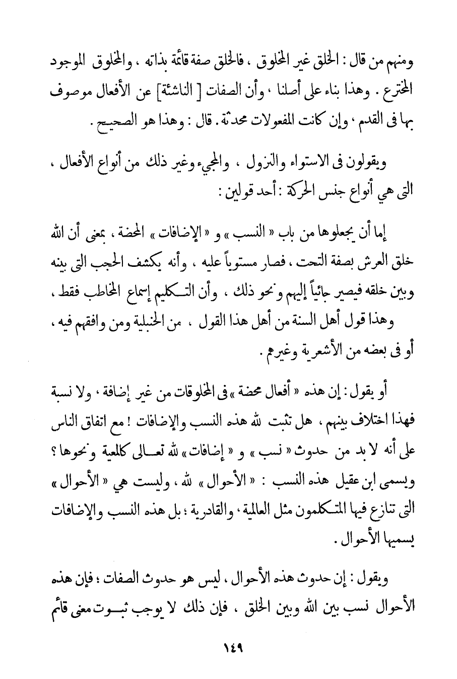 وَمِنْهُمْ مَنْ قَالَ: الْخَلْقُ غَيْرُ الْمَخْلُوقِ] (*) فَالْخَلْقُ صِفَةٌ قَائِمَةٌ بِذَاتِهِ وَالْمَخْلُوقُ الْمَوْجُودُ الْمُخْتَرَعُ. وَهَذَا بِنَاءً عَلَى أَصْلِنَا وَأَنَّ الصِّفَاتِ النَّاشِئَةَ عَنْ الْأَفْعَالِ مَوْصُوفٌ بِهَا فِي الْقِدَمِ وَإِنْ كَانَتْ الْمَفْعُولَاتُ مُحْدَثَةً. قَالَ: وَهَذَا هُوَ الصَّحِيحُ. وَيَقُولُونَ فِي الِاسْتِوَاءِ وَالنُّزُولِ وَالْمَجِيءِ وَغَيْرِ ذَلِكَ مِنْ أَنْوَاعِ الْأَفْعَالِ الَّتِي هِيَ أَنْوَاعُ جِنْسِ الْحَرَكَةِ: أَحَدَ قَوْلَيْنِ: إمَّا أَنْ يَجْعَلُوهَا مِنْ بَابِ " النَّسَبِ " وَ " الْإِضَافَاتِ " الْمَحْضَةِ بِمَعْنَى أَنَّ اللَّهَ خَلَقَ الْعَرْشَ بِصِفَةِ التَّحْتِ فَصَارَ مُسْتَوِيًا عَلَيْهِ وَأَنَّهُ يَكْشِفُ الْحُجُبَ الَّتِي بَيْنَهُ وَبَيْنَ خَلْقِهِ فَيَصِيرُ جَائِيًا إلَيْهِمْ وَنَحْوِ ذَلِكَ وَأَنَّ التَّكْلِيمَ إسْمَاعُ الْمُخَاطَبِ فَقَطْ وَهَذَا قَوْلُ أَهْلِ السُّنَّةِ مِنْ أَهْلِ هَذَا الْقَوْلِ مِنْ الْحَنْبَلِيَّةِ وَمَنْ وَافَقَهُمْ فِيهِ أَوْ فِي بَعْضِهِ مِنْ الْأَشْعَرِيَّةِ وَغَيْرِهِمْ. أَوْ يَقُولُ: إنَّ هَذِهِ " أَفْعَالٌ مَحْضَةٌ " فِي الْمَخْلُوقَاتِ مِنْ غَيْرِ إضَافَةٍ وَلَا نِسْبَةٍ فَهَذَا اخْتِلَافٌ بَيْنَهُمْ هَلْ تَثْبُتُ لِلَّهِ هَذِهِ النِّسَبُ وَالْإِضَافَاتُ مَعَ اتِّفَاقِ النَّاسِ عَلَى أَنَّهُ لَا بُدَّ مِنْ حُدُوثِ " نِسَبٍ " وَ " إضَافَاتٍ " لِلَّهِ تَعَالَى كَالْمَعِيَّةِ وَنَحْوِهَا؟ وَيُسَمِّي ابْنُ عَقِيلٍ هَذِهِ النِّسَبَ: " الْأَحْوَالَ " لِلَّهِ وَلَيْسَتْ هِيَ " الْأَحْوَالُ " الَّتِي تَنَازَعَ فِيهَا الْمُتَكَلِّمُونَ مِثْلَ الْعَالَمِيَّةِ وَالْقَادِرِيَّةِ؛ بَلْ هَذِهِ النِّسَبُ وَالْإِضَافَاتُ يُسَمِّيهَا الْأَحْوَالَ. وَيَقُولُ: إنَّ حُدُوثَ هَذِهِ الْأَحْوَالِ لَيْسَ هُوَ حُدُوثُ الصِّفَاتِ؛ فَإِنَّ هَذِهِ الْأَحْوَالَ نِسَبٌ بَيْنَ اللَّهِ وَبَيْنَ الْخَلْقِ فَإِنَّ ذَلِكَ لَا يُوجِبُ ثُبُوتَ مَعْنًى قَائِمٍ