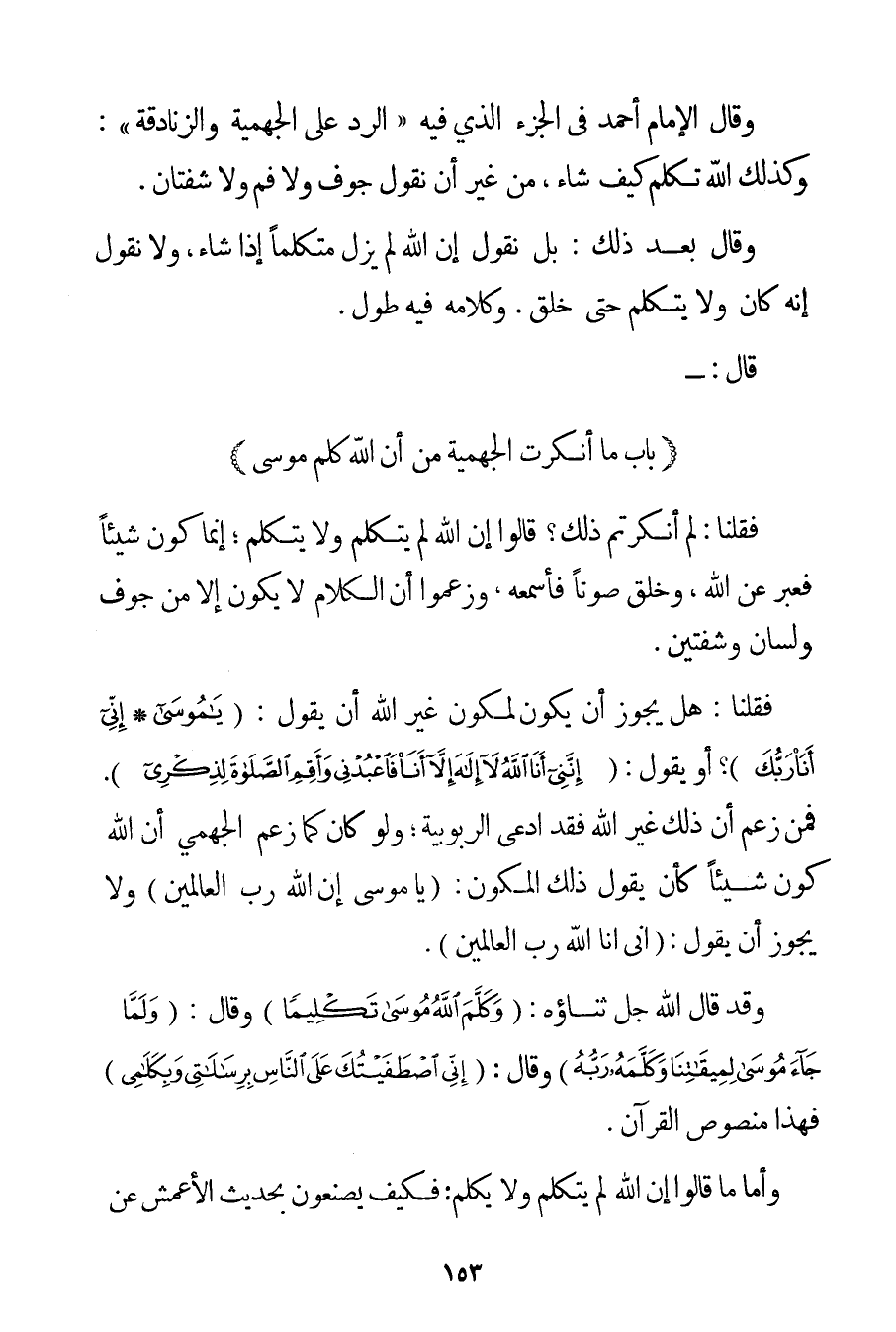 فَقُلْنَا: لِمَ أَنْكَرْتُمْ ذَلِكَ؟ قَالُوا إنَّ اللَّهَ لَمْ يَتَكَلَّمْ وَلَا يَتَكَلَّمُ؛ إنَّمَا كَوَّنَ شَيْئًا فَعَبَّرَ عَنْ اللَّهِ وَخَلَقَ صَوْتًا فَأَسْمَعَهُ وَزَعَمُوا أَنَّ الْكَلَامَ لَا يَكُونُ إلَّا مِنْ جَوْفٍ وَلِسَانٍ وَشَفَتَيْنِ. فَقُلْنَا: هَلْ يَجُوزُ أَنْ يَكُونَ لِمُكَوِّنِ غَيْرِ اللَّهِ أَنْ يَقُولَ: يَا مُوسَى إنِّي أَنَا رَبُّك؟ أَوْ يَقُولَ: {إنَّنِي أَنَا اللَّهُ لَا إلَهَ إلَّا أَنَا فَاعْبُدْنِي وَأَقِمِ الصَّلَاةَ لِذِكْرِي} . فَمَنْ زَعَمَ أَنَّ ذَلِكَ غَيْرُ اللَّهِ فَقَدْ ادَّعَى الرُّبُوبِيَّةَ؛ وَلَوْ كَانَ كَمَا زَعَمَ الجهمي أَنَّ اللَّهَ كَوَّنَ شَيْئًا كَأَنْ يَقُولَ ذَلِكَ الْمُكَوَّنُ: يَا مُوسَى إنَّ اللَّهَ رَبُّ الْعَالَمِينَ وَلَا يَجُوزُ أَنْ يَقُولَ: {إنِّي أَنَا اللَّهُ رَبُّ الْعَالَمِينَ} . وَقَدْ قَالَ اللَّهُ جَلَّ ثَنَاؤُهُ: {وَكَلَّمَ اللَّهُ مُوسَى تَكْلِيمًا} وَقَالَ: {وَلَمَّا جَاءَ مُوسَى لِمِيقَاتِنَا وَكَلَّمَهُ رَبُّهُ} وَقَالَ: {إنِّي اصْطَفَيْتُكَ عَلَى النَّاسِ بِرِسَالَاتِي وَبِكَلَامِي} فَهَذَا مَنْصُوصُ الْقُرْآنِ. وَأَمَّا مَا قَالُوا إنَّ اللَّهَ لَمْ يَتَكَلَّمْ وَلَا يُكَلَّمُ: فَكَيْفَ يَصْنَعُونَ بِحَدِيثِ الْأَعْمَشِ عَنْ