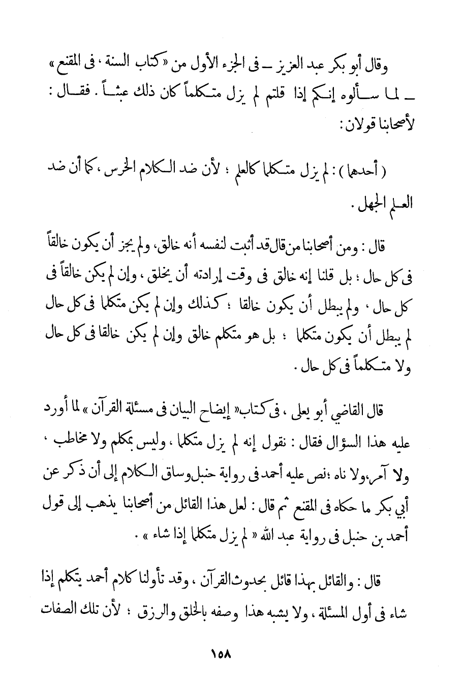 أَحَدُهُمَا: لَمْ يَزَلْ مُتَكَلِّمًا كَالْعِلْمِ؛ لِأَنَّ ضِدَّ الْكَلَامِ الْخَرَسُ كَمَا أَنَّ ضِدَّ الْعِلْمِ الْجَهْلُ. قَالَ: وَمِنْ أَصْحَابِنَا مَنْ قَالَ قَدْ أَثْبَتَ لِنَفْسِهِ أَنَّهُ خَالِقٌ وَلَمْ يَجُزْ أَنْ يَكُونَ خَالِقًا فِي كُلِّ حَالٍ؛ بَلْ قُلْنَا إنَّهُ خَالِقٌ فِي وَقْتِ إرَادَتِهِ أَنْ يَخْلُقَ وَإِنْ لَمْ يَكُنْ خَالِقًا فِي كُلِّ حَالٍ وَلَمْ يَبْطُلْ أَنْ يَكُونَ خَالِقًا؛ كَذَلِكَ وَإِنْ لَمْ يَكُنْ مُتَكَلِّمًا فِي كُلِّ حَالٍ لَمْ يَبْطُلْ أَنْ يَكُونَ مُتَكَلِّمًا؛ بَلْ هُوَ مُتَكَلِّمٌ خَالِقٌ وَإِنْ لَمْ يَكُنْ خَالِقًا فِي كُلِّ حَالٍ وَلَا مُتَكَلِّمًا فِي كُلِّ حَالٍ. قَالَ الْقَاضِي أَبُو يَعْلَى فِي كِتَابِ " إيضَاحِ الْبَيَانِ فِي مَسْأَلَةِ الْقُرْآنِ " لَمَّا أَوْرَدَ عَلَيْهِ هَذَا السُّؤَالَ فَقَالَ: نَقُولُ إنَّهُ لَمْ يَزَلْ مُتَكَلِّمًا وَلَيْسَ بِمُكَلَّمِ وَلَا مُخَاطَبٍ وَلَا آمِرٍ وَلَا نَاهٍ؛ نَصَّ عَلَيْهِ أَحْمَدُ فِي رِوَايَةِ حَنْبَلٍ وَسَاقَ الْكَلَامَ إلَى أَنْ ذَكَرَ عَنْ أَبِي بَكْرٍ مَا حَكَاهُ فِي الْمُقْنِعِ ثُمَّ قَالَ: لَعَلَّ هَذَا الْقَائِلَ مِنْ أَصْحَابِنَا يَذْهَبُ إلَى قَوْلِ أَحْمَدَ بْنِ حَنْبَلٍ فِي رِوَايَةِ عَبْدِ اللَّهِ " لَمْ يَزَلْ مُتَكَلِّمًا إذَا شَاءَ ". قَالَ: وَالْقَائِلُ بِهَذَا قَائِلٌ بِحُدُوثِ الْقُرْآنِ وَقَدْ تَأَوَّلْنَا كَلَامَ أَحْمَدَ يَتَكَلَّمُ إذَا شَاءَ فِي أَوَّلِ الْمَسْأَلَةِ وَلَا يُشْبِهُ هَذَا وَصْفَهُ بِالْخَلْقِ وَالرِّزْقِ؛ لِأَنَّ تِلْكَ الصِّفَاتِ