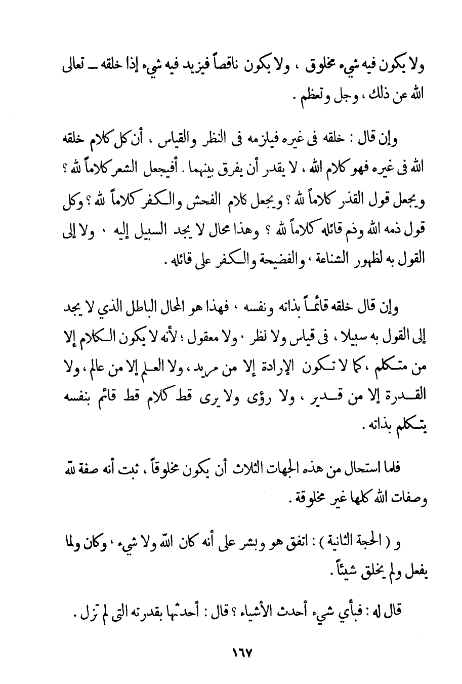 وَلَا يَكُونُ فِيهِ شَيْءٌ مَخْلُوقٌ وَلَا يَكُونُ نَاقِصًا فَيَزِيدُ فِيهِ شَيْءٌ إذَا خَلَقَهُ - تَعَالَى اللَّهُ عَنْ ذَلِكَ وَجَلَّ وَتَعَظَّمَ. وَإِنْ قَالَ: خَلَقَهُ فِي غَيْرِهِ فَيَلْزَمُهُ فِي النَّظَرِ وَالْقِيَاسِ أَنَّ كُلَّ كَلَامٍ خَلَقَهُ اللَّهُ فِي غَيْرِهِ فَهُوَ كَلَامُ اللَّهِ لَا يُقْدَرُ أَنْ يُفَرَّقَ بَيْنَهُمَا. أَفَيُجْعَلُ الشِّعْرُ كَلَامًا لِلَّهِ؟ وَيُجْعَلُ قَوْلُ الْقَذَرِ كَلَامًا لِلَّهِ؟ وَيُجْعَلُ كَلَامُ الْفُحْشِ وَالْكُفْرِ كَلَامًا لِلَّهِ؟ وَكُلُّ قَوْلٍ ذَمَّهُ اللَّهُ وَذَمَّ قَائِلَهُ كَلَامًا لِلَّهِ؟ وَهَذَا مُحَالٌ لَا يَجِدُ السَّبِيلَ إلَيْهِ وَلَا إلَى الْقَوْلِ بِهِ لِظُهُورِ الشَّنَاعَةِ وَالْفَضِيحَةِ وَالْكُفْرِ عَلَى قَائِلِهِ. وَإِنْ قَالَ خَلَقَهُ قَائِمًا بِذَاتِهِ وَنَفَسِهِ فَهَذَا هُوَ الْمُحَالُ الْبَاطِلُ الَّذِي لَا يَجِدُ إلَى الْقَوْلِ بِهِ سَبِيلًا فِي قِيَاسٍ وَلَا نَظَرٍ وَلَا مَعْقُولٍ؛ لِأَنَّهُ لَا يَكُونُ الْكَلَامُ إلَّا مِنْ مُتَكَلِّمٍ كَمَا لَا تَكُونُ الْإِرَادَةُ إلَّا مِنْ مُرِيدٍ وَلَا الْعِلْمُ إلَّا مِنْ عَالِمٍ وَلَا الْقُدْرَةُ إلَّا مِنْ قَدِيرٍ وَلَا رُئِيَ وَلَا يُرَى قَطُّ كَلَامٌ قَطُّ قَائِمٌ بِنَفْسِهِ يَتَكَلَّمُ بِذَاتِهِ. فَلَمَّا اسْتَحَالَ مِنْ هَذِهِ الْجِهَاتِ الثَّلَاثِ أَنْ يَكُونَ مَخْلُوقًا ثَبَتَ أَنَّهُ صِفَةٌ لِلَّهِ وَصِفَاتُ اللَّهِ كُلُّهَا غَيْرُ مَخْلُوقَةٍ. وَ (الْحُجَّةُ الثَّانِيَةُ: اتَّفَقَ هُوَ وَبِشْرٌ عَلَى أَنَّهُ كَانَ اللَّهُ وَلَا شَيْءَ وَكَانَ وَلَمَّا يَفْعَلُ وَلَمْ يَخْلُقْ شَيْئًا. قَالَ لَهُ: فَبِأَيِّ شَيْءٍ أَحْدَثَ الْأَشْيَاءَ؟ قَالَ: أَحْدَثَهَا بِقُدْرَتِهِ الَّتِي لَمْ تَزَلْ.
