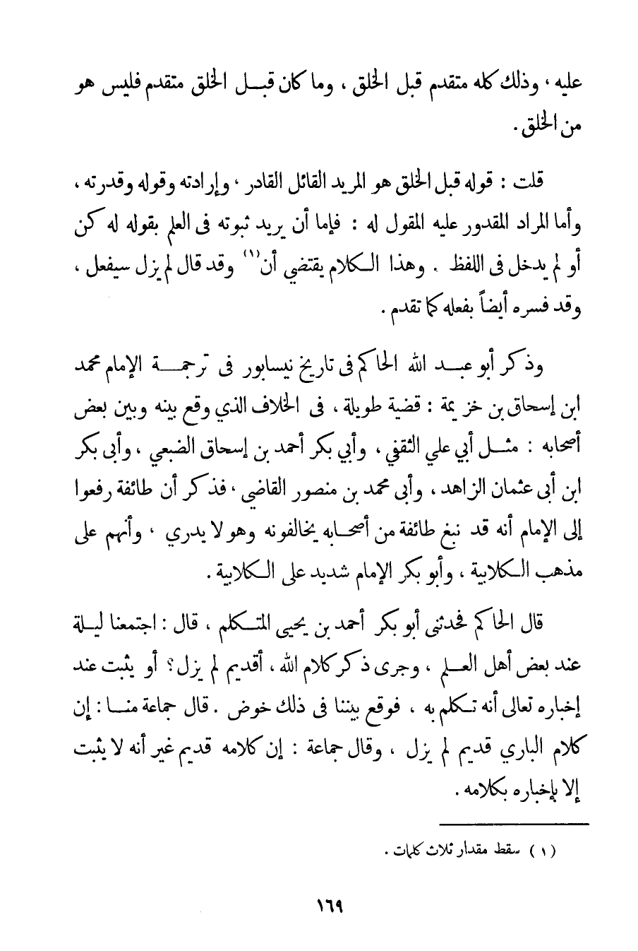 عَلَيْهِ وَذَلِكَ كُلُّهُ مُتَقَدِّمٌ قَبْلَ الْخَالِقِ وَمَا كَانَ قَبْلَ الْخَالِقِ مُتَقَدِّمٌ فَلَيْسَ هُوَ مِنْ الْخَلْقِ. قُلْت: قَوْلُهُ قَبْلَ الْخَلْقِ هُوَ الْمُرِيدُ الْقَائِلُ الْقَادِرُ وَإِرَادَتُهُ وَقَوْلُهُ وَقُدْرَتُهُ وَأَمَّا الْمُرَادُ الْمَقْدُورُ عَلَيْهِ الْمَقُولُ لَهُ: فَإِمَّا أَنْ يُرِيدَ ثُبُوتَهُ فِي الْعِلْمِ بِقَوْلِهِ لَهُ كُنْ أَوْ لَمْ يَدْخُلْ فِي اللَّفْظِ. وَهَذَا الْكَلَامُ يَقْتَضِي أَنْ. . . (1) وَقَدْ قَالَ لَمْ يَزَلْ سَيَفْعَلُ وَقَدْ فَسَّرَهُ أَيْضًا بِفِعْلِهِ كَمَا تَقَدَّمَ. وَذَكَرَ أَبُو عَبْدِ اللَّهِ الْحَاكِمُ فِي تَارِيخِ نَيْسَابُورَ فِي تَرْجَمَةِ الْإِمَامِ مُحَمَّدِ بْنِ إسْحَاقَ بْنِ خُزَيْمَة: قَضِيَّةً طَوِيلَةً فِي الْخِلَافِ الَّذِي وَقَعَ بَيْنَهُ وَبَيْنَ بَعْضِ أَصْحَابِهِ: مِثْلَ أَبِي عَلِيٍّ الثَّقَفِيِّ وَأَبِي بَكْرٍ أَحْمَد بْنِ إسْحَاقَ الضبعي وَأَبِي بَكْرِ بْنِ أَبِي عُثْمَانَ الزَّاهِدِ وَأَبِي مُحَمَّدِ بْنِ مَنْصُورٍ الْقَاضِي فَذَكَرَ أَنَّ طَائِفَةً رَفَعُوا إلَى الْإِمَامِ أَنَّهُ قَدْ نَبَغَ طَائِفَةٌ مِنْ أَصْحَابِهِ يُخَالِفُونَهُ وَهُوَ لَا يَدْرِي وَأَنَّهُمْ عَلَى مَذْهَبِ الْكُلَّابِيَة وَأَبُو بَكْرٍ الْإِمَامُ شَدِيدٌ عَلَى الْكُلَّابِيَة. قَالَ الْحَاكِمُ فَحَدَّثَنِي أَبُو بَكْرٍ أَحْمَد بْنُ يَحْيَى الْمُتَكَلِّمُ قَالَ: اجْتَمَعْنَا لَيْلَةً عِنْدَ بَعْضِ أَهْلِ الْعِلْمِ وَجَرَى ذِكْرُ كَلَامِ اللَّهِ أَقَدِيمٌ لَمْ يَزَلْ؟ أَوْ يَثْبُتُ عِنْدَ إخْبَارِهِ تَعَالَى أَنَّهُ تَكَلَّمَ بِهِ فَوَقَعَ بَيْنَنَا فِي ذَلِكَ خَوْضٌ. قَالَ جَمَاعَةٌ مِنَّا: إنَّ كَلَامَ الْبَارِي قَدِيمٌ لَمْ يَزَلْ وَقَالَ جَمَاعَةٌ: إنَّ كَلَامَهُ قَدِيمٌ غَيْرَ أَنَّهُ لَا يَثْبُتُ إلَّا بِإِخْبَارِهِ بِكَلَامِهِ.