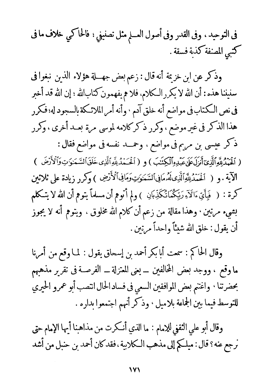 فِي التَّوْحِيدِ وَفِي الْقَدَرِ وَفِي أُصُولِ الْعِلْمِ مِثْلَ تَصْنِيفِي؛ فَالْحَاكِي خِلَافَ مَا فِي كُتُبِي الْمُصَنَّفَةِ كَذَبَةٌ فَسَقَةٌ. وَذَكَرَ عَنْ ابْنِ خُزَيْمَة أَنَّهُ قَالَ: زَعَمَ بَعْضُ جَهَلَةِ هَؤُلَاءِ الَّذِينَ نَبَغُوا فِي سنيننا هَذِهِ: أَنَّ اللَّهَ لَا يُكَرِّرُ الْكَلَامَ فَلَا هُمْ يَفْهَمُونَ كِتَابَ اللَّهِ؛ إنَّ اللَّهَ قَدْ أَخْبَرَ فِي نَصِّ الْكِتَابِ فِي مَوَاضِعَ أَنَّهُ خَلَقَ آدَمَ وَأَنَّهُ أَمَرَ الْمَلَائِكَةَ بِالسُّجُودِ لَهُ؛ فَكَرَّرَ هَذَا الذِّكْرَ فِي غَيْرِ مَوْضِعٍ وَكَرَّرَ ذِكْرَ كَلَامِهِ لِمُوسَى مَرَّةً بَعْدَ أُخْرَى وَكَرَّرَ ذِكْرَ عِيسَى ابْنِ مَرْيَمَ فِي مَوَاضِعَ وَحَمِدَ نَفْسَهُ فِي مَوَاضِعَ فَقَالَ: {الْحَمْدُ لِلَّهِ الَّذِي أَنْزَلَ عَلَى عَبْدِهِ الْكِتَابَ} و {الْحَمْدُ لِلَّهِ الَّذِي خَلَقَ السَّمَاوَاتِ وَالْأَرْضَ} الْآيَةَ. و {الْحَمْدُ لِلَّهِ الَّذِي لَهُ مَا فِي السَّمَاوَاتِ وَمَا فِي الْأَرْضِ} وَكَرَّرَ زِيَادَةً عَلَى ثَلَاثِينَ كَرَّةً: {فَبِأَيِّ آلَاءِ رَبِّكُمَا تُكَذِّبَانِ} وَلَمْ أَتَوَهَّمْ أَنَّ مُسْلِمًا يَتَوَهَّمُ أَنَّ اللَّهَ لَا يَتَكَلَّمُ بِشَيْءِ مَرَّتَيْنِ وَهَذَا مَقَالَةُ مَنْ زَعَمَ أَنَّ كَلَامَ اللَّهِ مَخْلُوقٌ وَيَتَوَهَّمُ أَنَّهُ لَا يَجُوزُ أَنْ يَقُولَ: خَلَقَ اللَّهُ شَيْئًا وَاحِدًا مَرَّتَيْنِ. وَقَالَ الْحَاكِمُ: سَمِعْت أَبَا بَكْرٍ أَحْمَد بْنَ إسْحَاقَ يَقُولُ: لَمَّا وَقَعَ مِنْ أَمْرِنَا مَا وَقَعَ وَوَجَدَ بَعْضُ الْمُخَالِفِينَ - يَعْنِي الْمُعْتَزِلَةَ - الْفُرْصَةَ فِي تَقْرِيرِ مَذْهَبِهِمْ بِحَضْرَتِنَا وَاغْتَنَمَ بَعْضُ الْمُوَافِقِينَ السَّعْيَ فِي فَسَادِ الْحَالِ انْتَصَبَ أَبُو عَمْرٍو الحيري لِلتَّوَسُّطِ فِيمَا بَيْنَ الْجَمَاعَةِ بِلَا مَيْلٍ وَذَكَرَ أَنَّهُمْ اجْتَمَعُوا بِدَارِهِ. وَقَالَ أَبُو عَلِيٍّ الثَّقَفِيُّ لِلْإِمَامِ: مَا الَّذِي أَنْكَرْت مِنْ مَذَاهِبِنَا أَيُّهَا الْإِمَامُ حَتَّى نَرْجِعَ عَنْهُ؟ قَالَ: مَيْلُكُمْ إلَى مَذْهَبِ الْكُلَّابِيَة فَقَدْ كَانَ أَحْمَد بْنُ حَنْبَلٍ مِنْ أَشَدِّ