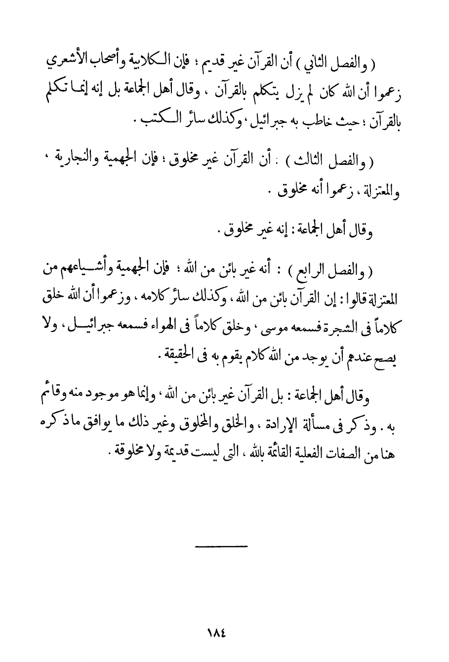 وَالْفَصْلُ الثَّانِي أَنَّ الْقُرْآنَ غَيْرُ قَدِيمٍ؛ فَإِنَّ الْكُلَّابِيَة وَأَصْحَابَ الْأَشْعَرِيِّ زَعَمُوا أَنَّ اللَّهَ كَانَ لَمْ يَزَلْ يَتَكَلَّمُ بِالْقُرْآنِ وَقَالَ أَهْلُ الْجَمَاعَةِ بَلْ إنَّهُ إنَّمَا تَكَلَّمَ بِالْقُرْآنِ؛ حَيْثُ خَاطَبَ بِهِ جبرائيل وَكَذَلِكَ سَائِرُ الْكُتُبِ. (وَالْفَصْلُ الثَّالِثُ: أَنَّ الْقُرْآنَ غَيْرُ مَخْلُوقٍ؛ فَإِنَّ الْجَهْمِيَّة والنجارية وَالْمُعْتَزِلَةَ زَعَمُوا أَنَّهُ مَخْلُوقٌ. وَقَالَ أَهْلُ الْجَمَاعَةِ: إنَّهُ غَيْرُ مَخْلُوقٍ. (وَالْفَصْلُ الرَّابِعُ: أَنَّهُ غَيْرُ بَائِنٍ مِنْ اللَّهِ؛ فَإِنَّ الْجَهْمِيَّة وَأَشْيَاعَهُمْ مِنْ الْمُعْتَزِلَةِ قَالُوا: إنَّ الْقُرْآنَ بَائِنٌ مِنْ اللَّهِ وَكَذَلِكَ سَائِرُ كَلَامِهِ وَزَعَمُوا أَنَّ اللَّهَ خَلَقَ كَلَامًا فِي الشَّجَرَةِ فَسَمِعَهُ مُوسَى وَخَلَقَ كَلَامًا فِي الْهَوَاءِ فَسَمِعَهُ جبرائيل وَلَا يَصِحُّ عِنْدَهُمْ أَنْ يُوجَدَ مِنْ اللَّهِ كَلَامٌ يَقُومُ بِهِ فِي الْحَقِيقَةِ. وَقَالَ أَهْلُ الْجَمَاعَةِ: بَلْ الْقُرْآنُ غَيْرُ بَائِنٍ مِنْ اللَّهِ وَإِنَّمَا هُوَ مَوْجُودٌ مِنْهُ وَقَائِمٌ بِهِ. وَذَكَرَ فِي مَسْأَلَةِ الْإِرَادَةِ وَالْخَلْقِ وَالْمَخْلُوقِ وَغَيْرِ ذَلِكَ مَا يُوَافِقُ مَا ذَكَرَهُ هُنَا مِنْ الصِّفَاتِ الْفِعْلِيَّةِ الْقَائِمَةِ بِاَللَّهِ الَّتِي لَيْسَتْ قَدِيمَةً وَلَا مَخْلُوقَةً.