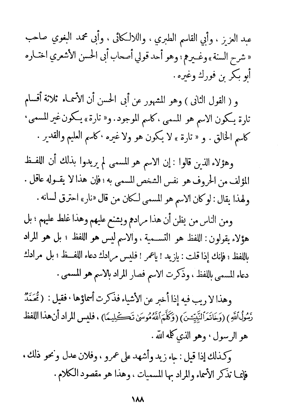عَبْدِ الْعَزِيزِ وَأَبِي الْقَاسِمِ الطبري واللالكائي وَأَبِي مُحَمَّدٍ البغوي صَاحِبِ " شَرْحِ السُّنَّةِ " وَغَيْرِهِمْ؛ وَهُوَ أَحَدُ قَوْلَيْ أَصْحَابِ أَبِي الْحَسَنِ الْأَشْعَرِيِّ اخْتَارَهُ أَبُو بَكْرِ بْنِ فورك وَغَيْرُهُ. وَ (الْقَوْلُ الثَّانِي وَهُوَ الْمَشْهُورُ عَنْ أَبِي الْحَسَنِ أَنَّ الْأَسْمَاءَ ثَلَاثَةُ أَقْسَامٍ تَارَةً يَكُونُ الِاسْمُ هُوَ الْمُسَمَّى كَاسْمِ الْمَوْجُودِ. وَ " تَارَةً " يَكُونُ غَيْرَ الْمُسَمَّى كَاسْمِ الْخَالِقِ. وَ " تَارَةً " لَا يَكُونُ هُوَ وَلَا غَيْرُهُ كَاسْمِ الْعَلِيمِ وَالْقَدِيرِ. وَهَؤُلَاءِ الَّذِينَ قَالُوا: إنَّ الِاسْمَ هُوَ الْمُسَمَّى لَمْ يُرِيدُوا بِذَلِكَ أَنَّ اللَّفْظَ الْمُؤَلَّفَ مِنْ الْحُرُوفِ هُوَ نَفْسُ الشَّخْصِ الْمُسَمَّى بِهِ؛ فَإِنَّ هَذَا لَا يَقُولُهُ عَاقِلٌ. وَلِهَذَا يُقَالُ: لَوْ كَانَ الِاسْمُ هُوَ الْمُسَمَّى لَكَانَ مَنْ قَالَ " نَارٌ " احْتَرَقَ لِسَانُهُ. وَمِنْ النَّاسِ مَنْ يَظُنُّ أَنَّ هَذَا مُرَادُهُمْ وَيُشَنِّعُ عَلَيْهِمْ وَهَذَا غَلَطٌ عَلَيْهِمْ؛ بَلْ هَؤُلَاءِ يَقُولُونَ: اللَّفْظُ هُوَ التَّسْمِيَةُ وَالِاسْمُ لَيْسَ هُوَ اللَّفْظُ؛ بَلْ هُوَ الْمُرَادُ بِاللَّفْظِ؛ فَإِنَّك إذَا قُلْت: يَا زَيْدُ يَا عُمَرُ فَلَيْسَ مُرَادُك دُعَاءَ اللَّفْظِ؛ بَلْ مُرَادُك دُعَاءُ الْمُسَمَّى بِاللَّفْظِ وَذَكَرْت الِاسْمَ فَصَارَ الْمُرَادُ بِالِاسْمِ هُوَ الْمُسَمَّى. وَهَذَا لَا رَيْبَ فِيهِ إذَا أَخْبَرَ عَنْ الْأَشْيَاءِ فَذُكِرَتْ أَسْمَاؤُهَا فَقِيلَ: {مُحَمَّدٌ رَسُولُ اللَّهِ} {وَخَاتَمَ النَّبِيِّينَ} {وَكَلَّمَ اللَّهُ مُوسَى تَكْلِيمًا} فَلَيْسَ الْمُرَادُ أَنَّ هَذَا اللَّفْظَ هُوَ الرَّسُولُ وَهُوَ الَّذِي كَلَّمَهُ اللَّهُ. وَكَذَلِكَ إذَا قيل: جَاءَ زَيْدٌ وَأَشْهَدُ عَلَى عَمْرو وَفُلَانٌ عَدْلٌ وَنَحْوُ ذَلِكَ فَإِنَّمَا تُذْكَرُ الْأَسْمَاءُ وَالْمُرَادُ بِهَا الْمُسَمَّيَاتُ وَهَذَا هُوَ مَقْصُودُ الْكَلَامِ.