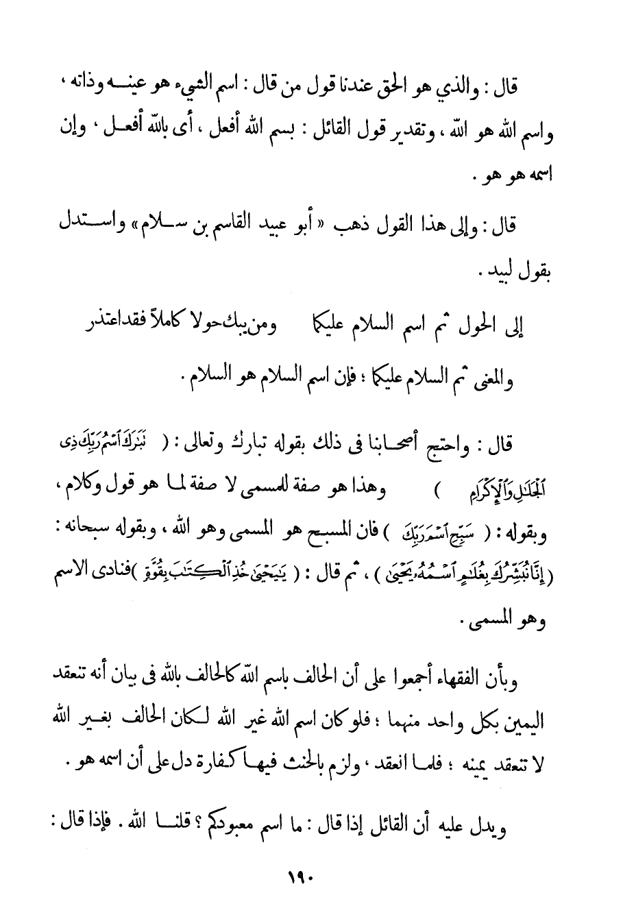قَالَ: وَاَلَّذِي هُوَ الْحَقُّ عِنْدَنَا قَوْلُ مَنْ قَالَ: اسْمُ الشَّيْءِ هُوَ عَيْنُهُ وَذَاتُهُ وَاسْمُ اللَّهِ هُوَ اللَّهُ وَتَقْدِيرُ قَوْلِ الْقَائِلِ: بِسْمِ اللَّهِ أَفْعَلُ أَيْ بِاَللَّهِ أَفْعَلُ وَإِنَّ اسْمَهُ هُوَ هُوَ. قَالَ: وَإِلَى هَذَا الْقَوْلِ ذَهَبَ " أَبُو عُبَيْدٍ الْقَاسِمُ بْنُ سلام " وَاسْتَدَلَّ بِقَوْلِ لَبِيَدِ. إلَى الْحَوْلِ ثُمَّ اسْمُ السَّلَامِ عَلَيْكُمَا وَمَنْ يَبْكِ حَوْلًا كَامِلًا فَقَدْ اعْتَذَرَ وَالْمَعْنَى ثُمَّ السَّلَامُ عَلَيْكُمَا؛ فَإِنَّ اسْمَ السَّلَامِ هُوَ السَّلَامُ. قَالَ: وَاحْتَجَّ أَصْحَابُنَا فِي ذَلِكَ بِقَوْلِهِ تَبَارَكَ وَتَعَالَى: {تَبَارَكَ اسْمُ رَبِّكَ ذِي الْجَلَالِ وَالْإِكْرَامِ} وَهَذَا هُوَ صِفَةٌ لِلْمُسَمَّى لَا صِفَةٌ لِمَا هُوَ قَوْلٌ وَكَلَامٌ وَبِقَوْلِهِ: {سَبِّحِ اسْمَ رَبِّكَ} فَإِنَّ الْمُسَبَّحَ هُوَ الْمُسَمَّى وَهُوَ اللَّهُ وَبِقَوْلِهِ سُبْحَانَهُ: {إنَّا نُبَشِّرُكَ بِغُلَامٍ اسْمُهُ يَحْيَى} ثُمَّ قَالَ: {يَا يَحْيَى خُذِ الْكِتَابَ بِقُوَّةٍ} فَنَادَى الِاسْمَ وَهُوَ الْمُسَمَّى. وَبِأَنَّ الْفُقَهَاءَ أَجْمَعُوا عَلَى أَنَّ الْحَالِفَ بِاسْمِ اللَّهِ كَالْحَالِفِ بِاَللَّهِ فِي بَيَانِ أَنَّهُ تَنْعَقِدُ الْيَمِينُ بِكُلِّ وَاحِدٍ مِنْهُمَا؛ فَلَوْ كَانَ اسْمُ اللَّهِ غَيْرَ اللَّهِ لَكَانَ الْحَالِفُ بِغَيْرِ اللَّهِ لَا تَنْعَقِدُ يَمِينُهُ؛ فَلَمَّا انْعَقَدَ وَلَزِمَ بِالْحِنْثِ فِيهَا كَفَّارَةٌ دَلَّ عَلَى أَنَّ اسْمَهُ هُوَ. وَيَدُلُّ عَلَيْهِ أَنَّ الْقَائِلَ إذَا قَالَ: مَا اسْمُ مَعْبُودِكُمْ؟ قُلْنَا اللَّهُ. فَإِذَا قَالَ: